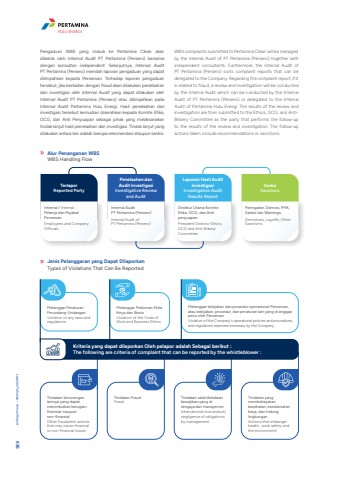 Pengaduan WBS yang masuk ke Pertamina Clean akan dikelola oleh Internal Audit PT Pertamina (Persero) bersama dengan konsultan independent. Selanjutnya, Internal Audit PT Pertamina (Persero) memilah laporan pengaduan yang dapat dilimpahkan kepada Perseroan. Terhadap laporan pengaduan tersebut, jika berkaitan dengan fraud akan dilakukan penelaahan dan investigasi oleh Internal Audit yang dapat dilakukan oleh Internal Audit PT Pertamina (Persero) atau dilimpahkan pada Internal Audit Pertamina Hulu Energi. Hasil penelaahan dan investigasi tersebut kemudian diserahkan kepada Komite Etika, GCG, dan Anti Penyuapan sebagai pihak yang melaksanakan tindak lanjut hasil penelaahan dan investigasi. Tindak lanjut yang dilakukan antara lain adalah berupa rekomendasi ataupun sanksi. WBS complaints submitted to Pertamina Clean will be managed by the Internal Audit of PT Pertamina (Persero) together with independent consultants. Furthermore, the Internal Audit of PT Pertamina (Persero) sorts complaint reports that can be delegated to the Company. Regarding the complaint report, if it is related to fraud, a review and investigation will be conducted by the Internal Audit which can be conducted by the Internal Audit of PT Pertamina (Persero) or delegated to the Internal Audit of Pertamina Hulu Energi. The results of the review and investigation are then submitted to the Ethics, GCG, and AntiBribery Committee as the party that performs the follow-up to the results of the review and investigation. The follow-up actions taken include recommendations or sanctions.Alur Penanganan WBSWBS Handling FlowPenelaahan dan Audit InvestigasiInvestigative Review and AuditInternal Audit PT Pertamina (Persero)Internal Audit of PT Pertamina (Persero)TerlaporReported PartyInternal / Internal : Pekerja dan Pejabat Perseroan Employees and Company OfficialsLaporan Hasil Audit InvestigasiInvestigative Audit Results ReportDirektur Utama Komite Etika, GCG, dan Anti penyuapanPresident Director Ethics, GCG and Anti Bribery CommitteeSanksiSanctionsPeringatan, Demosi, PHK, Sanksi lain Warnings.Demotions, Layoffs, Other SanctionsJenis Pelanggaran yang Dapat DilaporkanTypes of Violations That Can Be ReportedMelanggar Peraturan Perundang-UndanganViolation of any laws and regulationsTindakan kecurangan lainnya yang dapat menimbulkan kerugian finansial maupun non-finansialOther fraudulent actions that may cause financial or non-financial lossesTindakan FraudFraudTindakan salah/kelalaian kewajiban yang di sengaja dari manajemen.International misconduct/negligence of obligations by managementTindakan yang membahayakan kesehatan, keselamatan kerja, dan lindung lingkunganActions that endanger health , work safety and the environmentMelanggar Pedoman Etika Kerja dan BisnisViolation of the Code of Work and Business EthicsMelanggar kebijakan dan prosedur operasional Perseroan, atau kebijakan, prosedur, dan peraturan lain yang di anggap perlu oleh PerseroanViolation of the Company's operational policies and procedures, and regulations deemed necessary by the CompanyKriteria yang dapat dilaporkan Oleh pelapor adalah Sebagai berikut :The following are criteria of complaint that can be reported by the whistleblower :Laporan Tahunan %u2022 Annual Report 636HULU ENERGI