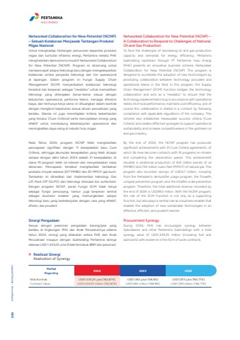 Networked Collaboration for New Potential (NCNP) %u2013 Sebuah Kolaborasi Menjawab Tantangan Produksi Migas NasionalUntuk menghadapi tantangan penurunan kapasitas produksi migas dan tuntutan efisiensi energi, Pertamina melalui PHE menghadirkan skema bisnis inovatif Networked Collaboration for New Potential (NCNP). Program ini dirancang untuk mempercepat adopsi teknologi baru dengan mengedepankan kolaborasi antara penyedia teknologi dan tim operasional di lapangan. Dalam program ini Fungsi Supply Chain Management (SCM) menjembatani kolaborasi teknologi tersebut dan berperan sebagai %u201dmediator%u201d untuk memastikan teknologi yang diterapkan benar-benar sesuai dengan kebutuhan operasional, performa teknis, menjaga efisiensi biaya, dan tentunya kerja sama ini dituangkan dalam kontrak dengan mengikuti kepatuhan sesuai aturan perusahaan yang berlaku. Skema ini juga menetapkan kriteria keberhasilan yang terukur (Cure Criteria) serta menciptakan sinergi yang efektif untuk mendukung keberlanjutan operasional dan meningkatkan daya saing di industri hulu migas.Pada Tahun 2024, program NCNP telah menghasilkan pencapaian signifikan dengan 11 kesepakatan baru Cure Criteria, sehingga akumulasi kesepakatan yang telah dicapai sampai dengan akhir tahun 2024 adalah 31 kesepakatan, di mana 19 program telah on-stream dan menyelesaikan masa observasi. Pencapaian tersebut menghasilkan tambahan produksi minyak sebesar 207 MMBO dan 20 MMCF gas bumi. Tambahan ini dihasilkan dari implementasi teknologi Gas Lift Pack Off (GLPO) dan teknologi stimulasi bio surfactant. Dengan program NCNP, peran Fungsi SCM tidak hanya sebagai fungsi penunjang, namun juga berperan sentral sebagai business enabler yang memungkinkan adopsi teknologi baru yang berkelanjutan dengan cara yang efektif, efisien, dan prudent. Sinergi PengadaanSesuai dengan pedoman pengadaan barang/jasa yang berlaku di lingkungan PHE dan Anak Perusahannya selama tahun 2024, sinergi yang dilakukan antara PHE dan Anak Perusahaan maupun dengan Subholding Pertamina lainnya sebesar USD 1.433,25 Juta (tidak termasuk BBM dan pelumas).Realisasi SinergiRealization of SynergyPerihalRegarding 2024 2023 2022Nilai KontrakContract ValueUSD1.433,25 juta (162,87%)USD1,433.25 million (162.87%)USD1.365 juta (168,8%)USD1,365 million (168.8%)USD1.293 juta (184,71%)USD1,293 million (184.71%)Networked Collaboration for New Potential (NCNP) %u2013 A Collaboration to Respond to Challenges of National Oil and Gas ProductionTo face the challenges of decreasing oil and gas production capacity and demands for energy efficiency, Pertamina Subholding Upstream through PT Pertamina Hulu Energi (PHE) presents an innovative business scheme, Networked Collaboration for New Potential (NCNP). This program is designed to accelerate the adoption of new technologies by prioritizing collaboration between technology providers and operational teams in the field. In this program, the Supply Chain Management (SCM) Function bridges the technology collaboration and acts as a \technology implemented is truly in accordance with operational needs, technical performance, maintains cost efficiency, and of course this collaboration is stated in a contract by following compliance with applicable regulations of the company. This scheme also establishes measurable success criteria (Cure Criteria) and creates effective synergies to support operational sustainability and increase competitiveness in the upstream oil and gas industry.By the end of 2024, the NCNP program has produced significant achievements with 31 Cure Criteria agreements, of which 26 have become contracts with 19 programs on-stream and completing the observation period. This achievement resulted in additional production of 432 million barrels of oil (MMBO) and 724 million cubic feet (MMCF) of natural gas. This program also recorded savings of USD4.7 million, including from the Pertadem%u2019s demulsifier usage program, the Flowell%u2019s congeal prevention program, and the InSafe%u2019s scale prevention program. Therefore, the total additional revenue recorded by the end of 2024 is USD39.2 million. With the NCNP program, the role of the SCM Function is not only as a supporting function, but also plays a central role as a business enabler that enables the adoption of new sustainable technologies in an effective, efficient, and prudent manner.Procurement SynergyDuring 2024, PHE has encouraged synergy between Subsidiaries and other Pertamina Subholdings with a total synergy value of USD1,433.25 million (including fuel and lubricants) with evidence in the form of work contracts.Laporan Tahunan %u2022 Annual Report 640HULU ENERGI