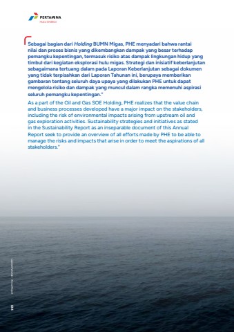 Sebagai bagian dari Holding BUMN Migas, PHE menyadari bahwa rantai nilai dan proses bisnis yang dikembangkan dampak yang besar terhadap pemangku kepentingan, termasuk risiko atas dampak lingkungan hidup yang timbul dari kegiatan eksplorasi hulu migas. Strategi dan inisiatif keberlanjutan sebagaimana tertuang dalam pada Laporan Keberlanjutan sebagai dokumen yang tidak terpisahkan dari Laporan Tahunan ini, berupaya memberikan gambaran tentang seluruh daya upaya yang dilakukan PHE untuk dapat mengelola risiko dan dampak yang muncul dalam rangka memenuhi aspirasi seluruh pemangku kepentingan.%u201dAs a part of the Oil and Gas SOE Holding, PHE realizes that the value chain and business processes developed have a major impact on the stakeholders, including the risk of environmental impacts arising from upstream oil and gas exploration activities. Sustainability strategies and initiatives as stated in the Sustainability Report as an inseparable document of this Annual Report seek to provide an overview of all efforts made by PHE to be able to manage the risks and impacts that arise in order to meet the aspirations of all stakeholders.\HULU ENERGILaporan Tahunan %u2022 Annual Report 644
