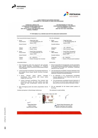 Laporan Tahunan %u2022 Annual Report 650HULU ENERGI' I PERTAMINAHULU ENERGI SURAT PERNYATAAN DIREKSI TENTANG/ STATEMENT OF THE BOARD OF DIRECTORS REGARDING TANGGUNG JAWAB ATAS LAPORAN KEUANGAN KONSOLIDASIAN TANGGAL 31 DESEMBER 2024 DAN UNTUK TAHUN YANG BERAKHIR PADA TANGGAL TERSEBUT THE RESPONSIBILITY FOR THE CONSOL/DA TED FINANCIAL STATEMENTS AS OF DECEMBER 31, 2024 AND FOR THE YEAR THEN ENDED PT PERTAMINA HULU ENERGI DAN ENTITAS ANAK/AND SUBSIDIARIES Kami yang bertanda tang an di bawah ini: 1. Nama Alamat Kantor Alamat Domisili Telepon Jabatan 2. Nama Ala mat Kantor Alamat Domisili Telepon Jabatan Chalid Said Salim JI. TB Simatupang Kav. 99 Jakarta 12520 021-29547011 Direktur Utama Dannif Utojo Danusaputro JI. TB Simatupang Kav. 99 Jakarta 12520 021 -29547014 Direktur Keuangan dan lnvestasi menyatakan bahwa: 1. Kami bertanggung jawab alas penyusunan dan penyajian wajar laporan keuangan konsolidasian PT Pertamina Hulu Energi dan Entitas Anak (secara kolektif disebut sebagai \2. Laporan keuangan konsolidasian Grup terlampir telah disusun dan disajikan sesuai dengan Standar Akuntansi Keuangan Indonesia; 3. a. Semua informasi dalam konsolidasian Grup terlampir lengkap dan benar; dan laporan keuangan telah dimuat secara b. Laporan keuangan konsolidasian Grup terlampir lidak mengandung informasi atau fakta material yang tidak benar, dan tidak menghilangkan informasi atau fakta material; 4. Kami bertanggung jawab alas sistem pengendalian internal Grup. Demikian pernyataan ini dibuat dengan sebenarnya. We, the undersigned: 1. Name Office Address Domicile Address Telephone Position Cha/id Said Salim JI. TB Simatupang Kav. 99Jakarta 12520 021 - 29547011 Chief Executive Officer 2. Name Office Address Domicile Address Telephone Position Dannif Utojo Danusaputro JI. TB Simatupang K av. 99 Jakarta 12520 021 - 29547014 Director of Finance and Investment declare that: 1. We are responsible for the preparation and fair presentation of the accompanying consolidated financial statements ofPT Pertamina Hutu Energi and Subsidiaries (collectively referred to as the \2. The accompanying consolidated financial statements of theGroup have been prepared and presented in accordance with Indonesian Financial Accounting Standards; 3. a. All information in the accompanying consolidatedfinancial statements of the Group has been fully and correctly disclosed; and b. The accompanying consolidated financial statements ofthe Group do not contain false material information orfacts and do not omit any material information or facts; 4. We are responsible for the internal control systems of the Group. This statement is made truthfully. Jakarta, 28 Maret 2025 I March 28, 2025 Chalid Said Salim Direktur Utama/ Chief Executive Officer l%ufffd )tgj t,L 2G ,1 METE TEM OE6ALX331280674 Dannif Utojo Danusaputro C::,-. ,f oirektur Keuangan dan lnvestasi/ Director of Finance and Investment