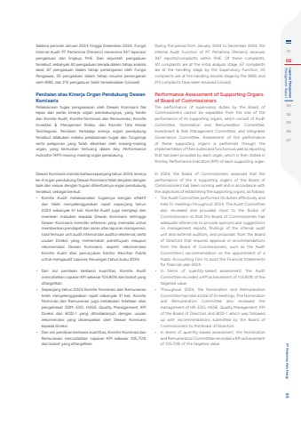 Selama periode Januari 2024 hingga Desember 2024, Fungsi Internal Audit PT Pertamina (Persero) menerima 347 laporan/pengaduan dari lingkup PHE. Dari sejumlah pengaduan tersebut, sebanyak 40 pengaduan berada dalam tahap analisis awal, 67 pengaduan dalam tahap penanganan oleh Fungsi Pengawas, 25 pengaduan dalam tahap resume penanganan oleh WBS, dan 215 pengaduan telah terselesaikan (closed).Penilaian atas Kinerja Organ Pendukung Dewan KomisarisPelaksanaan tugas pengawasan oleh Dewan Komisaris tak lepas dari peran kinerja organ pendukungnya, yang terdiri dari Komite Audit, Komite Nominasi dan Remunerasi, Komite Investasi & Manajemen Risiko, dan Komite Tata Kelola Terintegrasi. Penilaian terhadap kinerja organ pendukung tersebut dilakukan melalui pelaksanaan tugas dan fungsinya serta pelaporan yang telah diberikan oleh masing-masing organ, yang kemudian tertuang dalam Key Performance Indicator (KPI) masing-masing organ pendukung.Dewan Komisaris menilai bahwa sepanjang tahun 2024, kinerja ke-4 organ pendukung Dewan Komisaris telah berjalan dengan baik dan sesuai dengan tujuan dibentuknya organ pendukung tersebut, sebagai berikut:%u2022 Komite Audit melaksanakan tugasnya dengan efektif dan telah menyelenggarakan rapat sepanjang tahun 2024 sebanyak 51 kali. Komite Audit juga mengkaji dan memberi masukan kepada Dewan Komisaris sehingga Dewan Komisaris memiliki referensi yang memadai untuk memberikan pendapat dan saran atas laporan manajemen, hasil temuan unit audit internal dan auditor eksternal, serta usulan Direksi yang memerlukan persetujuan maupun rekomendasi Dewan Komisaris, seperti rekomendasi Komite Audit atas penunjukan Kantor Akuntan Publik untuk mengaudit Laporan Keuangan tahun buku 2024.%u2022 Dari sisi penilaian berbasis kuantitas, Komite Audit mencatatkan capaian KPI sebesar 105,80% dari bobot yang ditargetkan.%u2022 Sepanjang tahun 2024 Komite Nominasi dan Remunerasi telah menyelenggarakan rapat sebanyak 31 kali. Komite Nominasi dan Remunerasi juga melakukan telahaan atas pengelolaan SDM, ESG, HSSE, Quality Management, KPI Direksi dan BOD-1 yang ditindaklanjuti dengan usulan rekomendasi yang disampaikan oleh Dewan Komisaris kepada Direksi.%u2022 Dari sisi penilaian berbasis kuantitas, Komite Nominasi dan Remunerasi mencatatkan capaian KPI sebesar 105,70% dari bobot yang ditargetkan.During the period from January 2024 to December 2024, the Internal Audit Function of PT Pertamina (Persero) received 347 reports/complaints within PHE. Of these complaints, 40 complaints are at the initial analysis stage, 67 complaints are at the handling stage by the Supervisory Function, 25 complaints are at the handling resume stage by the WBS, and 215 complaints have been resolved (closed).Performance Assessment of Supporting Organs of Board of CommissionersThe performance of supervisory duties by the Board of Commissioners cannot be separated from the role of the performance of its supporting organs, which consist of Audit Committee, Nomination and Remuneration Committee, Investment & Risk Management Committee, and Integrated Governance Committee. Assessment of the performance of these supporting organs is performed through the implementation of their duties and functions as well as reporting that has been provided by each organ, which is then stated in the Key Performance Indicators (KPI) of each supporting organ.In 2024, the Board of Commissioners assessed that the performance of the 4 supporting organs of the Board of Commissioners had been running well and in accordance with the objectives of establishing the supporting organs, as follows:%u2022 The Audit Committee performed its duties effectively and held 51 meetings throughout 2024. The Audit Committee also reviewed and provided input to the Board of Commissioners so that the Board of Commissioners had adequate references to provide opinions and suggestions on management reports, findings of the internal audit unit and external auditors, and proposals from the Board of Directors that required approval or recommendations from the Board of Commissioners, such as the Audit Committee's recommendation on the appointment of a Public Accounting Firm to audit the Financial Statements for financial year 2024.%u2022 In terms of quantity-based assessment, the Audit Committee recorded a KPI achievement of 105.80% of the targeted value.%u2022 Throughout 2024, the Nomination and Remuneration Committee has held a total of 31 meetings. The Nomination and Remuneration Committee also reviewed the management of HR, ESG, HSSE, Quality Management, KPI of the Board of Directors and BOD-1 which was followed up with recommendations submitted by the Board of Commissioners to the Board of Directors.%u2022 In terms of quantity-based assessment, the Nomination and Remuneration Committee recorded a KPI achievement of 105.70% of the targeted value.0102 Management Report Laporan Manajemen0304050607Laporan Tahunan %u2022 Annual Report 64PT Pertamina Hulu Energi 65