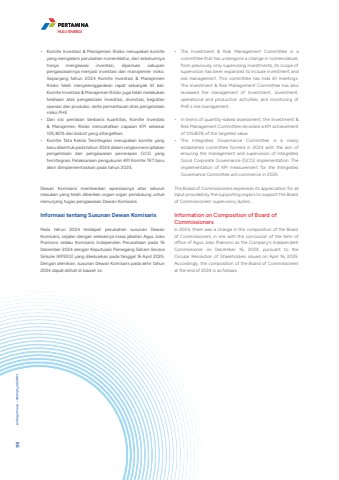 %u2022 Komite Investasi & Manajemen Risiko merupakan komite yang mengalami perubahan nomenklatur, dari sebelumnya hanya mengawasi investasi, diperluas cakupan pengawasannya menjadi investasi dan manajemen risiko. Sepanjang tahun 2024 Komite Investasi & Manajemen Risiko telah menyelenggarakan rapat sebanyak 61 kali. Komite Investasi & Manajemen Risiko juga telah melakukan telahaan atas pengelolaan Investasi, divestasi, kegiatan operasi dan produksi, serta pemantauan atas pengelolaan risiko PHE.%u2022 Dari sisi penilaian berbasis kuantitas, Komite Investasi & Manajemen Risiko mencatatkan capaian KPI sebesar 105,80% dari bobot yang ditargetkan.%u2022 Komite Tata Kelola Terintegrasi merupakan komite yang baru dibentuk pada tahun 2024 dalam rangka menciptakan pengelolaan dan pengawasan penerapan GCG yang terintegrasi. Pelaksanaan pengukuran KPI Komite TKT baru akan diimplementasikan pada tahun 2025.Dewan Komisaris memberikan apresiasinya atas seluruh masukan yang telah diberikan organ-organ pendukung untuk menunjang tugas pengawasan Dewan Komisaris.Informasi tentang Susunan Dewan KomisarisPada tahun 2024 terdapat perubahan susunan Dewan Komisaris, sejalan dengan selesainya masa jabatan Agus Joko Pramono selaku Komisaris Independen Perusahaan pada 16 Desember 2024 dengan Keputusan Pemegang Saham Secara Sirkuler (KPSSS) yang dikeluarkan pada tanggal 16 April 2025. Dengan demikian, susunan Dewan Komisaris pada akhir tahun 2024 dapat dilihat di bawah ini.%u2022 The Investment & Risk Management Committee is a committee that has undergone a change in nomenclature, from previously only supervising investments, its scope of supervision has been expanded to include investment and risk management. This committee has held 61 meetings. The Investment & Risk Management Committee has also reviewed the management of Investment, divestment, operational and production activities, and monitoring of PHE's risk management.%u2022 In terms of quantity-based assessment, the Investment & Risk Management Committee recorded a KPI achievement of 105.80% of the targeted value.%u2022 The Integrated Governance Committee is a newly established committee formed in 2024 with the aim of ensuring the management and supervision of integrated Good Corporate Governance (GCG) implementation. The implementation of KPI measurement for the Integrated Governance Committee will commence in 2025.The Board of Commissioners expresses its appreciation for all input provided by the supporting organs to support the Board of Commissioners' supervisory duties.Information on Composition of Board of CommissionersIn 2024, there was a change in the composition of the Board of Commissioners, in line with the conclusion of the term of office of Agus Joko Pramono as the Company's Independent Commissioner on December 16, 2024, pursuant to the Circular Resolution of Shareholders issued on April 16, 2025. Accordingly, the composition of the Board of Commissioners at the end of 2024 is as follows.HULU ENERGILaporan Tahunan %u2022 Annual Report 66PT Pertamina Hulu Energi 67