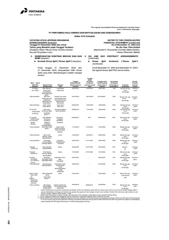 Laporan Tahunan %u2022 Annual Report 682HULU ENERGIThe original consolidated financial statement included hereinare in Indonesian language.PT PERTAMINA HULU ENERGI DAN ENTITAS ANAK/AND SUBSIDIARIESDaftar 5/18 ScheduleCATATAN ATAS LAPORAN KEUANGANKONSOLIDASIAN (lanjutan)Tanggal 31 Desember 2024 dan untukTahun yang Berakhir pada Tanggal Tersebut(Disajikan dalam Ribuan Dolar Amerika Serikat,Kecuali Dinyatakan Lain)NOTES TO THE CONSOLIDATEDFINANCIAL STATEMENT (continued)As of December 31, 2024 andfor the Year Then Ended(Expressed in Thousands of United States Dollars,Unless Otherwise Stated)2. KESEPAKATAN KONTRAK MINYAK DAN GASBUMI (lanjutan)2. OIL AND GAS CONTRACT ARRANGEMENTS(continued)b. Kontrak Gross Split (%u201cGross Split%u201d) (lanjutan) b. Gross Split Contracts (%u201cGross Split%u201d)(continued)Pada tanggal 31 Desember 2024 dan31 Desember 2023, kesepakatan KBH GrossSplit yang telah ditandatangani adalah sebagaiberikut:As at December 31, 2024 and December 31, 2023,the signed Gross Split PSC are as folloMitra UsahaKBH/PSCPartnersWilayah Kerja/Working AreaWilayah/AreaTanggalEfektif Kontrak/Effective Date ofContractTanggalMulaiProduksi/ProductionCommencementDateTanggal JatuhTempo Kontrak/Expiry Date ofContractPersentasePartisipasi/Percentage ofParticipationProduksi/ProductionPeriodeKontrak/ContractPeriodPT MigasHulu JabarBlok OffshoreNorth WestJava/OffshoreNorth West JavaBlock**Jawa Barat/West Java19/01/2017 27/08/1971 18/01/2037 90% Minyak dan gasbumi/Oil and gas20 tahun/yearsTidak ada/None Blok EastKalimantan danAttaka/EastKalimantan andAttaka Block*Daratan dan LepasPantai KalimantanTimur/Onshore andOffshore EastKalimantan 25/10/2018 25/10/2018 24/10/2038** 100% Minyak dan gasbumi/Oil and gas20 tahun/yearsTidak ada/None Blok Tuban/Tuban Block**Jawa Timur/East Java20/05/2018 12/02/1997 19/05/2038 100% Minyak dan gasbumi/Oil and gas20 tahun/yearsPT SumselEnergi OganKomeringBlok OganKomering/ OganKomeringBlock****Sumatera Selatan/South Sumatera20/05/2018 11/07/1991 19/05/2038 100% Minyak dan gasbumi/Oil and gas20 tahun/yearsPT JakartaOSES EnergiPT LampungEnergiBerjayaBlok OffshoreSoutheastSumatera/OffshoreSoutheastSumatera Block**SumateraTenggara/SoutheastSumatera 06/09/2018 1975 05/09/2038 90% Minyak dan gasbumi/Oil and gas20 tahun/ yearsTidak ada/None Blok NSO/ NSOBlock**Lepas PantaiUtara Sumatera/North SumateraOffshore 17/10/2018 01/10/2015 16/10/2038 100% Minyak dan gasbumi/Oil and gas20 tahun/ yearsTidak ada/None Blok JambiMerang/ JambiMerang Block**Jambi 10/02/2019 22/02/2011 09/02/2039 100% Minyak dan gasbumi/Oil and gas 20 tahun/yearsTidak ada/None Blok RajaPendopo/RajaPendopo Block**SumateraSelatan/SouthSumatera 06/07/2019 21/11/1992 05/07/2039 100% Minyak dan gasbumi/Oil and gas20 tahun/yearsPetrogas(Island) Ltd.Blok Salawati/Salawati BlockPapua 23/04/2020 21/01/1993 22/04/2040 30% Minyak /Oil20 tahun/yearsPetrogas(Basin) Ltd.Blok KepalaBurung/ KepalaBurung BlockPapua 15/10/2020 07/10/1996 14/10/2040 30% Minyak dan gasbumi/Oil and gas20 tahun/yearsEni EastSepingganLtd. NeptuneEnergyBlok EastSepinggan/ EastSepinggan BlockSepinggan Timur/EastSepinggan 20/07/2012 - 20/07/2042 15% Minyak dan gasbumi/Oil and gas30 tahun/ yearsTidak ada/None Blok Maratua/Maratua Block**Kalimantan Utara& KalimantanTimur/North Kalimantan& EastKalimantan28/02/2019 - 27/02/2049 100% Minyak dan gasbumi/Oil and gas20 tahun/yearsMoeco SouthEast JambiBVRepsolExplorationSouth EastJambi BvBlok South EastJambi/South EastBlock***Jambi 17/07/2018 - 16/07/2048 27% Minyak dan gasbumi/Oil andgas30 tahun/yearsTidak ada/None Blok SangaSanga/SangaSanga Block**Daratan KalimantanTimur/Onshore EastKalimantan08/08/2018 08/08/2018 07/08/2038 100% Minyak dan gasbumi/Oil and gas20 tahun/years* Menteri ESDM telah memberikan persetujuan perubahan bentuk dan ketentuan pokok KKS dari skema gross split ke cost recovery dengan tanggal efektif 1Januari 2025/Minister of Energy and Mineral has granted the approval to the changes of terms and condition Corridor PSC from gross split scheme to costrecovery scheme, effective since January 1, 2025.** Entitas Anak Perusahaan ini adalah operator atas blok-blok ini/The Company%u2019s Subsidiaries are the operators of these blocks.*** Farm in agreement efektif pada tanggal 26 Februari 2020/Farm in agreement effective date on February 26, 2020.**** Menteri ESDM melalui Keputusan MESDM tanggal 26 November 2024 telah memberikan persetujuan pengalihan partisipasi interes dari PHE Ogan Komering kepadaPT Sumsel Energi Ogan Komering/Minister of Energy and Mineral Resources through Decree dated November,26 2024 has granted the approval of participatinginterest transfer from PHE Ogan Komering to PT Sumsel Energi Ogan Komering.