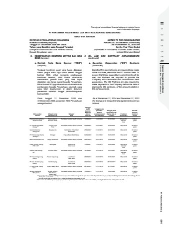 01020304050607 Consolidated Financial Statements Laporan Keaungan Konsolidasian PT Pertamina Hulu Energi 691The original consolidated financial statement included hereinare in Indonesian language.PT PERTAMINA HULU ENERGI DAN ENTITAS ANAK/AND SUBSIDIARIESDaftar 5/27 ScheduleCATATAN ATAS LAPORAN KEUANGANKONSOLIDASIAN (lanjutan)Tanggal 31 Desember 2024 dan untukTahun yang Berakhir pada Tanggal Tersebut(Disajikan dalam Ribuan Dolar Amerika Serikat,Kecuali Dinyatakan Lain)NOTES TO THE CONSOLIDATEDFINANCIAL STATEMENT (continued)As of December 31, 2024 andfor the Year Then Ended(Expressed in Thousands of United States Dollars,Unless Otherwise Stated)2. KESEPAKATAN KONTRAK MINYAK DAN GASBUMI (lanjutan)2. OIL AND GAS CONTRACT ARRANGEMENTS(continued)g. Kontrak Kerja Sama Operasi (%u201cKSO%u201d)(lanjutan)g. Operation Cooperation (%u201cOC%u201d) Contracts(continued)Terdapat komitmen pasti yang harus dilakukandalam jangka waktu tiga tahun setelah tanggalkontrak KSO. Untuk menjamin pelaksanaankomitmen tersebut, Mitra Usaha diharuskanmemberikan garansi bank, yang tidak dapatdibatalkan dan tanpa syarat kepada Perusahaan.Mitra Usaha KSO juga diharuskan untuk melakukanpembayaran kepada Perusahaan sejumlah uangyang telah dicantumkan di dalam dokumenpenawaran sebelum tanggal penandatanganankontrak KSO.Specified firm commitments are required to be madein the first three years after the OC contract date. Toensure that these expenditure commitments will bemet, the Partners are required to provide theCompany with irrecovable and unconditional bankguarantees. The OC Partners are also required tomake payments to the Company before the date ofsigning the OC contracts, of the amounts stated inthe bid documents.Pada tanggal 31 Desember 2024 dan31 Desember 2023, perjanjian KSO Perusahaansebagai berikut:As at December 31, 2024 and December 31, 2023the Company%u2019s OC partnership agreements were asfollows:Mitra usaha/PartnerWilayah kerja/Working areaWilayah/AreaTanggalefektifkontrak/Effectivedate ofcontractTanggal mulaiproduksi/Date ofcommencementof productionTanggal jatuhtempo kontrak/Expiry date ofcontractProduksi/ProductionPeriodekontrak/ContractperiodPrakarsa Betung MeruoSenarmi JambiBetung MeruoSenarmi JambiSumatera Selatan/South Sumatra 14/08/2022 14/08/2022 01/02/2024 Minyak/Oildan/andGas1 tahun/yearsPT Formasi SumateraEnergy***Tanjung TigaTimurSumatera Selatan/South Sumatra 25/04/2007 25/04/2007 16/09/2035 Minyak/Oil 28 tahun/yearsGasindo MakmurEnergy Ltd.Bangkudulis Kalimantan Timur/EastKalimantan25/04/2007 01/08/2011 24/04/2032 Minyak/Oil 25 tahun/yearsPT Petroenergy UtamaWiriagar***Wiriagar Papua Barat/West Papua 02/09/2009 10/12/2021 16/09/2035 Minyak/Oil 26 tahun/yearsBass Oil Sukananti Ltd. Tangai Sukananti Sumatera Selatan/South Sumatra 26/07/2010 26/07/2010 16/09/2035 Minyak/Oil 15 tahun/yearsFoster Oil And EnergyPTE LTD*Jatinegara Jawa Barat/West Java17/02/2011 17/02/2011 16/02/2026 Minyak/Oildan/andGas15 tahun/yearsIndrillco Hulu EnergyLtd.Uno Dos Rayu Sumatera Selatan/South Sumatra 19/12/2007 18/10/2013 18/12/2027 Minyak/Oildan/andGas20 tahun/yearsPT Tawun GegunungEnergiTawun Gegunung Jawa Timur/East Java28/06/2012 28/06/2012 27/06/2027 Minyak/Oil 15 tahun/yearsPT Axis SambidoyongEnergiSambidoyong Jawa Barat/West Java26/07/2012 26/07/2012 26/10/2027** Minyak/Oil 15 tahun/yearsPT QEI Loyak TalangGulaLoyak Talang Gula Sumatera Selatan/South Sumatra 28/12/2012 01/01/2013 27/12/2027 Minyak/Oil 15 tahun/yearsGunung KampungMinyak Ltd.Sungai Taham -Batu Keras -Suban JerijiSumatera Selatan/South Sumatra 15/02/2013 01/07/2013 14/02/2028 Minyak/Oil 15 tahun/years* Reposisi Operator sebelumnya PD Migas Bekasi menjadi Foster Oil And Energy Pte Ltd sejak 22 Juni 2023 / Reposition from the previous Operator PD Migas Bekasi to Foster Oil and Energy Pte Ltdstarting from June 22, 2023** Terminasi kontrak sejak 26 November 2024 / Contract terminated since November 26, 2024 *** Konversi ke New KSO dengan memperpanjang Kontrak sampai 16 September 2035 / Converstion to New KSO by extending the KSO Contract until September 16, 2035