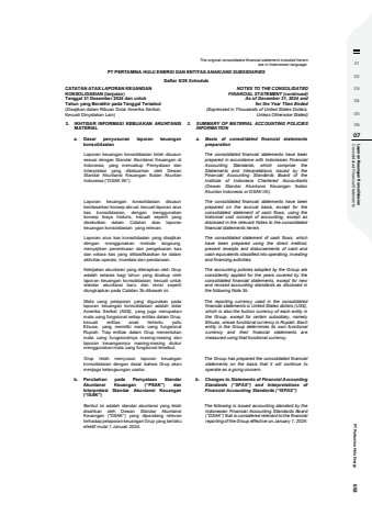 01020304050607 Consolidated Financial Statements Laporan Keaungan Konsolidasian PT Pertamina Hulu Energi 693The original consolidated financial statement included hereinare in Indonesian language.PT PERTAMINA HULU ENERGI DAN ENTITAS ANAK/AND SUBSIDIARIESDaftar 5/29 ScheduleCATATAN ATAS LAPORAN KEUANGANKONSOLIDASIAN (lanjutan)Tanggal 31 Desember 2024 dan untukTahun yang Berakhir pada Tanggal Tersebut(Disajikan dalam Ribuan Dolar Amerika Serikat,Kecuali Dinyatakan Lain)NOTES TO THE CONSOLIDATEDFINANCIAL STATEMENT (continued)As of December 31, 2024 andfor the Year Then Ended(Expressed in Thousands of United States Dollars,Unless Otherwise Stated)3. IKHTISAR INFORMASI KEBIJAKAN AKUNTANSIMATERIAL3. SUMMARY OF MATERIAL ACCOUNTING POLICIESINFORMATIONa. Dasar penyusunan laporan keuangankonsolidasiana. Basis of consolidated financial statementspreparationLaporan keuangan konsolidasian telah disusunsesuai dengan Standar Akuntansi Keuangan diIndonesia, yang mencakup Pernyataan danInterpretasi yang dikeluarkan oleh DewanStandar Akuntansi Keuangan Ikatan AkuntanIndonesia (%u201cDSAK IAI%u201d).The consolidated financial statements have beenprepared in accordance with Indonesian FinancialAccounting Standards, which comprise theStatements and Interpretations issued by theFinancial Accounting Standards Board of theInstitute of Indonesia Chartered Accountants(Dewan Standar Akuntansi Keuangan IkatanAkuntan Indonesia or DSAK IAI).Laporan keuangan konsolidasian disusunberdasarkan konsep akrual, kecuali laporan aruskas konsolidasian, dengan menggunakankonsep biaya historis, kecuali seperti yangdisebutkan dalam Catatan atas laporankeuangan konsolidasian yang relevan.The consolidated financial statements have beenprepared on the accrual basis, except for theconsolidated statement of cash flows, using thehistorical cost concept of accounting, except asdisclosed in the relevant Notes to the consolidatedfinancial statements herein.Laporan arus kas konsolidasian yang disajikandengan menggunakan metode langsung,menyajikan penerimaan dan pengeluaran kasdan setara kas yang diklasifikasikan ke dalamaktivitas operasi, investasi dan pendanaan.The consolidated statement of cash flows, whichhave been prepared using the direct method,present receipts and disbursements of cash andcash equivalents classified into operating, investingand financing activities.Kebijakan akuntansi yang diterapkan oleh Grupadalah selaras bagi tahun yang dicakup olehlaporan keuangan konsolidasian, kecuali untukstandar akuntansi baru dan revisi sepertidiungkapkan pada Catatan 3b dibawah ini.The accounting policies adopted by the Group areconsistently applied for the years covered by theconsolidated financial statements, except for newand revised accounting standards as disclosed inthe following Note 3b.Mata uang pelaporan yang digunakan padalaporan keuangan konsolidasian adalah dolarAmerika Serikat (AS$), yang juga merupakanmata uang fungsional setiap entitas dalam Grup,kecuali entitas anak tertentu yaituElnusa, yang memiliki mata uang fungsionalRupiah. Tiap entitas dalam Grup menentukanmata uang fungsionalnya masing-masing danlaporan keuangannya masing-masing diukurmenggunakan mata uang fungsional tersebut.The reporting currency used in the consolidatedfinancial statements is United States dollars (US$),which is also the fuction currency of each entity inthe Group, except for certain subsidiary, namelyElnusa, whose functional currency is Rupiah. Eachentity in the Group determines its own functionalcurrency and their financial statements aremeasured using that functional currency.Grup telah menyusun laporan keuangankonsolidasian dengan dasar bahwa Grup akanmenjaga kelangsungan usaha.The Group has prepared the consolidated financialstatements on the basis that it will continue tooperate as a going concern.b. Perubahan pada Pernyataan StandarAkuntansi Keuangan (%u201cPSAK%u201d) danInterpretasi Standar Akuntansi Keuangan(%u201cISAK%u201d)b. Changes to Statements of Financial AccountingStandards (%u201cSFAS%u201d) and Interpretations ofFinancial Accounting Standards (%u201cISFAS%u201d)Berikut ini adalah standar akuntansi yang telahdisahkan oleh Dewan Standar AkuntansiKeuangan (%u201cDSAK%u201d) yang dipandang relevanterhadap pelaporan keuangan Grup yang berlakuefektif mulai 1 Januari 2024.The following is issued accounting standard by theIndonesian Financial Accounting Standards Board(%u201cDSAK%u201d) that is considered relevant to the financialreporting of the Group effective on January 1, 2024: