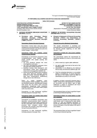 Laporan Tahunan %u2022 Annual Report 694HULU ENERGIThe original consolidated financial statement included hereinare in Indonesian language.PT PERTAMINA HULU ENERGI DAN ENTITAS ANAK/AND SUBSIDIARIESDaftar 5/30 ScheduleCATATAN ATAS LAPORAN KEUANGANKONSOLIDASIAN (lanjutan)Tanggal 31 Desember 2024 dan untukTahun yang Berakhir pada Tanggal Tersebut(Disajikan dalam Ribuan Dolar Amerika Serikat,Kecuali Dinyatakan Lain)NOTES TO THE CONSOLIDATEDFINANCIAL STATEMENT (continued)As of December 31, 2024 andfor the Year Then Ended(Expressed in Thousands of United States Dollars,Unless Otherwise Stated)3. IKHTISAR INFORMASI KEBIJAKAN AKUNTANSIMATERIAL (lanjutan)3. SUMMARY OF MATERIAL ACCOUNTING POLICIESINFORMATION (continued)b. Perubahan pada Pernyataan StandarAkuntansi Keuangan (%u201cPSAK%u201d) danInterpretasi Standar Akuntansi Keuangan(%u201cISAK%u201d) (lanjutan)b. Changes to Statements of Financial AccountingStandards (%u201cSFAS%u201d) and Interpretations ofFinancial Accounting Standards (%u201cISFAS%u201d)(continued)Nomenklatur Standar Akuntansi Keuangan Financial Accounting Standards NomenclatureNomenklatur revisian diatur ulang dan diubahsebagaimana yang dipublikasikan oleh DSAK IAIuntuk periode keuangan yang dimulai pada dansetelah tanggal 1 Januari 2024.The revised nomenclature is reordered andamended based on those as published by DSAK IAIfor financial periods beginning on and afterJanuary 1, 2024.Amandemen PSAK 201: Liabilitas JangkaPanjang dengan KovenanAmendment of PSAK 201: Non-current Liabilitieswith CovenantsAmandemen ini menentukan persyaratan untukmengklasifikasikan suatu liabilitas sebagaijangka pendek atau jangka panjang danmenjelaskan: hal yang dimaksud sebagai hak untukmenangguhkan pelunasan, hak untuk menangguhkan pelunasan harusada pada akhir periode pelaporan, klasifikasi tersebut tidak dipengaruhi olehkemungkinan entitas akan menggunakanhakya untuk menangguhkan liabilitas, dan bahwa jika derivatif melekat dalam kewajibanyang dapat dikonversi dianggap sebagaiinstrumen ekuitas, ketentuan kewajiban initidak akan mempengaruhi klasifikasinyasebagai lancar atau tidak lancar.The amendments specify the requirements forclassifying liabilities as current or non-current andclarify:what is meant by a right to defer settlement,the right to defer must exist at the end of thereporting period,classification is not affected by the likelihoodthat an entity will exercise its deferral right, andThat if an embedded derivative in a convertibleliability is considered as an equity instrument,the terms of the liability would not affect itsclassification as current or non-currentSelain itu, entitas diwajibkan untukmengungkapkan ketika kewajiban, yang timbuldari perjanjian pinjaman, diklasifikasikan sebagaitidak lancar dan hak entitas untuk menundapenyelesaian bergantung pada kepatuhanterhadap kovenan di masa depan dalam jangkawaktu dua belas bulan.In addition, an entity is required to disclose when aliability, arising from a loan agreement, is classifiedas non-current and the entity%u2019s right to defersettlement is subject to compliance with futurecovenants within twelve months.Amandemen ini tidak berdampak signifikanterhadap pelaporan keuangan Grup.This amendment does not have a significant impacton the Group's financial reporting.Amandemen PSAK 116: Liabilitas Sewa dalamJual Beli dan Sewa-balikAmendment of PSAK 116: Lease liability in a Saleand LeasebackAmandemen ini menetapkan persyaratan yangdigunakan penjual-penyewa dalam mengukurkewajiban sewa yang timbul dalam transaksi jualbeli dan sewa-balik, untuk memastikan penjualpenyewa tidak mengakui jumlah setiapkeuntungan atau kerugian yang terkait denganhak guna yang dipertahankan.The amendment specifies the requirements that aseller-lessee uses in measuring the lease liabilityarising in a sale and leaseback transaction, toensure the seller-lessee does not recognise anyamount of the gain or loss that relates to the right ofuse it retains.Amandemen ini tidak berdampak signifikanterhadap pelaporan keuangan Grup.This amendment does not have a significant impacton the Group's financial reporting.