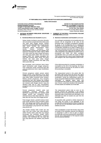 Laporan Tahunan %u2022 Annual Report 700HULU ENERGIThe original consolidated financial statement included hereinare in Indonesian language.PT PERTAMINA HULU ENERGI DAN ENTITAS ANAK/AND SUBSIDIARIESDaftar 5/36 ScheduleCATATAN ATAS LAPORAN KEUANGANKONSOLIDASIAN (lanjutan)Tanggal 31 Desember 2024 dan untukTahun yang Berakhir pada Tanggal Tersebut(Disajikan dalam Ribuan Dolar Amerika Serikat,Kecuali Dinyatakan Lain)NOTES TO THE CONSOLIDATEDFINANCIAL STATEMENT (continued)As of December 31, 2024 andfor the Year Then Ended(Expressed in Thousands of United States Dollars,Unless Otherwise Stated)3. IKHTISAR INFORMASI KEBIJAKAN AKUNTANSIMATERIAL (lanjutan)3. SUMMARY OF MATERIAL ACCOUNTING POLICIESINFORMATION (continued)d. Kombinasi Bisnis dan Goodwill (lanjutan) d. Business Combination and Goodwill (continued)Setiap imbalan kontinjensi yang akan ditransferoleh perusahaan pengakuisisi akan diakui padanilai wajar pada tanggal akuisisi. Imbalankontinjensi yang diklasifikasikan sebagai ekuitastidak diukur kembali dan penyelesaianselanjutnya adalah diperhitungkan dalamekuitas. Imbalan kontinjensi yangdiklasifikasikan sebagai aset atau liabilitas yaituinstrumen keuangan dan dalam lingkup PSAK109, diukur pada nilai wajar dengan perubahannilai wajar yang diakui dalam laba rugi sesuaidengan PSAK 109. Imbalan kontinjensi lainyang tidak termasuk dalam PSAK 109 diukursebesar nilai wajar pada setiap tanggalpelaporan dengan perubahan nilai wajar yangdiakui pada laba rugi.Any contingent consideration to be transferred by theacquirer will be recognized at fair value at theacquisition date. Contingent consideration classifiedas equity is not re-measured and its subsequentsettlement is accounted for within equity. Contingentconsideration classified as an asset or liability that isa financial instrument and within the scope of PSAK109, is measured at fair value with the changes in fairvalue recognized in the statement of profit or loss inaccordance with PSAK 109. Other contingentconsideration that is not within the scope of PSAK109 is measured at fair value at each reporting datewith changes in fair value recognized in profit or loss.Bila pencatatan awal kombinasi bisnis belumdapat diselesaikan pada tanggal pelaporan,Grup melaporkan jumlah sementara bagi itemyang pencatatannya belum dapat diselesaikantersebut.If the initial accounting for a business combination isincomplete by the end of the reporting, the Groupreports provisional amounts for the items for whichthe accounting is incomplete.Periode pengukuran adalah periode setelahtanggal akuisisi yang didalamnya Grup dapatmelakukan penyesuaian atas jumlah sementarayang diakui dalam kombinasi bisnis tersebut.Selama periode pengukuran, Grup mengakuipenambahan aset atau liabilitas bila terdapatinformasi terbaru yang diperoleh mengenai faktadan keadaan pada tanggal akuisisi, yang biladiketahui pada saat itu, akan menyebabkanpengakuan atas aset dan liabilitas pada tanggaltersebut.The measurement period is the period after theacquisition date during which the Group may adjustthe provisional amounts recognized for a businesscombination. During the measurement period, theGroup recognizes additional assets or liabilities if newinformation is obtained about facts andcircumstances that existed as of the acquisition dateand, if known, would have resulted in the recognitionof those assets and liabilities as of that date.Periode pengukuran berakhir pada saatpengakuisisi menerima informasi yangdiperlukan mengenai fakta dan keadaan padatanggal akuisisi atau mengetahui bahwainformasi lainnya tidak dapat diperoleh, namuntidak lebih dari satu tahun dari tanggal akuisisi.The measurement period ends as soon as theacquirer receives the information it was seekingabout facts and circumstances that existed as of theacquisition date or learns that more information is notobtainable but shall not exceed one year from theacquisition date.Pada tanggal akuisisi, goodwill awalnya diukurpada harga perolehan yang merupakan selisihlebih nilai agregat dari imbalan yang dialihkandan jumlah setiap KNP atas selisih jumlah dariaset teridentifikasi yang diperoleh dan liabilitasyang diambil alih.At acquisition date, goodwill is initially measured atcost being the excess of the aggregate of theconsideration transferred and the amount recognizedfor NCI over the net identifiable assets acquired andliabilities assumed.Jika imbalan tersebut lebih rendah dari nilaiwajar aset neto entitas anak yang diakuisisi,selisih tersebut diakui pada laba rugi sebagaikeuntungan dari pembelian dengan diskonsetelah sebelumnya manajemen melakukanpenilaian atas identifikasi dan nilai wajar dariaset yang diperoleh dan liabilitas yang diambilalih..If this consideration is lower than the fair value of thenet assets of the subsidiary acquired, the differenceis recognized in profit or loss as gain on bargainpurchase after previously assessing the identificationand fair value measurement of the acquired assetsand the assumed liabilities.
