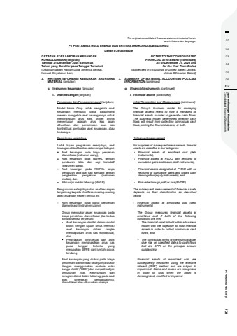 01020304050607 Consolidated Financial Statements Laporan Keaungan Konsolidasian PT Pertamina Hulu Energi 703The original consolidated financial statement included hereinare in Indonesian language.PT PERTAMINA HULU ENERGI DAN ENTITAS ANAK/AND SUBSIDIARIESDaftar 5/39 ScheduleCATATAN ATAS LAPORAN KEUANGANKONSOLIDASIAN (lanjutan)Tanggal 31 Desember 2024 dan untukTahun yang Berakhir pada Tanggal Tersebut(Disajikan dalam Ribuan Dolar Amerika Serikat,Kecuali Dinyatakan Lain)NOTES TO THE CONSOLIDATEDFINANCIAL STATEMENT (continued)As of December 31, 2024 andfor the Year Then Ended(Expressed in Thousands of United States Dollars,Unless Otherwise Stated)3. IKHTISAR INFORMASI KEBIJAKAN AKUNTANSIMATERIAL (lanjutan)3. SUMMARY OF MATERIAL ACCOUNTING POLICIESINFORMATION (continued)g. Instrumen keuangan (lanjutan) g. Financial instruments (continued)i. Aset keuangan (lanjutan) i. Financial assets (continued)Pengakuan dan Pengukuran awal (lanjutan) Initial Recognition and Measurement (continued)Model bisnis Grup untuk mengelola asetkeuangan mengacu pada bagaimanamereka mengelola aset keuangannya untukmenghasilkan arus kas. Model bisnismenentukan apakah arus kas akandihasilkan dari penerimaan arus kaskontraktual, penjualan aset keuangan, ataukeduanya.The Group%u2019s business model for managingfinancial assets refers to how it manages itsfinancial assets in order to generate cash flows.The business model determines whether cashflows will result from collecting contractual cashflows, selling the financial assets, or both.Pengukuran selanjutnya Subsequent measurementUntuk tujuan pengukuran selanjutnya, asetkeuangan diklasifikasikan dalam empat kategori:For purposes of subsequent measurement, financialassets are classified in four categories: Aset keuangan pada biaya perolehandiamortisasi (instrumen utang),Financial assets at amortized cost (debtinstruments), Aset keuangan pada NWPKL denganpendauran laba dan rugi kumulatif(instrumen utang),Financial assets at FVOCI with recycling ofcumulative gains and losses (debt instruments), Aset keuangan pada NWPKL tanpapendauran laba dan rugi kumulatif setelahpenghentian pengakuan (instrumenekuitas), danFinancial assets designated at FVOCI with norecycling of cumulative gains and losses uponderecognition (equity instruments), andNilai wajar melalui laba rugi (NWLR). Fair value through profit or loss (FVTPL).Pengukuran selanjutnya dari aset keuangantergantung kepada klasifikasi masing-masingaset keuangan seperti berikut ini:The subsequent measurement of financial assetsdepends on their classification as describedbelo- Aset keuangan pada biaya perolehandiamortisasi (instrumen utang)- Financial assets at amortized cost (debtinstruments)Group mengukur asset keuangan padabiaya perolehan diamortisasi jika keduakondisi berikut terpenuhi:The Group measures financial assets atamortized cost if both of the followingconditions are met: Aset keuangan dimiliki dalam modelbisnis dengan tujuan untuk memilikiaset keuangan dalam rangkamendapatkan arus kas kontraktual,danThe financial asset is held within a businessmodel with the objective to hold financialassets in order to collect contractual cashflows, and Persyaratan kontraktual dari asetkeuangan menghasilkan arus kaspada tanggal tertentu yangmerupakan SPPB dari jumlah pokokterutangThe contractual terms of the financial assetgive rise on specified dates to cash flowsthat are SPPI on the principal amountoutstandingAset keuangan yang diukur pada biayaperolehan diamortisasi selanjutnya diukurdengan menggunakan metode sukubunga efektif (%u201cSBE%u201d) dan menjadi subjekpenurunan nilai. Keuntungan dankerugian diakui dalam laba rugi pada saataset dihentikan pengakuannya,dimodifikasi atau diturunkan nilainya.Financial assets at amortized cost aresubsequently measured using the effectiveinterest (%u201cEIR%u201d) method and are subject toimpairment. Gains and losses are recognizedin profit or loss when the asset isderecognized, modified or impaired.
