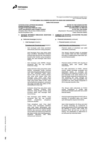 Laporan Tahunan %u2022 Annual Report 704HULU ENERGIThe original consolidated financial statement included hereinare in Indonesian language.PT PERTAMINA HULU ENERGI DAN ENTITAS ANAK/AND SUBSIDIARIESDaftar 5/40 ScheduleCATATAN ATAS LAPORAN KEUANGANKONSOLIDASIAN (lanjutan)Tanggal 31 Desember 2024 dan untukTahun yang Berakhir pada Tanggal Tersebut(Disajikan dalam Ribuan Dolar Amerika Serikat,Kecuali Dinyatakan Lain)NOTES TO THE CONSOLIDATEDFINANCIAL STATEMENT (continued)As of December 31, 2024 andfor the Year Then Ended(Expressed in Thousands of United States Dollars,Unless Otherwise Stated)3. IKHTISAR INFORMASI KEBIJAKAN AKUNTANSIMATERIAL (lanjutan)3. SUMMARY OF MATERIAL ACCOUNTING POLICIESINFORMATION (continued)g. Instrumen keuangan (lanjutan) g. Financial instruments (continued)i. Aset keuangan (lanjutan) i. Financial assets (continued)Pengakuan dan Pengukuran awal (lanjutan) Initial Recognition and Measurement (continued)- Aset keuangan pada biaya perolehandiamortisasi (instrumen utang) (lanjutan)- Financial assets at amortized cost (debtinstruments) (continued)Aset keuangan Grup yang diukur padabiaya perolehan diamortisasi termasukpiutang usaha dan lain-lain, dan pinjamankepada pihak berelasi yang merupakanbagian dari aset keuangan tidak lancarlainnya.The Group%u2019s financial assets at amortizedcost includes trade and other receivables,and loans to related parties under other noncurrent financial assets- Aset keuangan pada NWPKL denganpendauran laba dan rugi kumulatif(instrumen utang)- Financial assets at FVOCI with recycling ofcumulative gains and losses (debtinstruments)Untuk instrumen utang yang diukur padaNWPKL, pendapatan bunga, revaluasimata uang asing dan kerugian penurunannilai atau pembalikan diakui dalamlaporan laba rugi dan dihitung dengancara yang sama seperti untuk asetkeuangan yang diukur pada biayaperolehan diamortisasi. Perubahan nilaiwajar yang tersisa diakui di PKL. Padasaat penghentian pengakuan, perubahannilai wajar kumulatif yang diakui di PKLdireklasifikasi ke laba rugi.For debt instruments at FVOCI, interestincome, foreign exchange revaluation andimpairment losses or reversals arerecognized in the statement of profit or lossand computed in the same manner as forfinancial assets measured at amortized cost.The remaining fair value changes arerecognized in OCI. Upon derecognition, thecumulative fair value change recognized inOCI is recycled to profit or loss.Instrumen utang Grup yang diukur padaNWPKL termasuk investasi padainstrumen utang dengan kuotasi yangtermasuk dalam aset keuangan tidaklancar lainnya.The Group%u2019s debt instruments at FVOCIinclude investments in quoted debtinstruments included under other non-currentfinancial assets.- Aset keuangan pada NWPKL tanpapendauran laba dan rugi kumulatifsetelah penghentian pengakuan(instrumen ekuitas)- Financial assets designated at FVOCI with norecycling of cumulative gains and lossesupon derecognition (equity instruments)Pada pengakuan awal, Grup dapatmemilih untuk menetapkan klasifikasiyang tidak dapat dikembalikan atasinvestasi pada instrumen ekuitas sebagaiNWPKL jika memenuhi definisi ekuitassesuai PSAK 232 (sebelumnya PSAK 50)dan tidak dimiliki untuk diperdagangkan.Klasifikasi ditentukan atas basisinstrumen per instrumenUpon initial recognition, the Group can electto classify irrevocably its investments inequity instruments at FVOCI when they meetthe definition of equity under PSAK 232(formerly SFAS 50) and are not held fortrading. The classification is determined onan instrument-by-instrument basis.