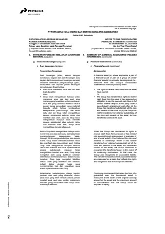 Laporan Tahunan %u2022 Annual Report 706HULU ENERGIThe original consolidated financial statement included hereinare in Indonesian language.PT PERTAMINA HULU ENERGI DAN ENTITAS ANAK/AND SUBSIDIARIESDaftar 5/42 ScheduleCATATAN ATAS LAPORAN KEUANGANKONSOLIDASIAN (lanjutan)Tanggal 31 Desember 2024 dan untukTahun yang Berakhir pada Tanggal Tersebut(Disajikan dalam Ribuan Dolar Amerika Serikat,Kecuali Dinyatakan Lain)NOTES TO THE CONSOLIDATEDFINANCIAL STATEMENT (continued)As of December 31, 2024 andfor the Year Then Ended(Expressed in Thousands of United States Dollars,Unless Otherwise Stated)3. IKHTISAR INFORMASI KEBIJAKAN AKUNTANSIMATERIAL (lanjutan)3. SUMMARY OF MATERIAL ACCOUNTING POLICIESINFORMATION (continued)g. Instrumen keuangan (lanjutan) g. Financial instruments (continued)i. Aset keuangan (lanjutan) i. Financial assets (continued)Penghentian Pengakuan DerecognitionAset keuangan (atau, sesuai dengankondisinya, bagian dari aset keuangan ataubagian dari kelompok aset keuangan serupa)terutama dihentikan pengakuannya (yaitu,dihapuskan dari laporan posisi keuangankonsolidasian Grup) ketika:A financial asset (or, where applicable, a part ofa financial asset or part of a group of similarfinancial assets) is primarily derecognized (i.e.,removed from the Group%u2019s consolidatedstatement of financial position) when: Hak untuk menerima arus kas dari asettelah berakhir;AtauThe rights to receive cash flows from the assethave expired;Or Grup telah mengalihkan haknya untukmenerima arus kas dari aset ataumenanggung kewajiban untuk membayararus kas yang diterima tersebut secarapenuh tanpa penundaan yang materialkepada pihak ketiga berdasarkankesepakatan %u2018pass-through%u2019, dan salahsatu dari (a) Grup telah mengalihkansecara substansial seluruh risiko danmanfaat atas aset, atau (b) Grup tidakmengalihkan maupun tidak memilikisecara substansial atas seluruh risikodan manfaat atas aset, tetapi telahmengalihkan kendali atas aset.The Group has transferred its rights to receivecash flows from the asset or has assumed anobligation to pay the received cash flows in fullwithout material delay to a third party under a%u2018pass-through%u2019 arrangement and either (a) theGroup has transferred substantially all the risksand rewards of the asset, or (b) the Group hasneither transferred nor retained substantially allthe risks and rewards of the asset, but hastransferred control of the asset.Ketika Grup telah mengalihkan haknya untukmenerima arus kas dari suatu aset atau telahmenandatangani kesepakatan %u2018passthrough%u2019, Grup mengevaluasi jika, dan sejauhmana, Grup masih mempertahankan risikodan manfaat atas kepemilikan aset. KetikaGrup tidak mengalihkan maupun seluruhrisiko dan manfaat atas aset dipertahankansecara substansial, maupun tidakmengalihkan kendali atas aset, Grup tetapmengakui aset yang dialihkan sebesarketerlibatan berkelanjutannya. Dalam kasustersebut, Grup juga mengakui liabilitasterkait. Aset yang dialihkan dan liabilitasterkait diukur dengan basis yangmencerminkan hak dan kewajiban yangmasih dipertahankan oleh Grup.When the Group has transferred its rights toreceive cash flows from an asset or has enteredinto a pass-through arrangement, it evaluates if,and to what extent, it has retained the risks andrewards of ownership. When it has neithertransferred nor retained substantially all of therisks and rewards of the asset, nor transferredcontrol of the asset, the Group continues torecognize the transferred asset to the extent ofits continuing involvement. In that case, theGroup also recognizes an associated liability.The transferred asset and the associated liabilityare measured on a basis that reflects the rightsand obligations that the Group has retained.Keterlibatan berkelanjutan dalam bentukjaminan atas aset yang ditransfer, diukurpada nilai yang lebih rendah antara jumlahtercatat awal aset dan jumlah maksimumimbalan yang dibutuhkan oleh Grup untukmembayar kembali.Continuing involvement that takes the form of aguarantee over the transferred asset ismeasured at the lower of the original carryingamount of the asset and the maximum amountof consideration that the Group could berequired to repay.