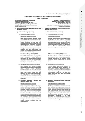 01020304050607 Consolidated Financial Statements Laporan Keaungan Konsolidasian PT Pertamina Hulu Energi 711The original consolidated financial statement included hereinare in Indonesian language.PT PERTAMINA HULU ENERGI DAN ENTITAS ANAK/AND SUBSIDIARIESDaftar 5/47 ScheduleCATATAN ATAS LAPORAN KEUANGANKONSOLIDASIAN (lanjutan)Tanggal 31 Desember 2024 dan untukTahun yang Berakhir pada Tanggal Tersebut(Disajikan dalam Ribuan Dolar Amerika Serikat,Kecuali Dinyatakan Lain)NOTES TO THE CONSOLIDATEDFINANCIAL STATEMENT (continued)As of December 31, 2024 andfor the Year Then Ended(Expressed in Thousands of United States Dollars,Unless Otherwise Stated)3. IKHTISAR INFORMASI KEBIJAKAN AKUNTANSIMATERIAL (lanjutan)3. SUMMARY OF MATERIAL ACCOUNTING POLICIESINFORMATION (continued)g. Instrumen keuangan (lanjutan) g. Financial instruments (continued)ii. Liabilitas keuangan (lanjutan) ii. Financial liabilities (continued)Penghentian pengakuan (lanjutan) Derecognition (continued)Ketika sebuah liabilitas keuangan ditukardengan liabilitas keuangan lain dari pemberipinjaman yang sama atas persyaratan yangsecara substansial berbeda, atau bilapersyaratan dari liabilitas keuangan tersebutsecara substansial dimodifikasi, pertukaranatau modifikasi persyaratan tersebut dicatatsebagai penghentian pengakuan liabilitaskeuangan orisinal dan pengakuan liabilitaskeuangan baru, dan selisih antara nilaitercatat masing-masing liabilitas keuangantersebut diakui pada laba rugi.When an existing financial liability is replaced byanother from the same lender on substantiallydifferent terms, or the terms of an existing liabilityare substantially modified, such an exchange ormodification is treated as derecognition of theoriginal liability and recognition of a new liability,and the difference in the respective carryingamounts is recognized in the profit or loss.Metode Suku Bunga Efektif (%u201cSBE%u201d) Effective Interest Rate (%u201cEIR%u201d) methodMetode SBE adalah metode yang digunakanuntuk menghitung biaya perolehandiamortisasi dari aset keuangan keuanganatau liabilitas keuangan dan mengalokasikanpendapatan bunga atau beban bungaselama periode yang relevan.The EIR method is a method of calculating theamortized cost of a financial asset asset orfinancial liabilities and of allocating interestincome or interest expense over the relevantperiod.iii. Saling hapus antar instrumen keuangan iii. Offsetting financial instrumentsAset keuangan dan liabilitas keuangandisaling hapuskan dan nilai netonya disajikandalam laporan posisi keuangankonsolidasian jika, dan hanya jika, terdapathak secara hukum untuk melakukan salinghapus atas jumlah tercatat dari asetkeuangan dan liabilitas keuangan tersebutdan terdapat intensi untuk menyelesaikansecara neto, atau untuk merealisasikan asetdan menyelesaikan liabilitas secarabersamaan.Financial assets and financial liabilities areoffset, and the net amount reported in theconsolidated statement of financial position if,and only if, there is a currently enforceable legalright to offset the recognized amounts and thereis an intention to settle on a net basis, or torealize the assets and settle the liabilitiessimultaneously.iv. Instrumen keuangan derivatif danakuntansi lindung nilaiiv. Derivative financial instruments and hedgeaccountingPengakuan dan pengukuran awal Initial recognition and measurementGrup menggunakan instrumen keuanganderivatif, seperti kontrak forward mata uang,interest rate swap dan kontrak forwardkomoditas, masing-masing untuk melakukanlindung nilai atas risiko mata uang asing,risiko suku bunga dan risiko hargakomoditas. Instrumen keuangan derivatiftersebut pada awalnya diakui pada nilai wajarpada tanggal kontrak derivatif ditandatanganidan selanjutnya diukur kembali pada nilaiwajarnya. Derivatif dicatat sebagai asetkeuangan jika nilai wajarnya positif dansebagai liabilitas keuangan jika nilaiwajarnya negatifThe Group uses derivative financial instruments,such as forward currency contracts, interest rateswaps and forward commodity contracts, tohedge its foreign currency risks, interest raterisks and commodity price risks, respectively.Such derivative financial instruments are initiallyrecognized at fair value on the date on which aderivative contract is entered into and aresubsequently remeasured at fair value.Derivatives are carried as financial assets whenthe fair value is positive and as financial liabilitieswhen the fair value is negative