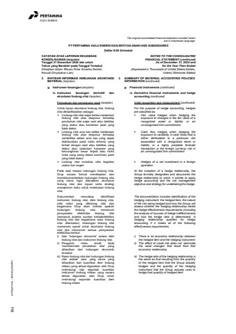 Laporan Tahunan %u2022 Annual Report 712HULU ENERGIThe original consolidated financial statement included hereinare in Indonesian language.PT PERTAMINA HULU ENERGI DAN ENTITAS ANAK/AND SUBSIDIARIESDaftar 5/48 ScheduleCATATAN ATAS LAPORAN KEUANGANKONSOLIDASIAN (lanjutan)Tanggal 31 Desember 2024 dan untukTahun yang Berakhir pada Tanggal Tersebut(Disajikan dalam Ribuan Dolar Amerika Serikat,Kecuali Dinyatakan Lain)NOTES TO THE CONSOLIDATEDFINANCIAL STATEMENT (continued)As of December 31, 2024 andfor the Year Then Ended(Expressed in Thousands of United States Dollars,Unless Otherwise Stated)3. IKHTISAR INFORMASI KEBIJAKAN AKUNTANSIMATERIAL (lanjutan)3. SUMMARY OF MATERIAL ACCOUNTING POLICIESINFORMATION (continued)g. Instrumen keuangan (lanjutan) g. Financial instruments (continued)iv. Instrumen keuangan derivatif danakuntansi lindung nilai (lanjutan)iv. Derivative financial instruments and hedgeaccounting (continued)Pengakuan dan pengukuran awal (lanjutan) Initial recognition and measurement (continued)Untuk tujuan akuntansi lindung nilai, lindungnilai diklasifikasikan sebagai:For the purpose of hedge accounting, hedgesare classified as: Lindung nilai nilai wajar ketika melakukanlindung nilai atas eksposur terhadapperubahan nilai wajar aset atau liabilitasyang diakui atau komitmen pasti yangtidak diakui,Fair value hedges when hedging theexposure to changes in the fair value of arecognized asset or liability or anunrecognized firm commitment, Lindung nilai arus kas ketika melakukanlindung nilai atas eksposur terhadapvariabilitas dalam arus kas yang dapatdiatribusikan pada risiko tertentu yangterkait dengan aset atau liabilitas yangdiakui atau prakiraan transaksi yangkemungkinan besar terjadi atau risikomata uang asing dalam komitmen pastiyang tidak diakuiCash flow hedges when hedging theexposure to variability in cash flows that iseither attributable to a particular riskassociated with a recognized asset orliability or a highly probable forecasttransaction or the foreign currency risk inan unrecognized firm commitment Lindung nilai investasi neto kegiatanusaha luar negeriHedges of a net investment in a foreignoperationPada saat insepsi hubungan lindung nilai,Grup secara formal menetapkan danmendokumentasikan hubungan lindung nilaiyang mana ingin diterapkan akuntansilindung nilai dan tujuan serta strategimanajemen risiko untuk melakukan lindungnilai.At the inception of a hedge relationship, theGroup formally designates and documents thehedge relationship to which it wishes to applyhedge accounting and the risk managementobjective and strategy for undertaking the hedge.Dokumentasi mencakup identifikasiinstrumen lindung nilai, item lindung nilai,sifat risiko yang dilindung nilai danbagaimana Grup akan menilai apakahhubungan lindung nilai memenuhipersyaratan efektivitas lindung nilai(termasuk analisis sumber ketidakefektifanlindung nilai dan bagaimana rasio lindungnilai. ditentukan). Hubungan lindung nilaimemenuhi syarat untuk akuntansi lindungnilai jika memenuhi semua persyaratanefektivitas berikut:.The documentation includes identification of thehedging instrument, the hedged item, the natureof the risk being hedged and how the Group willassess whether the hedging relationship meetsthe hedge effectiveness requirements (includingthe analysis of sources of hedge ineffectivenessand how the hedge ratio is determined). Ahedging relationship qualifies for hedgeaccounting if it meets all of the followingeffectiveness requirements:i) Ada 'hubungan ekonomik' antara itemlindung nilai dan instrumen lindung nilai.i) There is %u2018an economic relationship%u2019 betweenthe hedged item and the hedging instrumentii) Pengaruh risiko kredit tidak'mendominasi perubahan nilai' yangdihasilkan dari hubungan ekonomiktersebut.ii) The effect of credit risk does not %u2018dominatethe value changes%u2019 that result from thateconomic relationship.iii) Rasio lindung nilai dari hubungan lindungnilai adalah rasio yang sama yangdihasilkan dari kuantitas item lindungnilaian yang aktual digunakan oleh Grupmelindungi nilai sejumlah kuantitasinstrumen lindung nilaian yang secaraaktual digunakan oleh Grup untukmelindungi sejumlah kuantitas itemlindung nilaianiii) The hedge ratio of the hedging relationship isthe same as that resulting from the quantityof the hedged item that the Group actuallyhedges and the quantity of the hedginginstrument that the Group actually uses tohedge that quantity of hedged item.