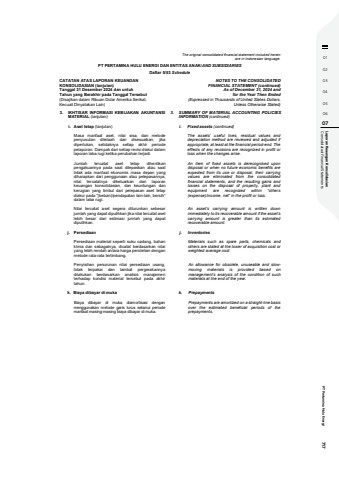 01020304050607 Consolidated Financial Statements Laporan Keaungan Konsolidasian PT Pertamina Hulu Energi 717The original consolidated financial statement included hereinare in Indonesian language.PT PERTAMINA HULU ENERGI DAN ENTITAS ANAK/AND SUBSIDIARIESDaftar 5/53 ScheduleCATATAN ATAS LAPORAN KEUANGANKONSOLIDASIAN (lanjutan)Tanggal 31 Desember 2024 dan untukTahun yang Berakhir pada Tanggal Tersebut(Disajikan dalam Ribuan Dolar Amerika Serikat,Kecuali Dinyatakan Lain)NOTES TO THE CONSOLIDATEDFINANCIAL STATEMENT (continued)As of December 31, 2024 andfor the Year Then Ended(Expressed in Thousands of United States Dollars,Unless Otherwise Stated)3. IKHTISAR INFORMASI KEBIJAKAN AKUNTANSIMATERIAL (lanjutan)3. SUMMARY OF MATERIAL ACCOUNTING POLICIESINFORMATION (continued)i. Aset tetap (lanjutan) i. Fixed assets (continued)Masa manfaat aset, nilai sisa, dan metodepenyusutan ditelaah dan disesuaikan, jikadiperlukan, setidaknya setiap akhir periodepelaporan. Dampak dari setiap revisi diakui dalamlaporan laba rugi ketika perubahan terjadi.The assets%u2019 useful lives, residual values anddepreciation method are reviewed and adjusted ifappropriate, at least at the financial period-end. Theeffects of any revisions are recognized in profit orloss when the changes arise.Jumlah tercatat aset tetap dihentikanpengakuannya pada saat dilepaskan atau saattidak ada manfaat ekonomis masa depan yangdiharapkan dari penggunaan atau pelepasannya,nilai tercatatnya dikeluarkan dari laporankeuangan konsolidasian, dan keuntungan dankerugian yang timbul dari pelepasan aset tetapdiakui pada %u201c(beban)/pendapatan lain-lain, bersih%u201ddalam laba rugi.An item of fixed assets is derecognised upondisposal or when no future economic benefits areexpected from its use or disposal, their carryingvalues are eliminated from the consolidatedfinancial statements, and the resulting gains andlosses on the disposal of property, plant andequipment are recognized within %u201cothers(expense)/income, net%u201d in the profit or loss.Nilai tercatat aset segera diturunkan sebesarjumlah yang dapat dipulihkan jika nilai tercatat asetlebih besar dari estimasi jumlah yang dapatdipulihkan.An asset%u2019s carrying amount is written downimmediately to its recoverable amount if the asset%u2019scarrying amount is greater than its estimatedrecoverable amount.j. Persediaan j. InventoriesPersediaan material seperti suku cadang, bahankimia dan sebagainya, dicatat berdasarkan nilaiyang lebih rendah antara harga perolehan denganmetode rata-rata tertimbang.Materials such as spare parts, chemicals andothers are stated at the lower of acquisition cost orweighted average cost.Penyisihan penurunan nilai persediaan usang,tidak terpakai dan lambat pergerakannyadilakukan berdasarkan analisis manajementerhadap kondisi material tersebut pada akhirtahun.An allowance for obsolete, unuseable and slowmoving materials is provided based onmanagement%u2019s analysis of the condition of suchmaterials at the end of the year.k. Biaya dibayar di muka k. PrepaymentsBiaya dibayar di muka diamortisasi denganmenggunakan metode garis lurus selama periodemanfaat masing-masing biaya dibayar di muka.Prepayments are amortized on a straight-line basisover the estimated beneficial periods of theprepayments.
