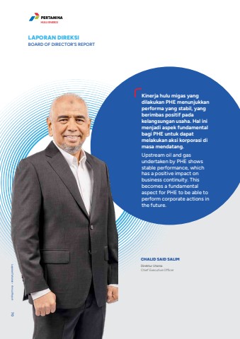 LAPORAN DIREKSIBOARD OF DIRECTOR%u2019S REPORTCHALID SAID SALIMDirektur Utama Chief Executive OfficerKinerja hulu migas yang dilakukan PHE menunjukkan performa yang stabil, yang berimbas positif pada kelangsungan usaha. Hal ini menjadi aspek fundamental bagi PHE untuk dapat melakukan aksi korporasi di masa mendatang.Upstream oil and gas undertaken by PHE shows stable performance, which has a positive impact on business continuity. This becomes a fundamental aspect for PHE to be able to perform corporate actions in the future.HULU ENERGILaporan Tahunan %u2022 Annual Report 70PT Pertamina Hulu Energi 71
