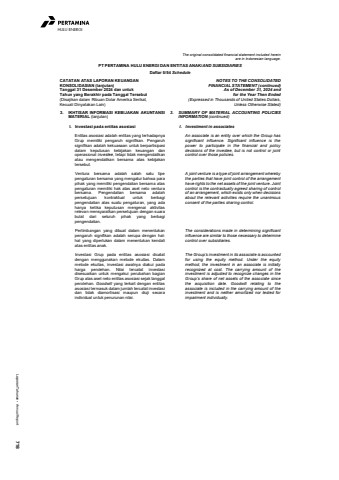 Laporan Tahunan %u2022 Annual Report 718HULU ENERGIThe original consolidated financial statement included hereinare in Indonesian language.PT PERTAMINA HULU ENERGI DAN ENTITAS ANAK/AND SUBSIDIARIESDaftar 5/54 ScheduleCATATAN ATAS LAPORAN KEUANGANKONSOLIDASIAN (lanjutan)Tanggal 31 Desember 2024 dan untukTahun yang Berakhir pada Tanggal Tersebut(Disajikan dalam Ribuan Dolar Amerika Serikat,Kecuali Dinyatakan Lain)NOTES TO THE CONSOLIDATEDFINANCIAL STATEMENT (continued)As of December 31, 2024 andfor the Year Then Ended(Expressed in Thousands of United States Dollars,Unless Otherwise Stated)3. IKHTISAR INFORMASI KEBIJAKAN AKUNTANSIMATERIAL (lanjutan)3. SUMMARY OF MATERIAL ACCOUNTING POLICIESINFORMATION (continued)l. Investasi pada entitas asosiasi l. Investment in associatesEntitas asosiasi adalah entitas yang terhadapnyaGrup memiliki pengaruh signifikan. Pengaruhsignifikan adalah kekuasaan untuk berpartisipasidalam keputusan kebijakan keuangan danoperasional investee, tetapi tidak mengendalikanatau mengendalikan bersama atas kebijakantersebut.An associate is an entity over which the Group hassignificant influence. Significant influence is thepower to participate in the financial and policydecisions of the investee, but is not control or jointcontrol over those policies.Ventura bersama adalah salah satu tipepengaturan bersama yang mengatur bahwa parapihak yang memiliki pengendalian bersama ataspengaturan memiliki hak atas aset neto venturabersama. Pengendalian bersama adalahpersetujuan kontraktual untuk berbagipengendalian atas suatu pengaturan, yang adahanya ketika keputusan mengenai aktivitasrelevan mensyaratkan persetujuan dengan suarabulat dari seluruh pihak yang berbagipengendalian.A joint venture is a type of joint arrangement wherebythe parties that have joint control of the arrangementhave rights to the net assets of the joint venture. Jointcontrol is the contractually agreed sharing of controlof an arrangement, which exists only when decisionsabout the relevant activities require the unanimousconsent of the parties sharing control.Pertimbangan yang dibuat dalam menentukanpengaruh signifikan adalah serupa dengan halhal yang diperlukan dalam menentukan kendaliatas entitas anak.The considerations made in determining significantinfluence are similar to those necessary to determinecontrol over subsidiaries.Investasi Grup pada entitas asosiasi dicatatdengan menggunakan metode ekuitas. Dalammetode ekuitas, investasi awalnya diakui padaharga perolehan. Nilai tercatat investasidisesuaikan untuk mengakui perubahan bagianGrup atas aset neto entitas asosiasi sejak tanggalperolehan. Goodwill yang terkait dengan entitasasosiasi termasuk dalam jumlah tercatat investasidan tidak diamortisasi maupun diuji secaraindividual untuk penurunan nilai.The Group%u2019s investment in its associate is accountedfor using the equity method. Under the equitymethod, the investment in an associate is initiallyrecognized at cost. The carrying amount of theinvestment is adjusted to recognize changes in theGroup%u2019s share of net assets of the associate sincethe acquisition date. Goodwill relating to theassociate is included in the carrying amount of theinvestment and is neither amortized nor tested forimpairment individually.