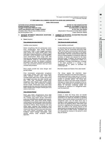 01020304050607 Consolidated Financial Statements Laporan Keaungan Konsolidasian PT Pertamina Hulu Energi 723The original consolidated financial statement included hereinare in Indonesian language.PT PERTAMINA HULU ENERGI DAN ENTITAS ANAK/AND SUBSIDIARIESDaftar 5/59 ScheduleCATATAN ATAS LAPORAN KEUANGANKONSOLIDASIAN (lanjutan)Tanggal 31 Desember 2024 dan untukTahun yang Berakhir pada Tanggal Tersebut(Disajikan dalam Ribuan Dolar Amerika Serikat,Kecuali Dinyatakan Lain)NOTES TO THE CONSOLIDATEDFINANCIAL STATEMENT (continued)As of December 31, 2024 andfor the Year Then Ended(Expressed in Thousands of United States Dollars,Unless Otherwise Stated)3. IKHTISAR INFORMASI KEBIJAKAN AKUNTANSIMATERIAL (lanjutan)3. SUMMARY OF MATERIAL ACCOUNTING POLICIESINFORMATION (continued)n. Sewa (lanjutan) n. Leases (continued)Grup sebagai penyewa (lanjutan) The Group as Lessee (continued)Liabilitas sewa (lanjutan) Lease liabilities (continued)Dalam menghitung nilai kini pembayaran sewa,Grup menggunakan Suku Bunga PinjamanInkremental (%u201cSBPI%u201d) pada tanggal permulaansewa karena suku bunga implisit dalam sewatidak dapat langsung ditentukan. Setelah tanggalpermulaan, jumlah kewajiban sewa ditingkatkanuntuk mencerminkan akresi bunga (atas efekdiskonto) dan dikurangi untuk pembayaran sewayang dilakukan. Selain itu, nilai tercatat liabilitassewa diukur kembali jika terdapat modifikasi,perubahan masa sewa, perubahan pembayaransewa, atau perubahan penilaian atas opsi untukmembeli aset pendasar.In calculating the present value of lease payments,the Group uses its Incremental Borrowing Rate(%u201cIBR%u201d) at the lease commencement date becausethe interest rate implicit in the lease is not readilydeterminable. After the commencement date, theamount of lease liabilities is increased to reflect theaccretion of interest and reduced for the leasepayments made. In addition, the carrying amountof lease liabilities is remeasured if there is amodification, a change in the lease term, a changein the lease payments or a change in theassessment of an option to purchase theunderlying asset.Sewa jangka pendek dan sewa dengan asetbernilai rendahShort-term leases and leases of low-value assetsGrup menerapkan pengecualian pengakuansewa jangka pendek untuk sewa yang jangkawaktu sewanya pendek (yaitu, sewa yangmemiliki jangka waktu sewa 12 bulan atau kurangdari tanggal permulaan dan tidak memiliki opsibeli). Grup juga menerapkan pengecualianpengakuan sewa dengan aset bernilai rendahuntuk sewa yang aset pendasarnya dianggapbernilai rendah. Pembayaran sewa untuk sewajangka pendek dan sewa dari aset bernilai rendahdiakui sebagai beban dengan metode garis lurusselama masa sewa.The Group applies the short-term leaserecognition exemption to its short-term leases (i.e.,those leases that have a lease term of 12 monthsor less from the commencement date and do notcontain a purchase option). The Group alsoapplies the lease of low-value assets recognitionexemption to leases that are considered to be lowvalue. Lease payments on short-term leases andleases of low-value underlying assets arerecognized as expense on a straight-line basisover the lease term.Grup sebagai Pesewa The Group as LessorSewa yang dalam pengaturannya Grup tidakmengalihkan secara substansial seluruh risikodan manfaat yang terkait dengan kepemilikansuatu aset diklasifikasikan sebagai sewa operasi.Pendapatan sewa yang timbul dicatat denganmetode garis lurus selama masa sewa dan diakuisebagai bagian dari pendapatan usaha pada labarugi karena sifatnya. Biaya langsung awal yangterjadi dalam negosiasi dan pengaturan sewaoperasi ditambahkan ke jumlah tercatat dari asetsewaan dan diakui selama masa sewa atas dasaryang sama dengan pendapatan sewa. Sewakontijensi diakui sebagai pendapatan padaperiode dimana sewa kontijensi tersebutdiperoleh.Leases in which the Group does not transfersubstantially all the risks and rewards incidental toownership of an asset are classified as operatingleases. Lease income arising is accounted for on astraight-line basis over the lease terms and isincluded in other operating income in the profit orloss due to its operating nature. Initial direct costsincurred in negotiating and arranging an operatinglease are added to the carrying amount of theleased asset and recognized over the lease term onthe same basis as lease income. Contingent rentare recognized as revenue in the period in whichthey are earned.