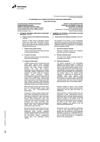 Laporan Tahunan %u2022 Annual Report 728HULU ENERGIThe original consolidated financial statement included hereinare in Indonesian language.PT PERTAMINA HULU ENERGI DAN ENTITAS ANAK/AND SUBSIDIARIESDaftar 5/64 ScheduleCATATAN ATAS LAPORAN KEUANGANKONSOLIDASIAN (lanjutan)Tanggal 31 Desember 2024 dan untukTahun yang Berakhir pada Tanggal Tersebut(Disajikan dalam Ribuan Dolar Amerika Serikat,Kecuali Dinyatakan Lain)NOTES TO THE CONSOLIDATEDFINANCIAL STATEMENT (continued)As of December 31, 2024 andfor the Year Then Ended(Expressed in Thousands of United States Dollars,Unless Otherwise Stated)3. IKHTISAR INFORMASI KEBIJAKAN AKUNTANSIMATERIAL (lanjutan)3. SUMMARY OF MATERIAL ACCOUNTING POLICIESINFORMATION (continued)q. Program pensiun dan imbalan kerja karyawan(lanjutan)q. Pension plan and employee benefits (continued)Operator di KBH dengan participating interestdimiliki oleh entitas anak, memberikan imbalanpasca kerja bagi semua karyawan tetapnya(karyawan yang direkrut secara langsung) sesuaidengan KKB entitas anak.The operators of the PSCs in which participatinginterests are owned by the subsidiaries, provide postemployment benefits covering all of their permanentemployees (direct hired employees) in accordancewith the subsidiaries%u2019 KKBs.i. Imbalan kerja jangka pendek i. Short-term employee benefitsImbalan kerja jangka pendek diakui pada saatterutang kepada karyawan.Short-term employee benefits are recognizedwhen they accrue to the employees.ii. Program iuran pasti ii. Defined contribution planBiaya atas program pensiun iuran pasti tersebutdiakui pada saat terjadinya.The costs of the defined contribution plans arerecognized when incurred.iii. Program imbalan pasti iii. Defined benefit plansLiabilitas program pensiun imbalan pasti yangdiakui dalam laporan posisi keuangankonsolidasian adalah nilai kini kewajibanimbalan pasti pada tanggal pelaporandikurangi nilai wajar aset program.Perhitungan tersebut dilakukan oleh aktuarisindependen dengan menggunakan metodeprojected unit credit. Nilai kini kewajibanimbalan pasti ditentukan denganmendiskontokan estimasi arus kas keluar dimasa depan menggunakan tingkat bungaobligasi pemerintah dengan pertimbanganbahwa pada saat ini tidak terdapat pasar aktifuntuk obligasi korporasi yang berkualitastinggi yang memiliki periode jatuh temponyaberdekatan dengan periode liabilitas tersebut.The liability recognized in the consolidatedstatement of financial position in respect ofdefined benefit pension plans is the presentvalue of the defined benefit obligation at thereporting date less the fair value of plan assets.The calculation is performed by an independentactuary using the projected unit credit method.The present value of the defined benefitobligation is determined by discounting theestimated future cash outflows usinggovernment bond interest rates consideringcurrently there is no deep market for high qualitycorporate bonds that have terms to maturityapproximating the terms of the related liability.Beban yang diakui di laba rugi termasuk biayajasa kini, beban/pendapatan bunga, biayajasa lalu dan keuntungan/kerugianpenyelesaian.Expense charged to profit or loss includescurrent service costs, interest expense/income,past-service cost and gains and losses onsettlements.Pengukuran kembali program imbalan pastidiakui dalam penghasilan komprehensif lain.Pengukuran kembali terdiri dari keuntungandan kerugian aktuaria, imbal hasil asetprogram (diluar pendapatan bunga yangsudah diakumulasi dalam perhitungan bunganeto/aset) dan setiap perubahan atasdampak batas atas aset (diluar pendapatanbunga yang sudah diakumulasi dalamperhitungan bunga neto/aset).Remeasurements of defined benefit plans arerecognized in other comprehensive income.Remeasurements comprise actuarial gains andlosses, the return on plan assets (excludingamounts included in net interest on the netdefined benefit liability/asset) and any change inthe effect of the asset ceiling (excludingamounts included in net interest on the netdefined benefit liability/asset).Biaya jasa lalu diakui segera dalam laba rugi,kecuali perubahan pada program pensiuntergantung pada kondisi karyawanmemberikan jasanya selama periode tertentu(periode vesting). Dalam hal ini, biaya jasalalu diamortisasi dengan menggunakanmetode garis lurus sepanjang periodevesting.Past-service costs are recognized immediatelyin profit or loss, unless the changes to thepension plan are conditional on the employeesremaining in service for a specified period oftime (the vesting period). In this case, the pastservice costs are amortized on a straight-linebasis over the vesting period.