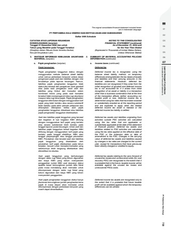 01020304050607 Consolidated Financial Statements Laporan Keaungan Konsolidasian PT Pertamina Hulu Energi 733The original consolidated financial statement included hereinare in Indonesian language.PT PERTAMINA HULU ENERGI DAN ENTITAS ANAK/AND SUBSIDIARIESDaftar 5/69 ScheduleCATATAN ATAS LAPORAN KEUANGANKONSOLIDASIAN (lanjutan)Tanggal 31 Desember 2024 dan untukTahun yang Berakhir pada Tanggal Tersebut(Disajikan dalam Ribuan Dolar Amerika Serikat,Kecuali Dinyatakan Lain)NOTES TO THE CONSOLIDATEDFINANCIAL STATEMENT (continued)As of December 31, 2024 andfor the Year Then Ended(Expressed in Thousands of United States Dollars,Unless Otherwise Stated)3. IKHTISAR INFORMASI KEBIJAKAN AKUNTANSIMATERIAL (lanjutan)3. SUMMARY OF MATERIAL ACCOUNTING POLICIESINFORMATION (continued)s. Pajak penghasilan (lanjutan) s. Income taxes (continued)Pajak tangguhan Deferred taxPajak penghasilan tangguhan diakui, denganmenggunakan metode balance sheet liabilityuntuk semua perbedaan temporer antara dasarpengenaan pajak aset dan liabilitas dengan nilaitercatatnya pada laporan keuangan. Namun,liabilitas pajak penghasilan tangguhan tidakdiakui jika berasal dari pengakuan awal goodwillatau pada saat pengakuan awal aset danliabilitas yang timbul dari transaksi selainkombinasi bisnis yang pada saat transaksitersebut tidak mempengaruhi laba rugi akuntansimaupun laba rugi kena pajak. Pajak penghasilantangguhan ditentukan dengan menggunakan tarifpajak yang telah berlaku atau secara substantiftelah berlaku pada akhir periode pelaporan dandiharapkan diterapkan ketika aset pajakpenghasilan tangguhan direalisasi atau liabilitaspajak penghasilan tangguhan diselesaikan.Deferred income tax is recognized, using thebalance sheet liability method, on temporarydifferences arising between the tax bases of assetsand liabilities and their carrying amounts in thefinancial statements. However, deferred taxliabilities are not recognized if they arise from theinitial recognition of goodwill and deferred incometax is not accounted for if it arises from initialrecognition of an asset or liability in a transactionother than a business combination that at the timeof the transaction affects neither accounting nortaxable profit or loss. Deferred income tax isdetermined using tax rates that have been enactedor substantially enacted as at the reporting periodand are expected to apply when the relateddeferred income tax asset is realized or thedeferred income tax liability is settled.Aset dan liabilitas pajak tangguhan yang berasaldari kegiatan di luar kegiatan KBH dihitungdengan menggunakan tarif pajak yang berlakuatau secara substansial telah berlaku padatanggal laporan posisi keuangan. Untuk aset danliabilitas pajak tangguhan terkait kegiatan KBHdihitung dengan menggunakan tarif pajak yangberlaku pada tanggal efektifnya KBH atautanggal perpanjangan atau tanggal perubahanKBH. Perubahan nilai tercatat aset dan liabilitaspajak tangguhan yang disebabkan olehperubahan tarif pajak dibebankan pada tahunberjalan, kecuali untuk transaksi-transaksi yangsebelumnya telah langsung dibebankan ataudikreditkan ke ekuitas.Deferred tax assets and liabilities originating fromactivities outside PSC activities are calculatedusing the tax rates that are applicable orsubstantially applicable at the date of the statementof financial position. Deferred tax assets andliabilities related to PSC activities are calculatedusing the tax rates applied on the effective date ofthe PSC or the extension date or date ofamendment to the PSC. Changes in the carryingvalue of deferred tax assets and liabilities causedby changes in tax rates are charged to the currentyear, except for transactions that have previouslybeen directly charged or credited to equity.Aset pajak tangguhan yang berhubungandengan saldo rugi fiskal yang belum digunakandan biaya KBH yang belum memperolehpenggantian (untuk KBH cost recovery) diakuiapabila besar kemungkinan jumlah laba fiskalpada masa mendatang akan memadai untukdikompensasi dengan saldo rugi fiskal yangbelum digunakan dan biaya KBH yang belummemperoleh penggantian.Deferred tax assets relating to the carry forward ofunused tax losses and unrecovered costs (for costrecovery PSC) are recognized to the extent that itis probable that in the future, taxable income will beavailable against the unused tax losses andunrecovered PSCs costs.Aset pajak penghasilan tangguhan diakui hanyajika besar kemungkinan jumlah penghasilan kenapajak di masa depan akan memadai untukdikompensasi dengan perbedaan temporer yangmasih dapat dimanfaatkan.Deferred income tax assets are recognised only tothe extent that it is probable that future taxableprofit will be available against which the temporarydifferences can be utilised.