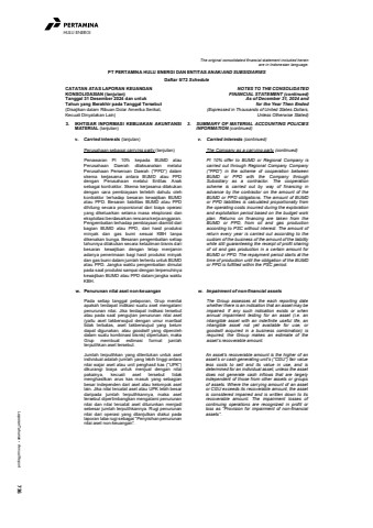 Laporan Tahunan %u2022 Annual Report 736HULU ENERGIThe original consolidated financial statement included hereinare in Indonesian language.PT PERTAMINA HULU ENERGI DAN ENTITAS ANAK/AND SUBSIDIARIESDaftar 5/72 ScheduleCATATAN ATAS LAPORAN KEUANGANKONSOLIDASIAN (lanjutan)Tanggal 31 Desember 2024 dan untukTahun yang Berakhir pada Tanggal Tersebut(Disajikan dalam Ribuan Dolar Amerika Serikat,Kecuali Dinyatakan Lain)NOTES TO THE CONSOLIDATEDFINANCIAL STATEMENT (continued)As of December 31, 2024 andfor the Year Then Ended(Expressed in Thousands of United States Dollars,Unless Otherwise Stated)3. IKHTISAR INFORMASI KEBIJAKAN AKUNTANSIMATERIAL (lanjutan)3. SUMMARY OF MATERIAL ACCOUNTING POLICIESINFORMATION (continued)v. Carried interests (lanjutan) v. Carried interests (continued)Perusahaan sebagai carrying party (lanjutan) The Company as a carrying party (continued)Penawaran PI 10% kepada BUMD atauPerusahaan Daerah dilaksanakan melaluiPerusahaan Perseroan Daerah (%u201cPPD%u201d) dalamskema kerjasama antara BUMD atau PPDdengan Perusahaan melalui Entitas Anaksebagai kontraktor. Skema kerjasama dilakukandengan cara pembiayaan terlebih dahulu olehkontraktor terhadap besaran kewajiban BUMDatau PPD. Besaran liabilitas BUMD atau PPDdihitung secara proporsional dari biaya operasiyang dikeluarkan selama masa eksplorasi daneksploitasi berdasarkan rencana kerja anggaran.Pengembalian terhadap pembiayaan diambil daribagian BUMD atau PPD, dari hasil produksiminyak dan gas bumi sesuai KBH tanpadikenakan bunga. Besaran pengembalian setiaptahunnya dilakukan secara kelaziman bisnis daribesaran kewajiban dengan tetap menjaminadanya penerimaan bagi hasil produksi minyakdan gas bumi dalam jumlah tertentu untuk BUMDatau PPD. Jangka waktu pengembalian dimulaipada saat produksi sampai dengan terpenuhinyakewajiban BUMD atau PPD dalam jangka waktuKBH.PI 10% offer to BUMD or Regional Company iscarried out through Regional Company Company(\BUMD or PPD with the Company throughSubsidiary as a contractor. The cooperationscheme is carried out by way of financing inadvance by the contractor on the amount of theBUMD or PPD obligations. The amount of BUMDor PPD liabilities is calculated proportionally fromthe operating costs incurred during the explorationand exploitation period based on the budget workplan. Returns on financing are taken from theBUMD or PPD, from oil and gas productionaccording to PSC without interest. The amount ofreturn every year is carried out according to thecustom of the business of the amount of the liabilitywhile still guaranteeing the receipt of profit sharingof oil and gas production in a certain amount forBUMD or PPD. The repayment period starts at thetime of production until the obligation of the BUMDor PPD is fulfilled within the PSC period.w. Penurunan nilai aset non-keuangan w. Impairment of non-financial assetsPada setiap tanggal pelaporan, Grup menilaiapakah terdapat indikasi suatu aset mengalamipenurunan nilai. Jika terdapat indikasi tersebutatau pada saat pengujian penurunan nilai aset(yaitu aset takberwujud dengan umur manfaattidak terbatas, aset takberwujud yang belumdapat digunakan, atau goodwill yang diperolehdalam suatu kombinasi bisnis) diperlukan, makaGrup membuat estimasi formal jumlahterpulihkan aset tersebut.The Group assesses at the each reporting datewhether there is an indication that an asset may beimpaired. If any such indication exists or whenannual impairment testing for an asset (i.e. anintangible asset with an indefinite useful life, anintangible asset not yet available for use, orgoodwill acquired in a business combination) isrequired, the Group makes an estimate of theasset%u2019s recoverable amount.Jumlah terpulihkan yang ditentukan untuk asetindividual adalah jumlah yang lebih tinggi antaranilai wajar aset atau unit penghasil kas (%u201cUPK%u201d)dikurangi biaya untuk menjual dengan nilaipakainya, kecuali aset tersebut tidakmenghasilkan arus kas masuk yang sebagianbesar independen dari aset atau kelompok asetlain. Jika nilai tercatat aset atau UPK lebih besardaripada jumlah terpulihkannya, maka asettersebut dipertimbangkan mengalami penurunannilai dan nilai tercatat aset diturunkan menjadisebesar jumlah terpulihkannya. Rugi penurunannilai dari operasi yang dilanjutkan diakui padalaporan laba rugi sebagai %u201cPenyisihan penurunannilai aset non-keuangan%u201d.An asset%u2019s recoverable amount is the higher of anasset%u2019s or cash generating unit%u2019s (%u201cCGU%u201d) fair valueless costs to sell and its value in use, and isdetermined for an individual asset, unless the assetdoes not generate cash inflows that are largelyindependent of those from other assets or groupsof assets. Where the carrying amount of an assetor CGU exceeds its recoverable amount, the assetis considered impaired and is written down to itsrecoverable amount. The impairment losses ofcontinuing operations are recognized in profit orloss as %u201cProvision for impairment of non-financialassets%u201d.