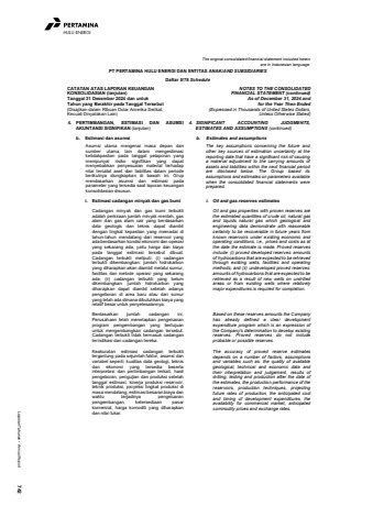 Laporan Tahunan %u2022 Annual Report 742HULU ENERGIThe original consolidated financial statement included hereinare in Indonesian language.PT PERTAMINA HULU ENERGI DAN ENTITAS ANAK/AND SUBSIDIARIESDaftar 5/78 ScheduleCATATAN ATAS LAPORAN KEUANGANKONSOLIDASIAN (lanjutan)Tanggal 31 Desember 2024 dan untukTahun yang Berakhir pada Tanggal Tersebut(Disajikan dalam Ribuan Dolar Amerika Serikat,Kecuali Dinyatakan Lain)NOTES TO THE CONSOLIDATEDFINANCIAL STATEMENT (continued)As of December 31, 2024 andfor the Year Then Ended(Expressed in Thousands of United States Dollars,Unless Otherwise Stated)4. PERTIMBANGAN, ESTIMASI DAN ASUMSIAKUNTANSI SIGNIFIKAN (lanjutan)4. SIGNIFICANT ACCOUNTING JUDGMENTS,ESTIMATES AND ASSUMPTIONS (continued)b. Estimasi dan asumsi b. Estimates and assumptionsAsumsi utama mengenai masa depan dansumber utama lain dalam mengestimasiketidakpastian pada tanggal pelaporan yangmempunyai risiko signifikan yang dapatmenyebabkan penyesuaian material terhadapnilai tercatat aset dan liabilitas dalam periodeberikutnya diungkapkan di bawah ini. Grupmendasarkan asumsi dan estimasi padaparameter yang tersedia saat laporan keuangankonsolidasian disusun.The key assumptions concerning the future andother key sources of estimation uncertainty at thereporting date that have a significant risk of causinga material adjustment to the carrying amounts ofassets and liabilities within the next financial periodare disclosed below. The Group based itsassumptions and estimates on parameters availablewhen the consolidated financial statements wereprepared.i. Estimasi cadangan minyak dan gas bumi i. Oil and gas reserves estimates Cadangan minyak dan gas bumi terbuktiadalah perkiraan jumlah minyak mentah, gasalam dan gas alam cair yang berdasarkandata geologis dan teknis dapat diambildengan tingkat kepastian yang memadai ditahun-tahun mendatang dari reservoir yangada berdasarkan kondisi ekonomi dan operasiyang sekarang ada, yaitu harga dan biayapada tanggal estimasi tersebut dibuat.Cadangan terbukti meliputi: (i) cadanganterbukti dikembangkan: jumlah hidrokarbonyang diharapkan akan diambil melalui sumur,fasilitas dan metode operasi yang sekarangada; (ii) cadangan terbukti yang belumdikembangkan: jumlah hidrokarbon yangdiharapkan dapat diambil setelah adanyapengeboran di area baru atau dari sumuryang telah ada dimana dibutuhkan biaya yangrelatif besar untuk penyelesaiannya. Oil and gas properties with proven reserves arethe estimated quantities of crude oil, natural gasand liquids natural gas which geological andengineering data demonstrate with reasonablecertainty to be recoverable in future years fromknown reservoirs under existing economic andoperating conditions, i.e., prices and costs as atthe date the estimate is made. Proved reservesinclude: (i) proved developed reserves: amountsof hydrocarbons that are expected to be retrievedthrough existing wells, facilities and operatingmethods; and (ii) undeveloped proved reserves:amounts of hydrocarbons that are expected to beretrieved as a result of new wells on undrilledareas or from existing wells where relativelymajor expenditures is required for completion. Berdasarkan jumlah cadangan ini,Perusahaan telah menetapkan pengeluaranprogram pengembangan yang bertujuanuntuk mengembangkan cadangan tersebut.Cadangan terbukti tidak termasuk cadanganterindikasi dan cadangan tereka. Based on these reserves amounts the Companyhas already defined a clear developmentexpenditure program which is an expression ofthe Company's determination to develop existingreserves. Proved reserves do not includeprobable or possible reserves.Keakuratan estimasi cadangan terbuktitergantung pada sejumlah faktor, asumsi danvariabel seperti: kualitas data geologi, teknisdan ekonomi yang tersedia besertainterpretasi dan pertimbangan terkait, hasilpengeboran, pengujian dan produksi setelahtanggal estimasi, kinerja produksi reservoir,teknik produksi, proyeksi tingkat produksi dimasa mendatang, estimasi besaran biaya danwaktu terjadinya pengeluaranpengembangan, ketersediaan pasarkomersial, harga komoditi yang diharapkandan nilai tukar.The accuracy of proved reserve estimatesdepends on a number of factors, assumptionsand variables such as: the quality of availablegeological, technical and economic data andtheir interpretation and judgement, results ofdrilling, testing and production after the date ofthe estimates, the production performance of thereservoirs, production techniques, projectingfuture rates of production, the anticipated costand timing of development expenditures, theavailability for commercial market, anticipatedcommodity prices and exchange rates.