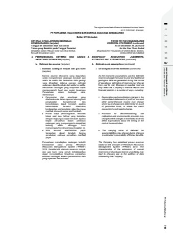 01020304050607 Consolidated Financial Statements Laporan Keaungan Konsolidasian PT Pertamina Hulu Energi 743The original consolidated financial statement included hereinare in Indonesian language.PT PERTAMINA HULU ENERGI DAN ENTITAS ANAK/AND SUBSIDIARIESDaftar 5/79 ScheduleCATATAN ATAS LAPORAN KEUANGANKONSOLIDASIAN (lanjutan)Tanggal 31 Desember 2024 dan untukTahun yang Berakhir pada Tanggal Tersebut(Disajikan dalam Ribuan Dolar Amerika Serikat,Kecuali Dinyatakan Lain)NOTES TO THE CONSOLIDATEDFINANCIAL STATEMENT (continued)As of December 31, 2024 andfor the Year Then Ended(Expressed in Thousands of United States Dollars,Unless Otherwise Stated)4. PERTIMBANGAN, ESTIMASI DAN ASUMSIAKUNTANSI SIGNIFIKAN (lanjutan)4. SIGNIFICANT ACCOUNTING JUDGMENTS,ESTIMATES AND ASSUMPTIONS (continued)b. Estimasi dan asumsi (lanjutan) b. Estimates and assumptions (continued)i. Estimasi cadangan minyak dan gas bumi(lanjutan)i. Oil and gas reserves estimates (continued)Karena asumsi ekonomis yang digunakanuntuk mengestimasi cadangan berubah dariwaktu ke waktu dan tambahan data geologiyang dihasilkan selama operasi, estimasicadangan dapat berubah dari waktu ke waktu.Perubahan cadangan yang dilaporkan dapatmempengaruhi hasil dan posisi keuanganPerusahaan dalam berbagai cara,diantaranya:As the economic assumptions used to estimatereserves change from year to year and additionalgeological data are generated during the courseof operations, estimates of reserves may changefrom year to year. Changes in reported reservesmay affect the Company%u2019s financial results andfinancial position in a number of ways, including: Penyusutan dan amortisasi yangdibebankan ke dalam laporan laba rugi danpenghasilan komprehensif lainkonsolidasian dapat berubah apabilabeban-beban tersebut ditentukanberdasarkan unit produksi, atau jika masamanfaat ekonomi sumur aset berubah.Depreciation and amortization charged in theconsolidated statements of profit or loss andother comprehensive income may changewhere such charges are determined on a unitof production basis, or where the usefuleconomic lives of assets change. Provisi biaya pembongkaran, restorasilokasi aset dan hal-hal yang berkaitandengan lingkungan dapat berubah apabilaterjadi perubahan dalam perkiraancadangan yang mempengaruhi ekspektasitentang waktu sehingga turutmempengaruhi estimasi biaya kegiatan ini.Provision for decommissioning, siterestoration and environmental provision maychange where changes in estimated reservesaffect expectations about the timing or thecost of these activities. Nilai tercatat aset/liabilitas pajaktangguhan dapat berubah karenaperubahan estimasi pemulihan manfaatpajak.The carrying value of deferred taxassets/liabilities may change due to changesin estimated recoverability of the tax benefits.Perusahaan menetapkan cadangan terbuktiberdasarkan pada prinsip PetroleumResources Management System (%u201cPRMS%u201d)2018. Karakteristik alamiah reservoir minyakdan gas bumi yang penuh ketidakpastiandapat menyebabkan terjadinya perubahanestimasi cadangan karena penambahan datayang diperoleh Perusahaan.The Company has establised proven reservesbased on the principle of Petroleum ResourcesManagement System (\characteristics of the estimation of naturalreservoirs of oil and gas reserve uncertainty maylead to changes due to the addition of dataobtained by the Company.