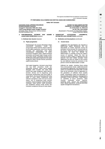 01020304050607 Consolidated Financial Statements Laporan Keaungan Konsolidasian PT Pertamina Hulu Energi 745The original consolidated financial statement included hereinare in Indonesian language.PT PERTAMINA HULU ENERGI DAN ENTITAS ANAK/AND SUBSIDIARIESDaftar 5/81 ScheduleCATATAN ATAS LAPORAN KEUANGANKONSOLIDASIAN (lanjutan)Tanggal 31 Desember 2024 dan untukTahun yang Berakhir pada Tanggal Tersebut(Disajikan dalam Ribuan Dolar Amerika Serikat,Kecuali Dinyatakan Lain)NOTES TO THE CONSOLIDATEDFINANCIAL STATEMENT (continued)As of December 31, 2024 andfor the Year Then Ended(Expressed in Thousands of United States Dollars,Unless Otherwise Stated)4. PERTIMBANGAN, ESTIMASI DAN ASUMSIAKUNTANSI SIGNIFIKAN (lanjutan)4. SIGNIFICANT ACCOUNTING JUDGMENTS,ESTIMATES AND ASSUMPTIONS (continued)b. Estimasi dan Asumsi (lanjutan) b. Estimates and Assumptions (continued)iii. Pajak penghasilan iii. Income taxesPertimbangan dan asumsi dibutuhkan dalammenentukan penyisihan modal danpengurangan beban tertentu selama estimasiprovisi pajak penghasilan untuk Grup. Banyaktransaksi dan perhitungan yang dapatmenyebabkan ketidakpastian di dalampenentuan kewajiban pajak. Apabila terdapatperbedaan perhitungan pajak dengan jumlahyang telah dicatat, perbedaan tersebut akanberdampak pada pajak penghasilan dan pajaktangguhan dalam periode dimana penentuanpajak tersebut dibuat.Judgement and assumptions are required indetermining capital allowances and thedeductibility of certain expenses during theestimation of the provision for income taxes forthe Group. There are many transactions andcalculations for which the ultimate taxdetermination is uncertain during the ordinarycourse of business. Where the final taxoutcome of these matters is different from theamounts that were initially recorded, thesedifferences will have an impact on the incometax and deferred income tax provisions in theperiod in which the determination is made.Aset pajak tangguhan, termasuk yang timbuldari rugi fiskal, penyisihan modal danperbedaan temporer, diakui hanya apabiladianggap lebih mungkin dari pada tidakbahwa aset pajak tangguhan dapat diterimakembali, dimana hal ini tergantung padakecukupan pembentukan laba kena pajak dimasa depan. Asumsi pembentukan laba kenapajak di masa depan bergantung padaestimasi manajemen untuk arus kas di masadepan. Hal ini bergantung pada estimasiproduksi, volume penjualan, harga komoditas,cadangan, biaya operasi, biaya penutupandan rehabilitasi, belanja modal, dividen dantransaksi manajemen lainnya di masa depan.Deferred tax assets, including those arisingfrom unrecouped tax losses, capital allowancesand temporary differences, are recognized onlywhere it is considered more likely than not thatthey will be recovered, which is dependent onthe generation of sufficient future taxableprofits. Assumptions about the generation offuture taxable profits depend on management%u2019sestimates of future cash flows. These dependon estimates of future production, salesvolumes, commodity prices, reserves,operating costs, closure and rehabilitationcosts, capital expenditure, dividends and othercapital management transactions.