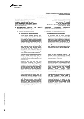 Laporan Tahunan %u2022 Annual Report 746HULU ENERGIThe original consolidated financial statement included hereinare in Indonesian language.PT PERTAMINA HULU ENERGI DAN ENTITAS ANAK/AND SUBSIDIARIESDaftar 5/82 ScheduleCATATAN ATAS LAPORAN KEUANGANKONSOLIDASIAN (lanjutan)Tanggal 31 Desember 2024 dan untukTahun yang Berakhir pada Tanggal Tersebut(Disajikan dalam Ribuan Dolar Amerika Serikat,Kecuali Dinyatakan Lain)NOTES TO THE CONSOLIDATEDFINANCIAL STATEMENT (continued)As of December 31, 2024 andfor the Year Then Ended(Expressed in Thousands of United States Dollars,Unless Otherwise Stated)4. PERTIMBANGAN, ESTIMASI DAN ASUMSIAKUNTANSI SIGNIFIKAN (lanjutan)4. SIGNIFICANT ACCOUNTING JUDGMENTS,ESTIMATES AND ASSUMPTIONS (continued)b. Estimasi dan asumsi (lanjutan) b. Estimates and assumptions (continued)iv. Penurunan nilai aset non-keuangan iv. Impairment of non-financial assetsSesuai dengan kebijakan akuntansi Grup,setiap aset atau unit penghasil kas dievaluasipada setiap periode pelaporan untukmenentukan ada tidaknya indikasi penurunannilai aset. Jika terdapat indikasi tersebut, akandilakukan perkiraan atas nilai aset yang dapatdipulihkan kembali dan kerugian akibatpenurunan nilai akan diakui sebesar selisihantara nilai tercatat aset dengan nilai yangdapat dipulihkan kembali dari aset tersebut.Jumlah nilai yang dapat dipulihkan kembalidari sebuah aset atau kelompok asetpenghasil kas diukur berdasarkan nilai yanglebih tinggi antara nilai wajar dikurangi biayauntuk menjual dan perhitungan nilai pakai.In accordance with the Group accountingpolicies, each asset or cash generating unit isevaluated every reporting period to determinewhether there are any indications of impairment.If any such indication exists, a formal estimate ofthe recoverable amount is performed and animpairment loss recognized to the extent that thecarrying amount exceeds the recoverableamount. The recoverable amount of an asset orcash generating unit is measured at the higherof fair value less costs to sell and value in use.Aset yang memiliki masa manfaat yang takterbatas, seperti goodwill atau aset takberwujud yang belum siap untuk digunakan,tidak diamortisasi dan diuji setiap tahun untukpenurunan nilai.Assets that have an indefinite useful life - forexample, goodwill or intangible assets not readyto use - are not subject to amortization and aretested annually for impairment.Penentuan nilai wajar dan nilai pakaimembutuhkan manajemen untuk membuatestimasi dan asumsi atas produksi yangdiharapkan dan volume penjualan, hargakomoditas (mempertimbangkan harga saat inidan masa lalu, tren harga dan faktor-faktorterkait), cadangan (lihat %u201cEstimasi Cadangan%u201ddi atas), biaya operasi, biaya pembongkarandan restorasi serta belanja modal di masadepan.The determination of fair value and value in userequires management to make estimates andassumptions about expected production andsales volumes, commodity prices (consideringcurrent and historical prices, price trends andrelated factors), reserves (see %u201cReserveestimates%u201d above), operating costs,decommissioning and site restoration costs andfuture capital expenditure.Estimasi dan asumsi ini terpapar risiko danketidakpastian; sehingga ada kemungkinanperubahan situasi dapat mengubah proyeksiini, yang dapat mempengaruhi nilai aset yangdapat dipulihkan kembali. Dalam keadaanseperti itu, sebagian atau seluruh nilai tercatataset mungkin akan mengalami penurunannilai lebih lanjut atau terjadi pengurangan rugipenurunan nilai yang dampaknya akan dicatatdalam laporan laba rugi.These estimates and assumptions are subject torisk and uncertainty; hence there isa possibility that changes in circumstances willalter these projections, which may impact therecoverable amount of the assets. In suchcircumstances, some or all of the carrying valueof the assets may be further impaired, or theimpairment charge reduced, with impactrecorded in the profit or loss.