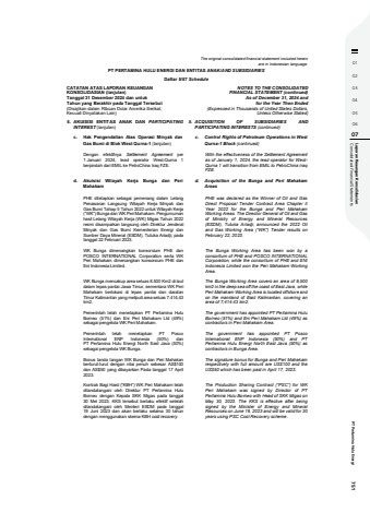 01020304050607 Consolidated Financial Statements Laporan Keaungan Konsolidasian PT Pertamina Hulu Energi 751The original consolidated financial statement included hereinare in Indonesian language.PT PERTAMINA HULU ENERGI DAN ENTITAS ANAK/AND SUBSIDIARIESDaftar 5/87 ScheduleCATATAN ATAS LAPORAN KEUANGANKONSOLIDASIAN (lanjutan)Tanggal 31 Desember 2024 dan untukTahun yang Berakhir pada Tanggal Tersebut(Disajikan dalam Ribuan Dolar Amerika Serikat,Kecuali Dinyatakan Lain)NOTES TO THE CONSOLIDATEDFINANCIAL STATEMENT (continued)As of December 31, 2024 andfor the Year Then Ended(Expressed in Thousands of United States Dollars,Unless Otherwise Stated)5. AKUISISI ENTITAS ANAK DAN PARTICIPATINGINTEREST (lanjutan)5. ACQUISITION OF SUBSIDIARIES ANDPARTICIPATING INTERESTS (continued)c. Hak Pengendalian Atas Operasi Minyak danGas Bumi di Blok West Qurna-1 (lanjutan)c. Control Rights of Petroleum Operations in WestQurna-1 Block (continued)Dengan efektifnya Settlement Agreement per1 Januari 2024, lead operator West-Qurna 1berpindah dari EMIL ke PetroChina Iraq FZE.With the effectiveness of the Settlement Agreementas of January 1, 2024, the lead operator for WestQurna 1 will transition from EMIL to PetroChina IraqFZE.d. Akuisisi Wilayah Kerja Bunga dan PeriMahakamd. Acquisition of the Bunga and Peri MahakamAreasPHE ditetapkan sebagai pemenang dalam LelangPenawaran Langsung Wilayah Kerja Minyak danGas Bumi Tahap II Tahun 2022 untuk Wilayah Kerja(%u201cWK%u201d) Bunga dan WK Peri Mahakam. Pengumumanhasil Lelang Wilayah Kerja (WK) Migas Tahun 2022resmi disampaikan langsung oleh Direktur JenderalMinyak dan Gas Bumi Kementerian Energi danSumber Daya Mineral (ESDM), Tutuka Ariadji, padatanggal 22 Februari 2023.PHE was declared as the Winner of Oil and GasDirect Proposal Tender Contract Area Chapter IIYear 2022 for the Bunga and Peri MahakamWorking Areas. The Director General of Oil and Gasof Ministry of Energy and Mineral Resources(ESDM), Tutuka Ariadji, announced the 2022 Oiland Gas Working Area (%u201dWK%u201d) Tender results onFebruary 22, 2023.WK Bunga dimenangkan konsorsium PHE danPOSCO INTERNATIONAL Corporation serta WKPeri Mahakam dimenangkan konsorsium PHE danEni Indonesia Limited.The Bunga Working Area has been won by aconsortium of PHE and POSCO INTERNATIONALCorporation, while the consortium of PHE and ENIIndonesia Limited won the Peri Mahakam WorkingArea.WK Bunga mencakup area seluas 8.500 Km2 di lautdalam lepas pantai Jawa Timur, sementara WK PeriMahakam berlokasi di lepas pantai dan daratanTimur Kalimantan yang meliputi area seluas 7.414,43km2.The Bunga Working Area covers an area of 8,500km2 in the deep sea off the coast of East Java, whilePeri Mahakam Working Area is located offshore andon the mainland of East Kalimantan, covering anarea of 7,414.43 km2.Pemerintah telah menetapkan PT Pertamina HuluBorneo (51%) dan Eni Peri Mahakam Ltd (49%)sebagai pengelola WK Peri Mahakam.The government has appointed PT Pertamina HuluBorneo (51%) and Eni Peri Mahakam Ltd (49%) ascontractors in Peri Mahakam Area.Pemerintah telah menetapkan PT PoscoInternational ENP Indonesia (50%) danPT Pertamina Hulu Energi North East Java (50%)sebagai pengelola WK Bunga.The government has appointed PT PoscoInternational ENP Indonesia (50%) and PTPertamina Hulu Energi North East Java (50%) ascontractors in Bunga Area.Bonus tanda tangan WK Bunga dan Peri Mahakanberturut-turut dengan nilai penuh sebesar AS$100dan AS$50 yang dibayarkan Pada tanggal 17 April2023.The signature bonus for Bunga and Peri Mahakamrespectively with full amount are US$100 and theUS$50 which has been paid in April 17, 2023.Kontrak Bagi Hasil (%u201cKBH%u201d) WK Peri Mahakam telahditandatangani oleh Direktur PT Pertamina HuluBorneo dengan Kepala SKK Migas pada tanggal30 Mei 2023. KKS tersebut berlaku efektif setelahditandatangani oleh Menteri ESDM pada tanggal19 Juni 2023 dan akan berlaku selama 30 tahundengan menggunakan skema KBH cost recovery.The Production Sharing Contract (%u201dPSC%u201d) for WKPeri Mahakam was signed by Director of PTPertamina Hulu Borneo with Head of SKK Migas onMay 30, 2023. The KKS is effective after beingsigned by the Minister of Energy and MineralResources on June 19, 2023 and will be valid for 30years using PSC Cost Recovery scheme.