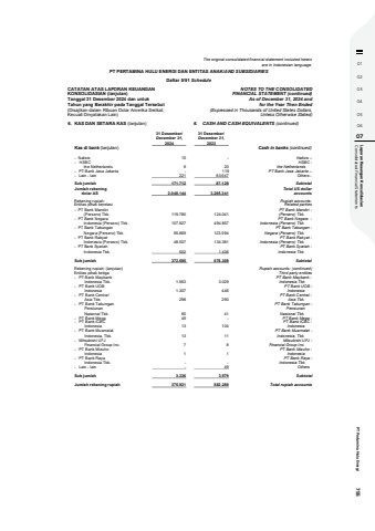 01020304050607 Consolidated Financial Statements Laporan Keaungan Konsolidasian PT Pertamina Hulu Energi 755The original consolidated financial statement included hereinare in Indonesian language.PT PERTAMINA HULU ENERGI DAN ENTITAS ANAK/AND SUBSIDIARIESDaftar 5/91 ScheduleCATATAN ATAS LAPORAN KEUANGANKONSOLIDASIAN (lanjutan)Tanggal 31 Desember 2024 dan untukTahun yang Berakhir pada Tanggal Tersebut(Disajikan dalam Ribuan Dolar Amerika Serikat,Kecuali Dinyatakan Lain)NOTES TO THE CONSOLIDATEDFINANCIAL STATEMENT (continued)As of December 31, 2024 andfor the Year Then Ended(Expressed in Thousands of United States Dollars,Unless Otherwise Stated)6. KAS DAN SETARA KAS (lanjutan) 6. CASH AND CASH EQUIVALENTS (continued) 31 Desember/ 31 Desember/December 31, December 31,2024 2023Kas di bank (lanjutan) Cash in banks (continued) - Natixis 15 - Natixis %u2013 - HSBC HSBC - the Netherlands 9 20 the Netherlands- PT Bank Jasa Jakarta - 119 PT Bank Jasa Jakarta %u2013- Lain - lain 221 83.647 Others -Sub jumlah 171.712 87.129 Subtotal Jumlah rekening Total US dollar dolar AS 2.048.144 3.285.341 accountsRekening rupiah: Rupiah accounts:Entitas pihak berelasi Related parties - PT Bank Mandiri PT Bank Mandiri - (Persero) Tbk. 119.780 124.041 (Persero) Tbk. - PT Bank Negara PT Bank Negara - Indonesia (Persero) Tbk. 107.927 494.857 Indonesia (Persero) Tbk. - PT Bank Tabungan PT Bank Tabungan - Negara (Persero) Tbk. 95.869 123.594 Negara (Persero) Tbk. - PT Bank Rakyat PT Bank Rakyat - Indonesia (Persero) Tbk. 48.507 134.381 Indonesia (Persero) Tbk. - PT Bank Syariah PT Bank Syariah - Indonesia Tbk. 502 1.436 Indonesia Tbk.Sub jumlah 372.585 878.309 SubtotalRekening rupiah: (lanjutan) Rupiah accounts: (continued)Entitas pihak ketiga Third party entities- PT Bank Maybank PT Bank Maybank - Indonesia Tbk. 1.563 3.029 Indonesia Tbk- PT Bank UOB PT Bank UOB - Indonesia 1.307 446 Indonesia- PT Bank Central PT Bank Central - Asia Tbk. 298 290 Asia Tbk.- PT Bank Tabungan PT Bank Tabungan - Pensiunan Pensiunan Nasional Tbk. 85 41 Nasional Tbk.- PT Bank Mega 49 - PT Bank Mega -- PT Bank ICBC PT Bank ICBC - Indonesia 13 104 Indonesia- PT Bank Muamalat PT Bank Muamalat - Indonesia, Tbk. 13 11 Indonesia, Tbk.- Mitsubishi UFJ Mitsubishi UFJ - Financial Group Inc. 7 8 Financial Group Inc.- PT Bank Mizuho PT Bank Mizuho - Indonesia 1 1 Indonesia- PT Bank Raya PT Bank Raya - Indonesia Tbk. - - Indonesia Tbk- Lain - lain - 49 OthersSub jumlah 3.336 3.979 Subtotal Jumlah rekening rupiah 375.921 882.288 Total rupiah accounts