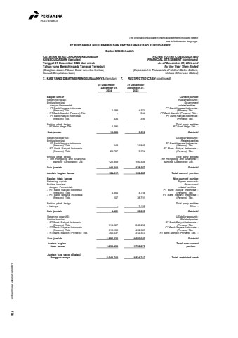 Laporan Tahunan %u2022 Annual Report 758HULU ENERGIThe original consolidated financial statement included hereinare in Indonesian language.PT PERTAMINA HULU ENERGI DAN ENTITAS ANAK/AND SUBSIDIARIESDaftar 5/94 ScheduleCATATAN ATAS LAPORAN KEUANGANKONSOLIDASIAN (lanjutan)Tanggal 31 Desember 2024 dan untukTahun yang Berakhir pada Tanggal Tersebut(Disajikan dalam Ribuan Dolar Amerika Serikat,Kecuali Dinyatakan Lain)NOTES TO THE CONSOLIDATEDFINANCIAL STATEMENT (continued)As of December 31, 2024 andfor the Year Then Ended(Expressed in Thousands of United States Dollars,Unless Otherwise Stated)7. KAS YANG DIBATASI PENGGUNAANNYA (lanjutan) 7. RESTRICTED CASH (continued)31 Desember/ 31 Desember/December 31, December 31,2024 2023Bagian lancar Current portionRekening rupiah: Rupiah accounts:Entitas berelasi Government dengan Pemerintah related entities - PT Bank Negara Indonesia PT Bank Negara Indonesia - (Persero) Tbk. 5.589 4.571 (Persero) Tbk.- PT Bank Mandiri (Persero) Tbk. - 544 PT Bank Mandiri (Persero) Tbk. -- PT Bank Rakyat Indonesia PT Bank Rakyat Indonesia - (Persero) Tbk. 334 395 (Persero) Tbk.Entitas pihak ketiga Third party entities- PT Bank Mega Tbk. 4.280 - PT Bank Mega Tbk. -Sub jumlah 10.203 5.510 SubtotalRekening dolar AS: US dollar accounts:Entitas berelasi Related parties- PT Bank Negara Indonesia PT Bank Negara Indonesia - (Persero) Tbk. 448 21.869 (Persero) Tbk.- PT Bank Rakyat Indonesia PT Bank Rakyat Indonesia - (Persero) Tbk. 20.707 5.724 (Persero) Tbk.Entitas pihak ketiga Third party entities- The Hongkong and Shanghai The Hongkong and Shanghai - Banking Corporation Ltd. 122.859 100.434 Banking Corporation Ltd.Sub jumlah 144.014 128.027 SubtotalJumlah bagian lancar 154.217 133.537 Total current portionBagian tidak lancar Non-current portionRekening rupiah: Rupiah accounts:Entitas berelasi Government dengan Pemerintah related entities- PT Bank Rakyat Indonesia PT Bank Rakyat Indonesia - (Persero) Tbk. 4.354 4.734 (Persero) Tbk.- PT Bank Negara Indonesia PT Bank Negara Indonesia - (Persero) Tbk. 107 38.701 (Persero) Tbk.Entitas pihak ketiga Third party entities- Lainnya - 7.190 Other -Sub jumlah 4.461 50.625 SubtotalRekening dolar AS: US dollar accounts:Entitas berelasi Related parties- PT Bank Rakyat Indonesia PT Bank Rakyat Indonesia - (Persero) Tbk. 914.227 845.250 (Persero) Tbk.- PT Bank Negara Indonesia PT Bank Negara Indonesia - (Persero) Tbk. 616.169 492.387 (Persero) Tbk.- PT Bank Mandiri (Persero) Tbk. 355.637 312.413 PT Bank Mandiri (Persero) Tbk. -Sub jumlah 1.886.032 1.650.050 SubtotalJumlah bagian Total non-current tidak lancar 1.890.493 1.700.675 portionJumlah kas yang dibatasi Penggunaannya 2.044.710 1.834.212 Total restricted cash