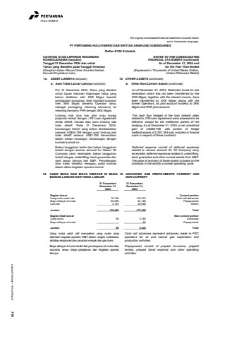 Laporan Tahunan %u2022 Annual Report 770HULU ENERGIThe original consolidated financial statement included hereinare in Indonesian language.PT PERTAMINA HULU ENERGI DAN ENTITAS ANAK/AND SUBSIDIARIESDaftar 5/106 ScheduleCATATAN ATAS LAPORAN KEUANGANKONSOLIDASIAN (lanjutan)Tanggal 31 Desember 2024 dan untukTahun yang Berakhir pada Tanggal Tersebut(Disajikan dalam Ribuan Dolar Amerika Serikat,Kecuali Dinyatakan Lain)NOTES TO THE CONSOLIDATEDFINANCIAL STATEMENT (continued)As of December 31, 2024 andfor the Year Then Ended(Expressed in Thousands of United States Dollars,Unless Otherwise Stated)14. ASSET LAINNYA (lanjutan) 14. OTHER ASSETS (continued)b. Aset Tidak Lancar Lainnya (lanjutan) b. Other Non-Current Assets (continued)Per 31 Desember 2024, Dana yang dibatasiuntuk tujuan restorasi lingkungan hidup yangbelum dialihkan oleh SKK Migas besertapendapatan bunganya, telah dipindah-bukukanoleh SKK Migas (beserta Operator lama,sebagai pemegang rekening bersama) kerekening bersama PHR dengan SKK Migas.As of December 31, 2024, Restricted funds for siterestoration which has not been transferred by theSKK Migas, together with the interest income, havebeen transferred by SKK Migas (along with theformer Operators, as joint account holders) to SKKMigas and PHR joint account.Lindung nilai arus kas atas suku bungapinjaman terkait dengan JTB Loan Agreementdinilai efektif, kecuali atas porsi lindung nilaitidak efektif. Pada 31 Desember 2024,keuntungan bersih yang belum direalisasikansebesar AS$50.769 dengan porsi lindung nilaitidak efektif sebesar AS$1.395 dimasukkandalam beban keuangan sehubungan dengankontrak-kontrak ini.The cash flow hedges of the loan interest ratesrelated to JTB Loan Agreement were assessed to beeffective, except for the ineffective portion of thehedging. As at December 31, 2024, a net unrealizedgain of US$50,769, with portion of hedgeineffectiveness of US$1,395 was included in financecosts in respect of these contracts.Beban tangguhan terdiri dari beban tangguhanterkait dengan escrow account for Gabon OilCompany carry receivable, beban tangguhanterkait dengan underlifting, bank guarantee danaset lancar lainnya dari M&P. Penyelesaianatas saldo tersebut mengacu pada kontrakdalam siklus kegiatan operasi normal.Deferred expense consist of deferred expensesrelated to escrow account for Oil Company carryreceivable, deferred expenses related to underlifting,bank guarantee and other current assets from M&P.The pace of recovery of these assets is based on thecontracts in the activity%u2019s normal operating cycle.15. UANG MUKA DAN BIAYA DIBAYAR DI MUKABAGIAN LANCAR DAN TIDAK LANCAR15. ADVANCES AND PREPAYMENTS CURRENT ANDNON-CURRENT 31 Desember/ 31 Desember/December 31, December 31,2024 2023Bagian lancar Current portionUang muka cash call 76.196 132.275 Cash call advancesBiaya dibayar di muka 99.099 24.188 PrepaymentsLain-lain 4.133 20.966 OthersJumlah 179.428 177.429 TotalBagian tidak lancar Non-current portionUang muka 56 2.180 AdvancesBiaya dibayar di muka - 62 PrepaymentsJumlah 56 2.242 TotalUang muka cash call merupakan uang muka yangdiberikan kepada operator KBH dalam rangka melakukanaktivitas eksplorasi dan produksi minyak dan gas bumi.Cash call advances represent advances made to PSCoperators for oil and natural gas exploration andproduction activities.Biaya dibayar di muka terdiri dari pembayaran di muka atasasuransi, sewa, biaya perjalanan dan kegiatan operasilainnya.Prepayments consist of prepaid insurance, prepaidrentals, prepaid travel expense and other operatingactivities.