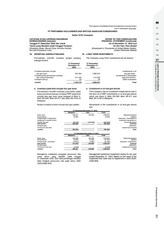 01020304050607 Consolidated Financial Statements Laporan Keaungan Konsolidasian PT Pertamina Hulu Energi 771The original consolidated financial statement included hereinare in Indonesian language.PT PERTAMINA HULU ENERGI DAN ENTITAS ANAK/AND SUBSIDIARIESDaftar 5/107 ScheduleCATATAN ATAS LAPORAN KEUANGANKONSOLIDASIAN (lanjutan)Tanggal 31 Desember 2024 dan untukTahun yang Berakhir pada Tanggal Tersebut(Disajikan dalam Ribuan Dolar Amerika Serikat,Kecuali Dinyatakan Lain)NOTES TO THE CONSOLIDATEDFINANCIAL STATEMENT (continued)As of December 31, 2024 andfor the Year Then Ended(Expressed in Thousands of United States Dollars,Unless Otherwise Stated)16. INVESTASI JANGKA PANJANG 16. LONG TERM INVESTMENTSPerusahaan memiliki investasi jangka panjangsebagai berikut:The Company Long Term investments are as follows: 31 Desember/ 31 Desember/December 31, December 31,2024 2023Investasi pada blok minyak Investments in oil dan gas bumi 591.684 1.088.520 and gas blockInvestasi pada perusahaan asosiasi Investments in associates dan ventura bersama 511.425 514.238 and joint ventureInvestasi lainnya 63 63 Other InvestmentJumlah 1.103.172 1.602.821 Totala. Investasi pada blok minyak dan gas bumi a. Investment in oil and gas blocksPerusahaan memiliki investasi yang diukur padabiaya perolehan berupa investasi PIEP pada blokminyak dan gas bumi yang terdapat di Blok K,Blok SK-309, Blok SK-311 dan Blok SK-314A diMalaysia.The Company has an investment measured at cost inthe form of a PIEP investments in oil and gas blockswhich are block K, Blok SK-309, Blok SK-311 andBlok SK-314A in Malaysia.Mutasi investasi di blok minyak dan gas adalah: Movements in the investments in oil and gas blocksare:31 Desember/December 31, 2024Malaysia Iraq TotalSaldo awal 609.421 479.099 1.088.520 Beginning balancePenambahan 45.966 - 45.966 AdditionPengurangan: Penghentian Deduction: Termination ofpengakuan investasi di blok investment recognition inminyak dan gas (63.703) (479.099) (542.802) oil and gas blocksSub jumlah 591.684 - 591.684 SubtotalPengurangan: Deduction: Penurunan nilai aset - - - Impairment of assets Jumlah 591.684 - 591.684 Total 31 Desember/December 31, 2023Malaysia Iraq TotalSaldo awal 633.589 387.036 1.020.625 Beginning balancePenambahan 53.909 97.630 151.539 AdditionPengurangan: Amortisasi (75.814) (5.567) (81.381) Deduction: AmortizationSub jumlah 611.684 479.099 1.090.783 SubtotalPengurangan: Deduction: Penurunan nilai aset (2.263) - (2.263) Impairment of assets Jumlah 609.421 479.099 1.088.520 TotalManajemen melakukan pengujian penurunan nilaiuntuk tahun yang berakhir pada tanggal31 Desember 2024. Dari hasil perhitungan tersebuttidak terdapat penurunan nilai pada tahun 2024(2023:AS$2.263).Management performed impairment testing for the yearended December 31, 2024. Based on the result of theimpairment test, there was no impairment in 2024 (2023:US$2,263).
