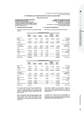 01020304050607 Consolidated Financial Statements Laporan Keaungan Konsolidasian PT Pertamina Hulu Energi 773The original consolidated financial statement included hereinare in Indonesian language.PT PERTAMINA HULU ENERGI DAN ENTITAS ANAK/AND SUBSIDIARIESDaftar 5/109 ScheduleCATATAN ATAS LAPORAN KEUANGANKONSOLIDASIAN (lanjutan)Tanggal 31 Desember 2024 dan untukTahun yang Berakhir pada Tanggal Tersebut(Disajikan dalam Ribuan Dolar Amerika Serikat,Kecuali Dinyatakan Lain)NOTES TO THE CONSOLIDATEDFINANCIAL STATEMENT (continued)As of December 31, 2024 andfor the Year Then Ended(Expressed in Thousands of United States Dollars,Unless Otherwise Stated)17. ASET MINYAK DAN GAS BUMI 17. OIL AND GAS PROPERTIESPergerakan properti minyak dan gas adalah sebagaiberikut:Movements of oil and gas properties are as follows: 31 Desember/December 31, 2024 Pengalihan/ Saldo awal/ Reklasifikasi/ Saldo akhir/Beginning Penambahan/ Pengurangan/ Koreksi/ Transfers/ Endingbalance Additions Deductions Correction Reclassifications balanceBiaya perolehan Acquisition costSumur 23.249.731 174.558 (123.262) 230.508 3.262.035 26.793.570 WellsInstalasi 10.156.174 8.463 (1.531) (306.912) 1.061.235 10.917.429 InstallationsSignature dan production Signature and productionbonus 1.046.763 102 (20.000) 7.998 - 1.034.863 bonusesSub jumlah 34.452.668 183.123 (144.793) (68.406) 4.323.270 38.745.862 SubtotalAset dalam pembangunan Assets under constructionSumur evaluasi Evaluation and dan eksplorasi 1.019.467 231.940 (59.752) 127.496 (373.141) 946.010 exploration wellsSumur pengembangan 2.305.780 3.531.179 (99.679) 493.193 (3.950.129) 2.280.344 Development wellsJumlah 37.777.915 3. 946.242 (304.224) 552.283 - 41.972.216 TotalAkumulasi depresiasi Accumulated depreciationSumur (14.302.659) (1.499.233) 8.808 (400.447) - (16.193.531) WellsInstalasi (5.037.802) (637.452) 549 243.633 - (5.431.072) InstallationsSignature dan production Signature and productionbonus (174.774) (50.400) 12.025 13.097 - (200.052) bonusesJumlah (19.515.235) (2.187.085) 21.382 (143.717) - (21.824.655) TotalPenyisihan penurunan nilai (2.132.390) (220.899) 5.350 105.527 - (2.242.412) Provision for impairmentNilai Buku Neto 16.130.290 17.905.149 Net Book Value 31 Desember/December 31, 2023 Pengalihan/ Saldo awal/ Reklasifikasi/ Saldo akhir/Beginning Penambahan/ Pengurangan/ Koreksi/ Transfers/ Endingbalance Additions Deductions Correction Reclassifications balanceBiaya perolehan Acquisition costSumur 20.193.673 321.855 (1.858) (35.110) 2.771.171 23.249.731 WellsInstalasi 9.148.313 9.244 - (34.391) 1.033.008 10.156.174 InstallationsSignature dan production Signature and productionbonus 1.067.882 1.630 - (22.749) - 1.046.763 bonusesSub jumlah 30.409.868 332.729 (1.858) (92.250) 3.804.179 34.452.668 SubtotalAset dalam pembangunan Assets under constructionSumur evaluasi Evaluation and dan eksplorasi 465.780 632.978 (26.753) 1.973 (54.511) 1.019.467 exploration wellsSumur pengembangan 3.037.415 3.185.054 (73.861) (93.160) (3.749.668) 2.305.780 Development wellsJumlah 33.913.063 4.150.761 (102.472) (183.437) - 37.777.915 TotalAkumulasi depresiasi Accumulated depreciationSumur (12.738.544) (1.882.700) - 318.585 - (14.302.659) WellsInstalasi (4.251.427) (635.781) - (150.594) - (5.037.802) InstallationsSignature dan production Signature and productionbonus (122.853) (51.781) - (140) - (174.774) bonusesJumlah (17.112.824) (2.570.262) - 167.851 - (19.515.235) TotalPenyisihan penurunan nilai (1.428.443) (707.087) - 3.140 - (2.132.390) Provision for impairmentNilai Buku Neto 15.371.796 16.130.290 Net Book ValuePenyusutan, deplesi dan amortisasi yang dibebankanke beban pokok penjualan untuk periode yangberakhir 31 Desember 2024 dan 31 Desember 2023secara masing-masing adalah AS$2.187.085 danAS$2.570.262.Depreciation, depletion and amortization charged tocost of goods sold ended December 31, 2024 andDecember 31, 2023 respectively are US$2,187,085 andUS$2,570.262.Pada 31 Desember 2024, terdapat kapitalisasi atasbiaya pinjaman atas fasilitas pembiayaan proyekpengembangan JTB. Jumlah biaya pinjaman yangdikapitalisasi ke aset tetap sebesar AS$2.277 (2023:AS$11.321).In December 31, 2024, there is a capitalization ofborrowing costs for financing facilities for JTB projectdevelopment. Total borrowing costs capitalized to fixedasset are US$2,277 (2023: US$11,321).
