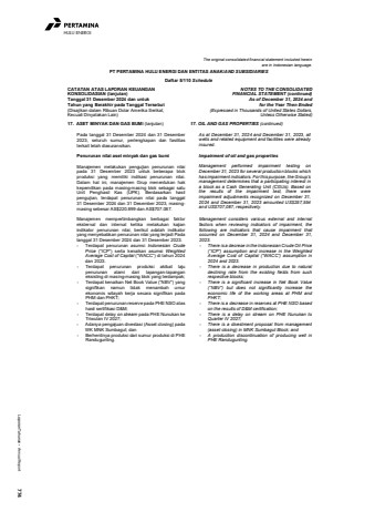 Laporan Tahunan %u2022 Annual Report 774HULU ENERGIThe original consolidated financial statement included hereinare in Indonesian language.PT PERTAMINA HULU ENERGI DAN ENTITAS ANAK/AND SUBSIDIARIESDaftar 5/110 ScheduleCATATAN ATAS LAPORAN KEUANGANKONSOLIDASIAN (lanjutan)Tanggal 31 Desember 2024 dan untukTahun yang Berakhir pada Tanggal Tersebut(Disajikan dalam Ribuan Dolar Amerika Serikat,Kecuali Dinyatakan Lain)NOTES TO THE CONSOLIDATEDFINANCIAL STATEMENT (continued)As of December 31, 2024 andfor the Year Then Ended(Expressed in Thousands of United States Dollars,Unless Otherwise Stated)17. ASET MINYAK DAN GAS BUMI (lanjutan) 17. OIL AND GAS PROPERTIES (continued)Pada tanggal 31 Desember 2024 dan 31 Desember2023, seluruh sumur, perlengkapan dan fasilitasterkait telah diasuransikan.As at December 31, 2024 and December 31, 2023, allwells and related equipment and facilities were alreadyinsured.Penurunan nilai aset minyak dan gas bumi Impairment of oil and gas propertiesManajemen melakukan pengujian penurunan nilaipada 31 Desember 2023 untuk beberapa blokproduksi yang memiliki indikasi penurunan nilai.Dalam hal ini, manajemen Grup menentukan hakkepemilikan pada masing-masing blok sebagai satuUnit Penghasil Kas (UPK). Berdasarkan hasilpengujian, terdapat penurunan nilai pada tanggal31 Desember 2024 dan 31 Desember 2023, masingmasing sebesar AS$220.899 dan AS$707.087.Management performed impairment testing onDecember 31, 2023 for several production blocks whichhas impairment indicators. For this purpose, the Group%u2019smanagement determines that a participating interest ina block as a Cash Generating Unit (CGUs). Based onthe results of the impairment test, there wereimpairment adjustments recognized on December 31,2024 and December 31, 2023 amounted US$257,554and US$707,087, respectively.Manajemen mempertimbangkan berbagai faktoreksternal dan internal ketika melakukan kajianindikator penurunan nilai, berikut adalah indikatoryang menyebabkan penurunan nilai yang terjadi Padatanggal 31 Desember 2024 dan 31 Desember 2023.- Terdapat penurunan asumsi Indonesian CrudePrice (%u201cICP%u201d) serta kenaikan asumsi WeightedAverage Cost of Capital (%u201cWACC%u201d) di tahun 2024dan 2023.- Terdapat penurunan produksi akibat lajupenurunan alami dari lapangan-lapanganeksisting di masing-masing blok yang terdampak;- Terdapat kenaikan Net Book Value (%u201cNBV%u201d) yangsignifikan namun tidak menambah umurekonomis wilayah kerja secara signifikan padaPHM dan PHKT;- Terdapat penurunan reserve pada PHE NSO atashasil sertifikasi D&M;- Terdapat delay on stream pada PHE Nunukan keTriwulan IV 2027;- Adanya pengajuan divestasi (Asset closing) padaWK MNK Sumbagut; dan- Berhentinya produksi dari sumur produksi di PHERandugunting.Management considers various external and internalfactors when reviewing indicators of impairment, thefollowing are indicators that cause impairment thatoccurred on December 31, 2024 and December 31,2023.- There is a decrese in the Indonesian Crude Oil Price(%u201cICP%u201d) assumption and increase in the WeightedAverage Cost of Capital (%u201cWACC%u201d) assumption in2024 and 2023.- There is a decrease in production due to naturaldeclining rate from the existing fields from suchrespective blocks;- There is a significant increase in Net Book Value(%u201cNBV%u201d) but does not significantly increase theeconomic life of the working areas at PHM andPHKT;- There is a decrease in reserves at PHE NSO basedon the results of D&M certification;- There is a delay on stream on PHE Nunukan toQuarter IV 2027;- There is a divestment proposal from management(asset closing) in MNK Sumbagut Block; and- A production discontinuation of producing well inPHE Randugunting.