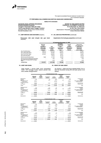 Laporan Tahunan %u2022 Annual Report 776HULU ENERGIThe original consolidated financial statement included hereinare in Indonesian language.PT PERTAMINA HULU ENERGI DAN ENTITAS ANAK/AND SUBSIDIARIESDaftar 5/112 ScheduleCATATAN ATAS LAPORAN KEUANGANKONSOLIDASIAN (lanjutan)Tanggal 31 Desember 2024 dan untukTahun yang Berakhir pada Tanggal Tersebut(Disajikan dalam Ribuan Dolar Amerika Serikat,Kecuali Dinyatakan Lain)NOTES TO THE CONSOLIDATEDFINANCIAL STATEMENT (continued)As of December 31, 2024 andfor the Year Then Ended(Expressed in Thousands of United States Dollars,Unless Otherwise Stated)17. ASET MINYAK DAN GAS BUMI (lanjutan) 17. OIL AND GAS PROPERTIES (continued)Penurunan nilai aset minyak dan gas bumi(lanjutan)Impairment of oil and gas properties (continued)31 Desember/December 31, 2023Estimasijumlahterpulihkan/EstimatedrecoverableamountNilaitercatat/CarryingamountKerugian/(pemulihan)penurunannilai/Impairment/(recovery)lossJumlahsaldogoodwill/OutstandinggoodwillamountPenurunan/(pemulihan) nilaipada aset/Impairment/(recovery)loss on assetBlok PHM/PHM Block 969.913 1.240.740 270.827 - 270.827Blok OSES/OSES Block 225.245 454.060 228.815 - 228.815Blok PHKT/PHKT Block 407.347 499.954 92.607 - 92.607Blok NSO/NSO Block - 59.124 59.124 - 59.124Blok Nunukan/Nunukan Block 7.866 61.169 53.303 - 53.303Blok Randugunting/Randugunting Block - 1.194 1.194 - 1.194Blok MNK Sumbagut/MNK SumbagutBlock - 1.218 1.218 - 1.218Jumlah/Total 1.610.371 2.317.459 707.088 - 707.08818. ASET HAK GUNA 18. RIGHT OF USE ASSET Pada tanggal 1 Januari 2020, Grup menerapkanPSAK 116, sehingga mutasi selama periode satutahun adalah sebagai berikut:On January 1, 2020, the Group adopted SFAS 116, sothat the movement during the one year period is asfollows:31 Desember/December 31, 2024beban dibayarSaldo dimuka/Saldo awal/ transisi/ prepaid Saldo akhir/Beginning Transition Penambahan/ Koreksi/ expense EndingBalance balance Additions Correction reclassifications balanceBiaya perolehan Acquisition costsHak tanah 545 - 101 (397) - 249 Land rightsBangunan 138.213 8.581 (8.814) (63) 137.917 BuildingsTanki, instalasi pipa dan Tanks, pipeline installations peralatan lainnya 445.054 - - (66.368) - 378.686 and other equipmentKapal terbang dan kapal laut 272.062 - 13.837 (1.061) - 284.838 Ships and aircraftAset bergerak 278.998 - - (55.244) (387) 223.367 Moveable assetsJumlah 1.134.872 - 22.519 (131.884) (450) 1.025.057 TotalAkumulasi depresiasi Accumulated depreciationHak tanah (369) (146) 393 - (122) Land rightsBangunan (115.845) (16.695) 8.278 388 (123.874) BuildingsTanki, instalasi pipa dan Tanks, pipeline installations peralatan lainnya (390.094) 59.120 1.127 - (329.847) and other equipmentKapal terbang dan kapal laut (215.855) (120.201) 96.458 - (239.598) Ships and aircraftAset bergerak (209.330) (29.250) 30.578 363 (207.639) Moveable assetsJumlah (931.493) (107.172) 136.834 751 (901.080) TotalNilai buku neto 203.379 123.977 Net book value 31 Desember/December 31, 2023beban dibayarSaldo dimuka/Saldo awal/ transisi/ prepaid Saldo akhir/Beginning Transition Penambahan/ Koreksi/ expense EndingBalance balance Additions Correction reclassifications balanceBiaya perolehan Acquisition costsHak tanah 505 - 188 (148 ) - 545 Land rightsBangunan 141.996 - 3.177 (6.960 ) - 138.213 BuildingsTanki, instalasi pipa dan Tanks, pipeline installations peralatan lainnya 427.503 - 10.104 7.447 - 445.054 and other equipmentKapal terbang dan kapal laut 342.589 - (36.852 ) (33.675 ) - 272.062 Ships and aircraftAset bergerak 263.614 - 14.493 891 - 278.998 Moveable assetsJumlah 1.176.207 - (8.890 ) (32.445 ) - 1.134.872 TotalAkumulasi depresiasi Accumulated depreciationHak tanah (340) - (181 ) 152 - (369 ) Land rightsBangunan (103.261) - (19.701 ) 7.117 - (115.845 ) BuildingsTanki, instalasi pipa dan Tanks, pipeline installations peralatan lainnya (356.283) - (33.866 ) 55 - (390.094 ) and other equipmentKapal terbang dan kapal laut (221.743) - (27.882 ) 33.770 - (215.855 ) Ships and aircraftAset bergerak (164.093) - (46.380 ) 1.143 - (209.330 ) Moveable assetsJumlah (845.720) - (128.010 ) 42.237 - (931.493 ) TotalNilai buku neto 330.487 203.379 Net book value