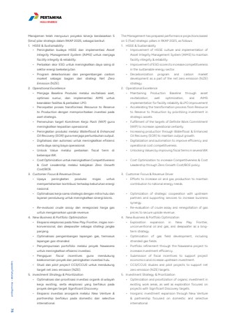 Manajemen telah menyusun proyeksi kinerja berdasarkan 5 (lima) pilar strategis dalam RKAP 2025, sebagai berikut:1. HSSE & Sustainability%u2022 Peningkatan budaya HSSE dan implementasi Asset Integrity Management System (AIMS) untuk menjaga facility integrity & reliability.%u2022 Perbaikan skor ESG untuk meningkatkan daya saing di sektor energi berkelanjutan.%u2022 Program dekarbonisasi dan pengembangan carbon market sebagai bagian dari strategi Net Zero Emission (NZE).2. Operational Excellence%u2022 Menjaga Baseline Produksi melalui revitalisasi aset, optimasi sumur, dan implementasi AIMS untuk keandalan fasilitas & perbaikan LPO.%u2022 Percepatan proses transformasi Resource to Reserve to Production dengan memprioritaskan investasi pada aset strategis.%u2022 Pemenuhan target Komitmen Kerja Pasti (KKP) guna meningkatkan kepastian operasional.%u2022 Peningkatan produksi melalui Waterflood & Enhanced Oil Recovery (EOR) guna menjaga pertumbuhan output.%u2022 Digitalisasi dan automasi untuk meningkatkan efisiensi serta daya saing biaya operasional.%u2022 Unlock Value melalui perbaikan fiscal term di beberapa WK.%u2022 Cost Optimization untuk meningkatkan Competitiveness& Cost Leadership melalui kebijakan Zero Growth Cost/BOE.3. Customer Focus & Revenue Driver%u2022 Upaya peningkatan produksi migas untuk mempertahankan kontribusi terhadap kebutuhan energi nasional.%u2022 Optimalisasi kerja sama strategis dengan mitra hulu dan layanan pendukung untuk meningkatkan sinergi bisnis.%u2022 Re-evaluasi crude assay dan renegosiasi harga gas untuk mengamankan upside revenue.4. New Business & Portfolio Optimization%u2022 Ekspansi eksplorasi pada New Play Frontier, migas nonkonvensional, dan deepwater sebagai strategi jangka panjang.%u2022 Optimalisasi pengembangan lapangan gas, termasuk lapangan gas stranded.%u2022 Penyempurnaan portofolio melalui proyek Nawasena untuk meningkatkan efisiensi investasi.%u2022 Pengajuan fiscal incentives guna mendukung keekonomian proyek dan peningkatan investasi hulu.%u2022 Studi dan pilot project CCS/CCUS untuk mendukung target net zero emission (NZE).5. Investment Strategy & Prioritization%u2022 Optimalisasi dan prioritisasi investasi organik di wilayah kerja existing, serta eksplorasi yang berfokus pada proyek dengan target Significant Discovery.%u2022 Ekspansi investasi anorganik melalui New Venture & partnership berfokus pada domestic dan selective international.The Management has prepared performance projections based on 5 (five) strategic pillars in RKAP 2025, as follows:1. HSSE & Sustainability%u2022 Improvement of HSSE culture and implementation of Asset Integrity Management System (AIMS) to maintain facility integrity & reliability.%u2022 Improvement of ESG scores to increase competitiveness in the sustainable energy sector.%u2022 Decarbonization program and carbon market development as a part of the net zero emission (NZE) strategy.2. Operational Excellence%u2022 Maintaining Production Baseline through asset revitalization, well optimization, and AIMS implementation for facility reliability & LPO improvement%u2022 Accelerating the transformation process from Resource to Reserve to Production by prioritizing investment in strategic assets.%u2022 Fulfillment of the targets of Definite Work Commitment (KKP) to increase operational certainty.%u2022 Increasing production through Waterflood & Enhanced Oil Recovery (EOR) to maintain output growth.%u2022 Digitalization and automation to improve efficiency and operational cost competitiveness.%u2022 Unlocking Values by improving fiscal terms in several WK%u2022 Cost Optimization to increase Competitiveness & Cost Leadership through Zero Growth Cost/BOE policy.3. Customer Focus & Revenue Driver%u2022 Efforts to increase oil and gas production to maintain contribution to national energy needs.%u2022 Optimization of strategic cooperation with upstream partners and supporting services to increase business synergy.%u2022 Re-evaluation of crude assay and renegotiation of gas prices to secure upside revenue.4. New Business & Portfolio Optimization%u2022 Exploration expansion in New Play Frontier, unconventional oil and gas, and deepwater as a longterm strategy.%u2022 Optimization of gas field development, including stranded gas fields.%u2022 Portfolio refinement through the Nawasena project to increase investment efficiency.%u2022 Submission of fiscal incentives to support project economics and increase upstream investment.%u2022 CCS/CCUS studies and pilot projects to support net zero emission (NZE) targets.5. Investment Strategy & Prioritization%u2022 Optimization and prioritization of organic investment in existing work areas, as well as exploration focused on projects with Significant Discovery targets.%u2022 Inorganic investment expansion through New Venture & partnership focused on domestic and selective international.HULU ENERGILaporan Tahunan %u2022 Annual Report 76PT Pertamina Hulu Energi 77
