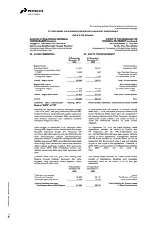 Laporan Tahunan %u2022 Annual Report 778HULU ENERGIThe original consolidated financial statement included hereinare in Indonesian language.PT PERTAMINA HULU ENERGI DAN ENTITAS ANAK/AND SUBSIDIARIESDaftar 5/114 ScheduleCATATAN ATAS LAPORAN KEUANGANKONSOLIDASIAN (lanjutan)Tanggal 31 Desember 2024 dan untukTahun yang Berakhir pada Tanggal Tersebut(Disajikan dalam Ribuan Dolar Amerika Serikat,Kecuali Dinyatakan Lain)NOTES TO THE CONSOLIDATEDFINANCIAL STATEMENT (continued)As of December 31, 2024 andfor the Year Then Ended(Expressed in Thousands of United States Dollars,Unless Otherwise Stated)20. UTANG PEMERINTAH 20. DUE TO THE GOVERNMENT 31 Desember/ 31 Desember/December 31, December 31,2024 2023Bagian lancar: Current portion:Overlifting & DMO 51.427 24.607 Overlifting & DMOPenerimaan Negara Bukan Pajak (%u201cPNBP) 2.886 (962) Non- Tax State RevenueLiabilitas atas sewa pembiayaan Finance lease payables Barang Milik Negara 2.583 2.329 on State-Owned AssetsJumlah - bagian lancar 56.896 25.974 Total - Current portionBagian tidak lancar: Non-current portion:Liabilitas atas sewa pembiayaan Finance lease liabilities Barang Milik Negara 61.242 66.792 on State-Owned Assets Lain-lain 670 670 OtherJumlah - bagian tidak lancar 61.912 67.462 Total - Non - current portionJumlah 118.808 93.436 TotalLiabilitas sewa pembiayaan - Barang MilikNegara (%u201cBMN%u201d) di PEPFinance lease liabilities - state-owned assets in PEPBerdasarkan Keputusan Menteri Keuangan tanggal2 Mei 2008, aset - aset yang sebelumnya dimiliki olehEntitas Pertamina yang tidak diakui dalam saldo awalneraca Perusahaan, merupakan BMN, pengendalianaset tersebut dilakukan oleh Direktorat JenderalKekayaan Negara (%u201cDJKN%u201d).In accordance with the Minister of Finance Decreedated May 2, 2008, the assets previously owned by theformer Pertamina Entity which were not recognized inthe opening balance sheet of the Company, representstate-owned assets (%u201cBMN%u201d), the control of which isunder the Directorate General of State Assets(%u201cDJKN%u201d).Pada tanggal 20 September 2016, Perjanjian SewaBarang Milik Negara antara Kementerian KeuanganRepublik Indonesia dengan PT Pertamina EPNo.PRJ-3-MK.6/2016 danNo.1307/EP0000/2016-S0telah ditandatangani. Dengan ditandatanganinyaperjanjian tersebut, manajemen berkeyakinan bahwaliabilitas sewa untuk BMN yang tidak digunakan tidakakan ditagih oleh Pemerintah karena tidak termasukdalam lingkup perjanjian tersebut. Oleh karena itu,pada tahun 2016, PEP melakukan koreksi atasliabilitas sewa untuk BMN yang tidak digunakan olehPEP.On September 20, 2016, the State Property LeaseAgreements between the Ministry of Finance andPT Pertamina EP No. PRJ-3-MK.6/2016 andNo. 1307/EP0000/2016-S0 have been signed. With thesigning of these agreements, management believesthat the lease liabilities for unutilized BMN, will not becharged by the Government since it was not includedas part of the scope of the agreements. Therefore, in2016, PEP made correction to the BMN lease liabilitiesfor BMN which are not used byPEP.Liabilitas sewa aset hak guna atas Barang MilikNegara meliputi instalasi, bangunan dan hartabergerak yang digunakan dalam kegiatan usahaminyak dan gas bumi Grup.The finance lease liabilities for State-Owned Assetsconsist of installations, buildings and moveableequipment used by the Group in its oil and gasoperations. 31 Desember/ 31 Desember/December 31, December 31,2024 2023Pihak yang menyewakan LessorKementerian Keuangan 63.825 69.121 The Ministry of FinanceDikurangi bagian yang lancar (2.583) (2.329) Less current portionJumlah Liabilitas atas sewa Total Liabilities for Finance Lease Pembiayaan Barang Milik Negara 61.242 66.792 of State-Owned Assets