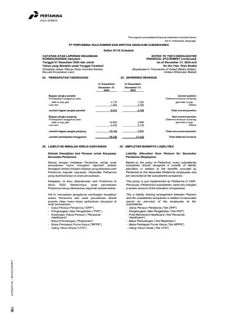 Laporan Tahunan %u2022 Annual Report 782HULU ENERGIThe original consolidated financial statement included hereinare in Indonesian language.PT PERTAMINA HULU ENERGI DAN ENTITAS ANAK/AND SUBSIDIARIESDaftar 5/118 ScheduleCATATAN ATAS LAPORAN KEUANGANKONSOLIDASIAN (lanjutan)Tanggal 31 Desember 2024 dan untukTahun yang Berakhir pada Tanggal Tersebut(Disajikan dalam Ribuan Dolar Amerika Serikat,Kecuali Dinyatakan Lain)NOTES TO THE CONSOLIDATEDFINANCIAL STATEMENT (continued)As of December 31, 2024 andfor the Year Then Ended(Expressed in Thousands of United States Dollars,Unless Otherwise Stated)24. PENDAPATAN TANGGUHAN 24. DEFERRED REVENUE 31 Desember/ 31 Desember/December 31, December 31,2024 2023Bagian jangka pendek Current portionPendapatan tangguhan atas Deferred revenue involvingtake or pay gas 4.718 1.332 gas take or payLain-lain 1.294 2.794 OthersJumlah bagian jangka pendek 6.012 4.126 Total current portionBagian jangka panjang Non-current portionPendapatan tangguhan atas Deferred revenue involvingtake or pay gas 10.800 3.898 gas take or payLain-lain 2.318 3.119 OthersJumlah bagian jangka panjang 13.118 7.017 Total non-current portionJumlah pendapatan tangguhan 19.130 11.143 Total deferred revenue25. LIABILITAS IMBALAN KERJA KARYAWAN 25. EMPLOYEE BENEFITS LIABILITIESAlokasi Kewajiban dari Persero untuk KaryawanSecondee Pertamina:Sesuai dengan kebijakan Pertamina, setiap anakperusahaan harus mengakui sejumlah alokasikewajiban terkait imbalan-imbalan yang diberikan olehPertamina kepada karyawan Secondee Pertaminayang diperbantukan di anak perusahaan.Liability Allocation from Persero for SecondeePertamina Employees:Based on the policy of Pertamina, every subsidiariescompanies should recognize a number of liabilityallocation in relation to the benefits provided byPertamina to the Secondee Pertamina employees whoare seconded at the subsidiaries companies.Kebijakan ini baru diberlakukan oleh Pertamina ditahun 2020. Sebelumnya, anak perusahaanPertamina hanya dibebankan sejumlah alokasi beban.Hal ini merupakan pengaturan pembagian kewajibanantara Pertamina dan anak perusahaan terkaitperiode (atau masa kerja) perbantuan karyawan dianak perusahaan:- Dana Pensiun Pertamina (%u201cDPP%u201d).- Penghargaan Atas Pengabdian (%u201cPAP%u201d).- Kesehatan Pasca Pensiun (%u201cPensionerHealthcare%u201d)- Biaya Pemulangan (%u201cRepatriasi%u201d).- Masa Persiapan Purna Karya (%u201cMPPK%u201d).- Ulang Tahun Dinas (%u201cUTD%u201d).This policy is just implemented by Pertamina in 2020.Previously, Pertamina's subsidiaries were only chargeda certain amount of the allocation of expenses.This a liability sharing arrangement between Perseroand the subsidiaries companies in relation to secondedperiod (or services) of the employees at thesubisidiaries:- Dana Pensiun Pertamina (%u201cthe DPP%u201d).- Penghargaan Atas Pengabdian (%u201cthe PAP%u201d)- Post-Retirement Healthcare (%u201cthe Pensioner Healthcare%u201d)- Biaya Pemulangan (%u201cthe Repatriasi%u201d).- Masa Persiapan Purna Karya (%u201cthe MPPK%u201d).- Ulang Tahun Dinas (%u201cthe UTD%u201d)