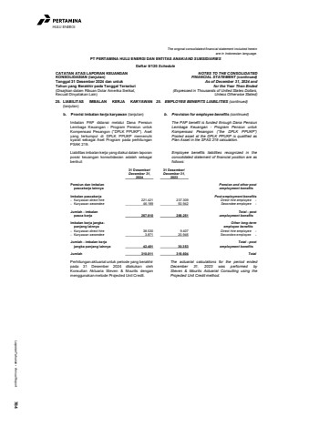 Laporan Tahunan %u2022 Annual Report 784HULU ENERGIThe original consolidated financial statement included hereinare in Indonesian language.PT PERTAMINA HULU ENERGI DAN ENTITAS ANAK/AND SUBSIDIARIESDaftar 5/120 ScheduleCATATAN ATAS LAPORAN KEUANGANKONSOLIDASIAN (lanjutan)Tanggal 31 Desember 2024 dan untukTahun yang Berakhir pada Tanggal Tersebut(Disajikan dalam Ribuan Dolar Amerika Serikat,Kecuali Dinyatakan Lain)NOTES TO THE CONSOLIDATEDFINANCIAL STATEMENT (continued)As of December 31, 2024 andfor the Year Then Ended(Expressed in Thousands of United States Dollars,Unless Otherwise Stated)25. LIABILITAS IMBALAN KERJA KARYAWAN(lanjutan)25. EMPLOYEE BENEFITS LIABILITIES (continued)b. Provisi imbalan kerja karyawan (lanjutan) b. Provision for employee benefits (continued)Imbalan PAP didanai melalui Dana PensiunLembaga Keuangan - Program Pensiun untukKompensasi Pesangon (%u201cDPLK PPUKP%u201d). Asetyang terkumpul di DPLK PPUKP memenuhisyarat sebagai Aset Program pada perhitunganPSAK 219.The PAP benefit is funded through Dana PensiunLembaga Keuangan - Program Pensiun untukKompensasi Pesangon (%u201cthe DPLK PPUKP%u201d)Pooled asset at the DPLK PPUKP is qualified asPlan Asset in the SFAS 219 calculation.Liabilitas imbalan kerja yang diakui dalam laporanposisi keuangan konsolidasian adalah sebagaiberikut:Employee benefits liabilities recognized in theconsolidated statement of financial position are asfollows: 31 Desember/ 31 Desember/December 31, December 31,2024 2023Pensiun dan imbalan Pension and other post pascakerja lainnya -employment benefitsImbalan pascakerja Post-employment benefits- Karyawan direct hire 221.421 237.309 Direct hire employee -- Karyawan secondee 46.189 50.942 Secondee employee -Jumlah - imbalan Total - post pasca kerja 267.610 288.251 -employment benefitsImbalan kerja jangka- Other long-term panjang lainnya employee benefits- Karyawan direct hire 38.530 9.407 Direct hire employee -- Karyawan secondee 3.871 20.946 Secondee employee -Jumlah - imbalan kerja Total - post jangka panjang lainnya 42.401 30.353 employment benefitsJumlah 310.011 318.604 TotalPerhitungan aktuarial untuk periode yang berakhirpada 31 Desember 2024 dilakukan olehKonsultan Aktuaria Steven & Mourits denganmenggunakan metode Projected Unit Credit.The actuarial calculations for the period endedDecember 31, 2023 was performed bySteven & Mourits Actuarial Consulting using theProjected Unit Credit method.