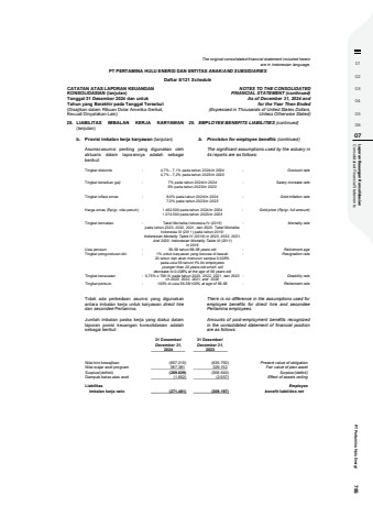 01020304050607 Consolidated Financial Statements Laporan Keaungan Konsolidasian PT Pertamina Hulu Energi 785The original consolidated financial statement included hereinare in Indonesian language.PT PERTAMINA HULU ENERGI DAN ENTITAS ANAK/AND SUBSIDIARIESDaftar 5/121 ScheduleCATATAN ATAS LAPORAN KEUANGANKONSOLIDASIAN (lanjutan)Tanggal 31 Desember 2024 dan untukTahun yang Berakhir pada Tanggal Tersebut(Disajikan dalam Ribuan Dolar Amerika Serikat,Kecuali Dinyatakan Lain)NOTES TO THE CONSOLIDATEDFINANCIAL STATEMENT (continued)As of December 31, 2024 andfor the Year Then Ended(Expressed in Thousands of United States Dollars,Unless Otherwise Stated)25. LIABILITAS IMBALAN KERJA KARYAWAN(lanjutan)25. EMPLOYEE BENEFITS LIABILITIES (continued)b. Provisi imbalan kerja karyawan (lanjutan) b. Provision for employee benefits (continued)Asumsi-asumsi penting yang digunakan olehaktuaris dalam laporannya adalah sebagaiberikut:The significant assumptions used by the actuary inits reports are as follows:Tingkat diskonto : 4,7% - 7,1% pada tahun 2024/in 2024 : Discount rate4,7% - 7,2% pada tahun 2023/in 2023Tingkat kenaikan gaji : 7% pada tahun 2024/in 2024 : Salary increase rate 6% pada tahun 2023/in 2023Tingkat inflasi emas : 8,0% pada tahun 2024/in 2024 : Gold inflation rate7,0% pada tahun 2023/in 2023Harga emas (Rp/gr, nilai penuh) : 1.462.500 pada tahun 2024/in 2024 : Gold price (Rp/gr, full amount)1.074.500 pada tahun 2023/in 2023Tingkat kematian : Tabel Mortalita Indonesia IV (2019) : Mortality ratepada tahun 2023, 2022, 2021, dan 2020. Tabel MortalitaIndonesia III (2011) pada tahun 2019/Indonesian Mortality Table IV (2019) in 2023, 2022, 2021,And 2020. Indonesian Mortality Table III (2011)in 2019Usia pensiun : 56-58 tahun/56-58 years old : Retirement ageTingkat pengunduran diri : 1% untuk karyawan yang berusia di bawah : Resignation rate20 tahun dan akan menurun sampai 0,028%pada usia 56 tahun/1% for employeesyounger than 20 years-old which willdecrease to 0,028% at the age of 56 years oldTingkat kecacatan : 0,75% x TMI IV pada tahun 2023, 2022, 2021, dan 2020 : Disability rate/in 2023, 2022, 2021, and 2020 Tingkat pensiun : 100% di usia 56-58/100% at age of 56-58 : Retirement rateTidak ada perbedaan asumsi yang digunakanantara imbalan kerja untuk karyawan direct hiredan secondee Pertamina.There is no difference in the assumptions used foremployee benefits for direct hire and secondeePertamina employees.Jumlah imbalan paska kerja yang diakui dalamlaporan posisi keuangan konsolidasian adalahsebagai berikut:Amounts of post-employment benefits recognizedin the consolidated statement of financial positionare as follows: 31 Desember/ 31 Desember/December 31, December 31,2024 2023Nilai kini kewajiban (657.210) (635.792) Present value of obligationNilai wajar aset program 387.381 329.152 Fair value of plan assetSurplus/(defisit) (269.829) (306.640) Surplus/(deficit)Dampak batas atas aset (1.652) (2.557) Effect of assets ceilingLiabilitas Employee imbalan kerja neto (271.481) (309.197) benefit liabilities net