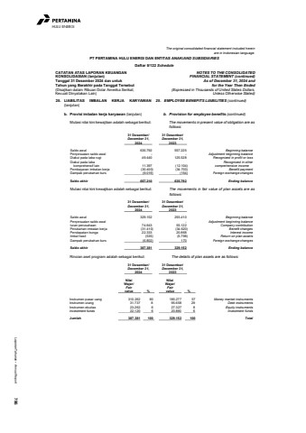 Laporan Tahunan %u2022 Annual Report 786HULU ENERGIThe original consolidated financial statement included hereinare in Indonesian language.PT PERTAMINA HULU ENERGI DAN ENTITAS ANAK/AND SUBSIDIARIESDaftar 5/122 ScheduleCATATAN ATAS LAPORAN KEUANGANKONSOLIDASIAN (lanjutan)Tanggal 31 Desember 2024 dan untukTahun yang Berakhir pada Tanggal Tersebut(Disajikan dalam Ribuan Dolar Amerika Serikat,Kecuali Dinyatakan Lain)NOTES TO THE CONSOLIDATEDFINANCIAL STATEMENT (continued)As of December 31, 2024 andfor the Year Then Ended(Expressed in Thousands of United States Dollars,Unless Otherwise Stated)25. LIABILITAS IMBALAN KERJA KARYAWAN(lanjutan)25. EMPLOYEE BENEFITS LIABILITIES (continued)b. Provisi imbalan kerja karyawan (lanjutan) b. Provision for employee benefits (continued)Mutasi nilai kini kewajiban adalah sebagai berikut: The movements in present value of obligation are asfollows: 31 Desember/ 31 Desember/December 31, December 31,2024 2023Saldo awal 635.792 557.225 Beginning balancePenyesuaian saldo awal - - Adjustment beginning balanceDiakui pada laba rugi 49.440 125.528 Recognized in profit or lossDiakui pada laba Recognized in other komprehensif lain 11.397 (12.104) comprehensive incomePembayaran imbalan kerja (30.400) (34.703) Benefit paymentDampak perubahan kurs (9.019) (154) Foreign exchange changesSaldo akhir 657.210 635.792 Ending balanceMutasi nilai kini kewajiban adalah sebagai berikut: The movements in fair value of plan assets are asfollows: 31 Desember/ 31 Desember/December 31, December 31,2024 2023Saldo awal 329.152 293.410 Beginning balancePenyesuaian saldo awal - Adjustment beginning balanceIuran perusahaan 74.643 55.122 Company contributionPerubahan imbalan kerja (31.410) (34.620) Benefit changesPendapatan bunga 22.333 20.868 Interest incomeImbal hasil (535) (5.798) Return on plan assetsDampak perubahan kurs (6.802) 170 Foreign exchange changesSaldo akhir 387.381 329.152 Ending balanceRincian aset program adalah sebagai berikut: The details of plan assets are as follows: 31 Desember/ 31 Desember/December 31, December 31,2024 2023Nilai Nilai Wajar/ Wajar/Fair Fair value % value %Instrumen pasar uang 310.262 80 185.277 57 Money market instrumentsInstrumen utang 31.737 8 95.658 29 Debt instrumentsInstrumen ekuitas 23.262 6 27.327 8 Equity instrumentsInvestment funds 22.120 6 20.890 6 Investment fundsJumlah 387.381 100 329.152 100 Total