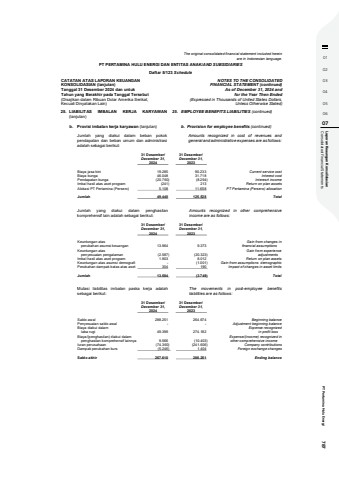 01020304050607 Consolidated Financial Statements Laporan Keaungan Konsolidasian PT Pertamina Hulu Energi 787The original consolidated financial statement included hereinare in Indonesian language.PT PERTAMINA HULU ENERGI DAN ENTITAS ANAK/AND SUBSIDIARIESDaftar 5/123 ScheduleCATATAN ATAS LAPORAN KEUANGANKONSOLIDASIAN (lanjutan)Tanggal 31 Desember 2024 dan untukTahun yang Berakhir pada Tanggal Tersebut(Disajikan dalam Ribuan Dolar Amerika Serikat,Kecuali Dinyatakan Lain)NOTES TO THE CONSOLIDATEDFINANCIAL STATEMENT (continued)As of December 31, 2024 andfor the Year Then Ended(Expressed in Thousands of United States Dollars,Unless Otherwise Stated)25. LIABILITAS IMBALAN KERJA KARYAWAN(lanjutan)25. EMPLOYEE BENEFITS LIABILITIES (continued)b. Provisi imbalan kerja karyawan (lanjutan) b. Provision for employee benefits (continued)Jumlah yang diakui dalam beban pokokpendapatan dan beban umum dan administrasiadalah sebagai berikut:Amounts recognized in cost of revenues andgeneral and administrative expenses are as follows: 31 Desember/ 31 Desember/December 31, December 31,2024 2023Biaya jasa kini 19.285 90.233 Current service costBiaya bunga 46.048 31.718 Interest costPendapatan bunga (20.760) (8.294) Interesrt incomeImbal hasil atas aset program (241) 213 Return on plan assetsAlokasi PT Pertamina (Persero) 5.108 11.658 PT Pertamina (Persero) allocationJumlah 49.440 125.528 TotalJumlah yang diakui dalam penghasilankomprehensif lain adalah sebagai berikut:Amounts recognized in other comprehensiveincome are as follows: 31 Desember/ 31 Desember/December 31, December 31,2024 2023Keuntungan atas Gain from changes in perubahan asumsi keuangan 13.964 9.373 financial assumptionsKeuntungan atas Gain from experience penyesuaian pengalaman (2.587) (20.323) adjustmentsImbal hasil atas aset program 1.903 8.012 Return on plan assetsKeuntungan atas asumsi demografi - (1.001) Gain from assumptions demographicPerubahan dampak batas atas aset 304 190 Impact of changes in asset limitsJumlah 13.584 (3.749) TotalMutasi liabilitas imbalan paska kerja adalahsebagai berikut:The movements in post-employee benefitsliabilities are as follows: 31 Desember/ 31 Desember/December 31, December 31,2024 2023Saldo awal 288.251 264.674 Beginning balancePenyesuaian saldo awal - - Adjustment beginning balanceBiaya diakui dalam Expense recognized laba rugi 49.399 274.182 in profit lossBiaya/(penghasilan) diakui dalam Expense/(income) recognized in penghasilan komprehensif lainnya 9.566 (10.403) other comprehensive incomeIuran perusahaan (74.360) (241.606) Company contributionsDampak perubahan kurs (5.246) 1.404 Foreign exchange changesSaldo akhir 267.610 288.251 Ending balance