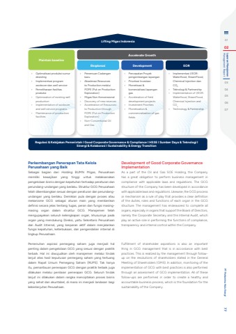 %u2022 Implementasi I/EOR: Waterflood, SteamFlood, Chemical Injection dan CO2%u2022 Teknologi & Partnership%u2022 Implementation of I/EOR: Waterflood, SteamFlood, Chemical Injection and CO2%u2022 Technology & Partnership%u2022 Optimalisasi produksi sumur eksisting%u2022 Implementasi program workover dan well service%u2022 Pemeliharaan fasilitas produksi%u2022 Optimization of existing well production%u2022 Implementation of workover and well service programs%u2022 Maintenance of production facilities%u2022 Penemuan Cadangan baru%u2022 Akselerasi Resources to Production melalui POPE (Put on Production Exploration)%u2022 Migas Non Konvensional%u2022 Discovery of new reserves%u2022 Acceleration of Resources to Production through POPE (Put on Production Exploration)%u2022 Non-Conventional Oil and Gas%u2022 Percepatan Proyek pengembangan lapangan%u2022 Prioritasi Investasi%u2022 Monetisasi & komersialisasi lapangan gas%u2022 Acceleration of field development projects%u2022 Investment Priorities%u2022 Monetization & commercialization of gas fieldsPerkembangan Penerapan Tata Kelola Perusahaan yang BaikSebagai bagian dari Holding BUMN Migas, Perusahaan memiliki kewajiban yang tinggi untuk melaksanakan pengelolaan bisnis dengan kepatuhan terhadap peraturan dan perundang-undangan yang berlaku. Struktur GCG Perusahaan telah dikembangkan sesuai dengan peraturan dan perundangundangan yang berlaku. Demikian pula dengan proses atau mekanisme GCG sebagai aturan main yang memberikan definisi secara jelas tentang tugas, peran dan fungsi masingmasing organ dalam struktur GCG. Manajemen telah mengupayakan seluruh kelengkapan organ, khususnya pada organ yang mendukung Direksi, yaitu Sekretaris Perusahaan dan Audit Internal, yang berperan aktif dalam menjalankan fungsi kepatuhan, keterbukaan, dan pengendalian internal di lingkup Perusahaan.Pemenuhan aspirasi pemegang saham juga menjadi hal penting dalam pengelolaan GCG yang sesuai dengan praktik terbaik. Hal ini diwujudkan oleh manajemen melalui tindak lanjut atas hasil keputusan pemegang saham yang tertuang dalam Rapat Umum Pemegang Saham (RUPS). Tak hanya itu, pemantauan penerapan GCG dengan praktik terbaik juga dilakukan melalui penilaian penerapan GCG. Seluruh tindak lanjut ini dilakukan dalam rangka menciptakan proses bisnis yang sehat dan akuntabel, di mana ini menjadi landasan bagi keberlanjutan Perusahaan.Lifting Migas IndonesiaMaintain baselineAccelerate GrowthRegulasi & Kebijakan Pemerintah I Good Corporate Governance & Compliance I HSSE I Sumber Daya & Teknologi I Sinergi & Kolaborasi I Sustainability & Energy TransitionEksplorasi Development EORDevelopment of Good Corporate Governance ImplementationAs a part of the Oil and Gas SOE Holding, the Company has a great obligation to perform business management in compliance with applicable laws and regulations. The GCG structure of the Company has been developed in accordance with applicable laws and regulations. Likewise, the GCG process or mechanism as a rule of play that provides a clear definition of the duties, roles and functions of each organ in the GCG structure. The management has endeavored to complete all organs, especially in organs that support the Board of Directors, namely the Corporate Secretary and the Internal Audit, which play an active role in performing the functions of compliance, transparency and internal control within the Company.Fulfillment of shareholder aspirations is also an important thing in GCG management that is in accordance with best practices. This is realized by the management through followup on the resolutions of shareholders stated in the General Meeting of Shareholders (GMS). In addition, monitoring of the implementation of GCG with best practices is also performed through an assessment of GCG implementation. All of these follow-ups are performed in order to create a healthy and accountable business process, which is the foundation for the sustainability of the Company.0102 Management Report Laporan Manajemen0304050607Laporan Tahunan %u2022 Annual Report 76PT Pertamina Hulu Energi 77