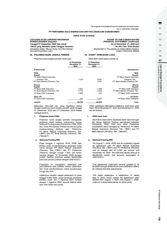 01020304050607 Consolidated Financial Statements Laporan Keaungan Konsolidasian PT Pertamina Hulu Energi 789The original consolidated financial statement included hereinare in Indonesian language.PT PERTAMINA HULU ENERGI DAN ENTITAS ANAK/AND SUBSIDIARIESDaftar 5/125 ScheduleCATATAN ATAS LAPORAN KEUANGANKONSOLIDASIAN (lanjutan)Tanggal 31 Desember 2024 dan untukTahun yang Berakhir pada Tanggal Tersebut(Disajikan dalam Ribuan Dolar Amerika Serikat,Kecuali Dinyatakan Lain)NOTES TO THE CONSOLIDATEDFINANCIAL STATEMENT (continued)As of December 31, 2024 andfor the Year Then Ended(Expressed in Thousands of United States Dollars,Unless Otherwise Stated)26. PINJAMAN BANK JANGKA PENDEK 26. SHORT TERM BANK LOANPinjaman bank jangka pendek terdiri dari: Short-term bank loans consist of: 31 Desember/ 31 Desember/December 31, December 31,2024 2023Entitas Anak SubsidiariesPDSI PDSIRupiah RupiahPT Bank Rakyat Indonesia PT Bank Rakyat Indonesia (Persero) Tbk. 7.724 8.997 (Persero) Tbk.PT Bank Mandiri (Persero) Tbk. 3.491 PT Bank Mandiri (Persero) Tbk.Elnusa ElnusaRupiah RupiahPT Bank UOB Indonesia 2.943 4.368 PT Bank UOB IndonesiaPT Bank Mandiri (Persero) Tbk. 2.778 2.429 PT Bank Mandiri (Persero) Tbk.PT Bank ICBC Indonesia 1.908 623 PT Bank ICBC IndonesiaDolar AS US DollarPT Bank ICBC Indonesia 422 3.671 PT Bank ICBC IndonesiaJumlah 15.775 23.579 TotalBeberapa informasi lain yang signifikan terkaitdengan pinjaman bank jangka pendek pada tanggal31 Desember 2024 dan 31 Desember 2023 adalahsebagai berikut:Other significant information related to short-term bankloans As of December 31, 2024 and December 31, 2023are as follows:1. Pinjaman bank PDSI 1. PDSI bank loanPinjaman bank jangka pendek merupakanpinjaman bank melalui mekanisme GroupNotional Pooling antara Pertamina, PDSI, PDCdan Anak Perusahaan Pertamina lainnya yangmasing-masing dikelola oleh Pertamina,PT Bank Rakyat Indonesia (Persero) Tbk.(%u201cBRI%u201d) dan PT Bank Mandiri (Persero) Tbk.(%u201cMandiri%u201d).Short-term bank loans represent bank loans throughthe Group Notional Pooling mechanism betweenPertamina, PDSI, PDC and other Pertaminasubsidiaries each managed by Pertamina, PT BankRakyat Indonesia (Persero) Tbk. (%u201cBRI%u201d) and PTBank Mandiri (Persero) Tbk. (%u201cMandiri%u201d).a. Notional Pooling BRI a. Notional Pooling BRIPada tanggal 1 Agustus 2019, PDSI danEntitas anak menandatangani perjanjian kerjasama dengan PT Bank Rakyat Indonesia(Persero) Tbk. (%u201cBRI%u201d) dan PT Pertamina(Persero) dengan bunga 7,25% per tahunsampai dengan 16 November 2020 denganjumlah fasilitas pinjaman adalah Rp300.000juta (nilai penuh) (setara dengan AS$19.431).Perjanjian ini mengalami beberapa kalipemutakhiran atas fasilitas melalui addendumdan surat pemberitahuan untuk penyesuaianbunga dan limit.On August 1, 2019, PDSI and its subsidiary signedan agreement with PT Bank Rakyat Indonesia(Persero) Tbk. (%u201cBRI%u201d) and PT Pertamina (Persero)with an interest rate of 7.25% per annum untilNovember 16, 2020. The total loan facility amount isRp300,000 million (full amount) (equivalent toUS$19,431).This agreement underwent several updates to itsfacilities through addendums and notification lettersfor interest and limit adjustments.Addendum terakhir adalah addendum IV padatanggal 8 Mei 2024, yang membuat perjanjianberlaku mulai dari 1 Agustus 2024 sampaidengan 1 Agustus 2029, kecuali diakhiri lebihdulu oleh salah satu pihak.The latest addendum is addendum IV datedMay 8, 2024, which makes the agreement validstarted from August 1, 2024 until August 1, 2029,unless it is terminated earlier by either party.