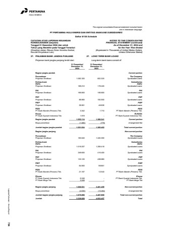 Laporan Tahunan %u2022 Annual Report 794HULU ENERGIThe original consolidated financial statement included hereinare in Indonesian language.PT PERTAMINA HULU ENERGI DAN ENTITAS ANAK/AND SUBSIDIARIESDaftar 5/130 ScheduleCATATAN ATAS LAPORAN KEUANGANKONSOLIDASIAN (lanjutan)Tanggal 31 Desember 2024 dan untukTahun yang Berakhir pada Tanggal Tersebut(Disajikan dalam Ribuan Dolar Amerika Serikat,Kecuali Dinyatakan Lain)NOTES TO THE CONSOLIDATEDFINANCIAL STATEMENT (continued)As of December 31, 2024 andfor the Year Then Ended(Expressed in Thousands of United States Dollars,Unless Otherwise Stated)27. PINJAMAN BANK JANGKA PANJANG 27. LONG TERM BANK LOANSPinjaman bank jangka panjang terdiri dari: Long-term bank loans consist of: 31 Desember/ 31 Desember/December 31, December 31,2024 2023Bagian jangka pendek Current portionPerusahaan The CompanyPinjaman Sindikasi 1.062.320 822.320 Syndicated LoansEntitas Anak SubsidiariesPEPC PEPCPinjaman Sindikasi 189.212 178.245 Syndicated LoansPHI PHIPinjaman Sindikasi 166.800 166.800 Syndicated LoansPEP PEPPinjaman Sindikasi 88.960 150.560 Syndicated LoansPIEP PIEPPinjaman Sindikasi 39.561 46.606 Syndicated LoansPDSI PDSIPT Bank Mandiri (Persero) Tbk. 3.342 1.710 PT Bank Mandiri (Persero) Tbk.Enusa ELNUSAPT Bank Syariah Indonesia Tbk. 1.919 - PT Bank Syariah Indonesia Tbk.Bagian jangka pendek 1.552.114 1.366.241 Current portionBiaya penerbitan (1.080) (779) Arrangement feeJumlah bagian jangka pendek 1.551.034 1.365.462 Total current portionBagian jangka panjang Non-current portionPerusahaan The CompanyPinjaman Sindikasi 183.040 1.245.360 Syndicated LoansEntitas Anak SubsidiariesPEPC PEPCPinjaman Sindikasi 1.019.207 1.208.418 Syndicated LoansPHI PHIPinjaman Sindikasi 249.600 416.400 Syndicated LoansPEP PEPPinjaman Sindikasi 133.120 498.880 Syndicated LoansPIEP PIEPPinjaman Sindikasi 64.900 99.861 Syndycated LoansPDSI PDSIPT Bank Mandiri (Persero) Tbk. 21.167 12.540 PT Bank Mandiri (Persero) Tbk.Elnusa ElnusaPT Bank Syariah Indonesia Tbk. 6.248 - PT Bank Syariah Indonesia Tbk.PT Bank Mega Tbk. 3.249 - PT Bank Mega TbkBagian jangka panjang 1.680.531 3.481.459 Non-current portionBiaya penerbitan (4.636) (13.464) Arrangement feeJumlah bagian jangka panjang 1.675.895 3.467.995 Total non-current portionJumlah 3.226.929 4.833.457 Total