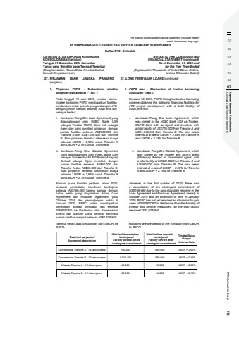 01020304050607 Consolidated Financial Statements Laporan Keaungan Konsolidasian PT Pertamina Hulu Energi 795The original consolidated financial statement included hereinare in Indonesian language.PT PERTAMINA HULU ENERGI DAN ENTITAS ANAK/AND SUBSIDIARIESDaftar 5/131 ScheduleCATATAN ATAS LAPORAN KEUANGANKONSOLIDASIAN (lanjutan)Tanggal 31 Desember 2024 dan untukTahun yang Berakhir pada Tanggal Tersebut(Disajikan dalam Ribuan Dolar Amerika Serikat,Kecuali Dinyatakan Lain)NOTES TO THE CONSOLIDATEDFINANCIAL STATEMENT (continued)As of December 31, 2024 andfor the Year Then Ended(Expressed in Thousands of United States Dollars,Unless Otherwise Stated)27. PINJAMAN BANK JANGKA PANJANG(lanjutan)27. LONG TERM BANK LOANS (continued)1. Pinjaman PEPC - Mekanisme strukturpinjaman wali amanat (%u201cTBS%u201d)1. PEPC loan - Mechanism of trustee borrowingstructure (%u201cTBS%u201d)Pada tanggal 13 Juni 2019, melalui skematrustee borrowing PEPC mendapatkan fasilitaspendanaan untuk proyek pengembangan JTBdengan jumlah fasilitas sebesar AS$1.846.400sebagai berikut:On June 13, 2019, PEPC through a trustee borrowingscheme obtained the following financing facilities forJTB project development with a total facility ofUS$1,846,400:i. Jambaran-Tiung Biru Loan Agreement yangditandatangani oleh HSBC Bank USAsebagai Trustee, MUFG Bank Ltd. sebagaiAgen dan bank pemberi pinjaman, denganjumlah fasilitas sebesar AS$700.000 dariTranche A dan AS$1.046.400 dari TrancheB. Atas pinjaman tersebut dikenakan bungasebesar LIBOR + 2,95% untuk Tranche Adan LIBOR + 2,15% untuk Tranche B.i. Jambaran-Tiung Biru Loan Agreement, whichwas signed by the HSBC Bank USA as Trustee,MUFG Bank Ltd. as Agent and Lenders, witha total facility of US$700,000 from Tranche A andUS$1,046,400 from Tranche B. The loan bearsinterest at a rate of LIBOR + 2.95% for Tranche Aand LIBOR + 2.15% for Tranche B.ii. Jambaran-Tiung Biru Wakala Agreementyang ditandatangani oleh HSBC Bank USAsebagai Trustee dan MUFG Bank (Malaysia)Berhad sebagai Agen Investasi, denganjumlah fasilitas sebesar AS$40.000 dariTranche A dan AS$60.000 dari Tranche B.Atas pinjaman tersebut dikenakan bungasebesar LIBOR + 2,95% untuk Tranche Adan LIBOR + 2,15% untuk Tranche B.ii. Jambaran-Tiung Biru Wakala Agreement, whichwas signed by the Trustee and MUFG Bank(Malaysia) Berhad as Investment Agent, witha total facility of US$40,000 from Tranche A andUS$60,000 from Tranche B. The loan bearsinterest at a rate of LIBOR + 2.95% for TrancheA and LIBOR + 2.15% for Tranche B.Namun, pada triwulan pertama tahun 2020,terdapat pembatalan komitmen kontinjensisebesar AS$166.460 karena sampai denganbatas waktu yang disyaratkan dalam LoanAgreement dan Producer Agreement yaituOktober 2019 dan perpanjangan waktu diJanuari 2020, PEPC belum mendapatkanpenetapan alokasi penjualan gas sebesar20MMSCFD ke Pertamina dari KementerianEnergi dan Sumber Daya Mineral, sehinggajumlah fasilitas menjadi sebesar AS$1.679.940.However, in the first quarter of 2020, there wasa cancellation of the contingent commitment ofUS$166,460 due to the long stop date required in theLoan Agreement and Producer Agreement, namely inOctober 2019 and an extension of time in January2020. PEPC has not yet received an allocation for gassales of 20MMSCFD to Pertamina from the Ministry ofEnergy and Mineral Resources, so the total facilitybecome US$1,679,940. Berikut detail atas perubahan dari LIBOR keSOFR:Following are the details of the transition from LIBORto SOFR:Deskripsi perjanjian/Agreement descriptionNilai fasilitas sebelumkontinjensi/Facility service beforecontingent commitmentNilai fasilitas sesudahkontinjensi/Facility service aftercontingent commitmentTingkat SukuBunga/Interest RateConventional Tranche A - 15 tahun/years 700.000 630.000 LIBOR + 2,95%Conventional Tranche B - 10 tahun/years 1.046.400 959.940 LIBOR + 2,15%Wakala Tranche A - 15 tahun/years 40.000 36.000 LIBOR + 2,95%Wakala Tranche B - 10 tahun/years 60.000 54.000 LIBOR + 2,15%
