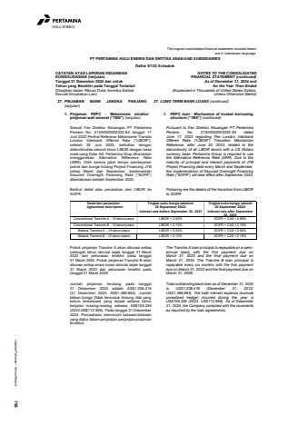 Laporan Tahunan %u2022 Annual Report 796HULU ENERGIThe original consolidated financial statement included hereinare in Indonesian language.PT PERTAMINA HULU ENERGI DAN ENTITAS ANAK/AND SUBSIDIARIESDaftar 5/132 ScheduleCATATAN ATAS LAPORAN KEUANGANKONSOLIDASIAN (lanjutan)Tanggal 31 Desember 2024 dan untukTahun yang Berakhir pada Tanggal Tersebut(Disajikan dalam Ribuan Dolar Amerika Serikat,Kecuali Dinyatakan Lain)NOTES TO THE CONSOLIDATEDFINANCIAL STATEMENT (continued)As of December 31, 2024 andfor the Year Then Ended(Expressed in Thousands of United States Dollars,Unless Otherwise Stated)27. PINJAMAN BANK JANGKA PANJANG(lanjutan)27. LONG TERM BANK LOANS (continued)1. Pinjaman PEPC - Mekanisme strukturpinjaman wali amanat (%u201cTBS%u201d) (lanjutan)1. PEPC loan - Mechanism of trustee borrowingstructure (%u201cTBS%u201d) (continued)Sesuai Fax Direktur Keuangan PT PertaminaPersero No. 213/H00000/2022-S4 tanggal 17Juni 2022 Perihal Referensi Mekanisme TransisiLondon Interbank Offered Rate (%u201dLIBOR%u201d),setelah 30 Juni 2023, berkaitan dengandiskontinuitas seluruh tenor LIBOR dengan basemata uang Dolar AS, Pertamina Grup diharuskanmenggunakan Alternative Reference Rate(ARR). Oleh karena jatuh tempo pembayaranpokok dan bunga hutang Project Financing JTBsetiap Maret dan September, implementasiSecured Overnight Financing Rate (%u201dSOFR%u201d)diberlakukan setelah September 2023.Pursuant to Fax Direktur Keuangan PT PertaminaPersero No. 213/H00000/2022-S4 datedJune 17, 2022 regarding The London InterbankOffered Rate (%u201dLIBOR%u201d) Transition MechanismReference, after June 30, 2023, related to thediscontinuity of all LIBOR tenors with a US Dollarscurrency base, Pertamina Group is required to usethe Alternative Reference Rate (ARR). Due to thematurity of principal and interest payments of JTBProject Financing debt every March and September,the implementation of Secured Overnight FinancingRate (%u201dSOFR%u201d) will take effect after September 2023.Berikut detail atas perubahan dari LIBOR keSOFR:Following are the details of the transition from LIBORto SOFR:Deskripsi perjanjian/Agreement descriptionTingkat suku bunga sebelum30 September 2023/Interest rate before September 30, 2023Tingkat suku bunga setelah30 September 2023/Interest rate after September30, 2023Conventional Tranche A - 15 tahun/years LIBOR + 2,95% SOFR + CAS +2,95%Conventional Tranche B - 10 tahun/years LIBOR + 2,15% SOFR + CAS +2,15%Wakala Tranche A - 15 tahun/years LIBOR + 2,95% SOFR + CAS +2,95%Wakala Tranche B - 10 tahun/years LIBOR + 2,15% SOFR + CAS +2,15%Pokok pinjaman Tranche A akan dilunasi setiapsetengah tahun dimulai sejak tanggal 31 Maret2022 dan pelunasan terakhir pada tanggal31 Maret 2034. Pokok pinjaman Tranche B akandilunasi setiap enam bulan dimulai sejak tanggal31 Maret 2022 dan pelunasan terakhir padatanggal 31 Maret 2029.The Tranche A loan principal is repayable on a semiannual basis with the first payment due onMarch 31, 2022 and the final payment due onMarch 31, 2034. The Tranche B loan principal isrepayable every six months with the first paymentdue on March 31, 2022 and the final payment due onMarch 31, 2029.Jumlah pinjaman terutang pada tanggal31 Desember 2024 adalah AS$1.208.418(31 Desember 2023: AS$1.386.663). Jumlahbeban bunga (tidak termasuk lindung nilai yangbelum terealisasi) yang terjadi selama tahunberjalan masing-masing sebesar AS$105.254(2023:AS$112.995). Pada tanggal 31 Desember2024, Perusahaan memenuhi batasan-batasanyang diatur dalam perjanjian-perjanjian pinjamantersebut.Total outstanding bank loan as of December 31, 2024is US$1,208,418 (December 31, 2023:US$1,386,663). The total interest expense (excludeunrealized hedge) incurred during the year isUS$105.254 (2023: US$112.995). As of December31, 2024, the Company complied with the covenantsas required by the loan agreements.