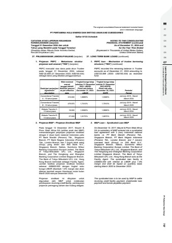 01020304050607 Consolidated Financial Statements Laporan Keaungan Konsolidasian PT Pertamina Hulu Energi 797The original consolidated financial statement included hereinare in Indonesian language.PT PERTAMINA HULU ENERGI DAN ENTITAS ANAK/AND SUBSIDIARIESDaftar 5/133 ScheduleCATATAN ATAS LAPORAN KEUANGANKONSOLIDASIAN (lanjutan)Tanggal 31 Desember 2024 dan untukTahun yang Berakhir pada Tanggal Tersebut(Disajikan dalam Ribuan Dolar Amerika Serikat,Kecuali Dinyatakan Lain)NOTES TO THE CONSOLIDATEDFINANCIAL STATEMENT (continued)As of December 31, 2024 andfor the Year Then Ended(Expressed in Thousands of United States Dollars,Unless Otherwise Stated)27. PINJAMAN BANK JANGKA PANJANG (lanjutan) 27. LONG TERM BANK LOANS (continued)1. Pinjaman PEPC - Mekanisme strukturpinjaman wali amanat (%u201cTBS%u201d) (lanjutan)1. PEPC loan - Mechanism of trustee borrowingstructure (%u201cTBS%u201d) (continued)PEPC mencatat sisa dana pada akun Trusteepada tanggal 31 Desember 2024, sebesarAS$122.859 (31 Desember 2023: AS$100.434)sebagai dana yang dibatasi penggunaannya.PEPC recorded the remaining balance in Trusteeaccounts as of December 31, 2024 amounting toUS$122,859 (2023: US$100,434) as restrictedfund.Deskripsi perjanjian/AgreementdescriptionNilai nosionalsesuaitanggal efektif/Notional amountas per effectivedateTingkat bunga tetapsebelum 31 Desember2023- LIBOR/Fixed rate beforeDecember 31, 2023-LIBORTingkat bunga tetapsetelah 31 Desember2023-SOFR/Fixed rate afterDecember 30, 2023-SOFRPeriode/PeriodConventional TrancheA - 15 tahun/years 315.000 1,8889% 1,9389% Juli/July 2019 - Maret/March 2034Conventional TrancheB - 10 tahun/years 479.970 1,7410% 1,7910% Juli/July 2019 - Maret/March 2029Wakala Tranche A -15 tahun/years 18.000 1,9366% 1,9866% Juli/July 2019 - Maret/March 2034Wakala Tranche B -10 tahun/years 27.000 1,8175% 1,8675% Juli/July 2019 - Maret/March 20292. Pinjaman M&P %u2013 Pinjaman Sindikasi M&P 2. M&P Loan %u2013 Syndicated Loan M&PPada tanggal 12 Desember 2017, Maurel &Prom West Africa SA (entitas anak dari M&P)menandatangani perjanjian pinjaman sindikasidengan 2 (dua) bank nasional Indonesia yaituPT Bank Mandiri (Persero) Tbk., SingaporeBranch, PT Bank Negara Indonesia (Persero)Tbk., London Branch, dan 7 (tujuh) bank asing(Grup) yang terdiri dari ING Bank N.V.,Singapore Branch, Natixis, Sumitomo MitsuiBanking Corporation Europe Limited, The Bankof Tokyo-Mitsubishi UFJ, Ltd., SingaporeBranch, and The Hongkong and ShanghaiBanking Corporation Limited Singapore Branch.The Bank of Tokyo Mitsubishi UFJ, Ltd., HongKong Branch bertindak sebagai Facility Agent.Jumlah fasilitas pinjaman sindikasi tersebutsebesar AS$600.000 dengan tingkat sukubunga LIBOR ditambah 1,5% margin dan akandibayar kembali secara triwulanan mulai bulanMaret 2020 sampai Desember 2023.On December 12, 2017, Maurel & Prom West AfricaSA (a subsidiary of M&P entered into a syndicatedloan agreement with 2 (two) Indonesia nationalbanks i.e. PT Bank Mandiri (Persero) Tbk.,Singapore Branch, PT Bank Negara Indonesia(Persero) Tbk., London Branch, and 7 (seven)overseas bank (Group) i.e. ING Bank N.V.,Singapore Branch, Natixis, Sumitomo MitsuiBanking Corporation Europe Limited, The Bank ofTokyo-Mitsubishi UFJ, Ltd., Singapore Branch, andThe Hongkong and Shanghai Banking CorporationLimited Singapore Branch. The Bank of TokyoMitsubishi UFJ, Ltd., Hong Kong Branch acts as theFacility Agent. The syndicated loan facility isUS$600,000 with interest at LIBOR plus 1.5%margin and shall be repaid on quarterly basisstarting March 2020 to December 2023.Pinjaman sindikasi ini ditujukan untukdigunakan oleh M&P untuk melakukanpembayaran revolving credit facility, pembayaranpinjaman pemegang saham dan hutang obligasi.The syndicated loan is to be used by M&P to settlerevolving credit facility payment, shareholder loanpayment and bonds payables payment.