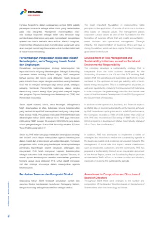 Fondasi terpenting dalam pelaksanaan prinsip GCG adalah penerapan kode etik sebagai etika bisnis yang berlandaskan pada nilai integritas. Manajemen menempatkan nilainilai budaya korporasi sebagai salah satu landasan bagi pembentukan etika bisnis yang akan menciptakan pengelolaan operasi dan bisnis berbasis akuntabilitas. Melalui integritas, implementasi etika bisnis akan memiliki dasar yang kuat, yang akan menjadi modal bagi Perusahaan untuk tumbuh lebih baik di masa-masa mendatang.Perkembangan Pengelolaan Risiko dan Inisiatif Keberlanjutan, serta Tanggung Jawab Sosial dan LingkunganPerusahaan mengembangkan strategi keberlanjutan tak lepas dari bisnis inti yang dikembangkan. Sebagai Subholding Upstream dalam Holding BUMN Migas, PHE menyadari bahwa operasi dan bisnis yang dilakukan masih berpusat pada industri hulu migas dengan ekosistem energi berbasis fosil. Hal ini menjadi tantangan bagi semua pihak, sekaligus peluang, termasuk Pemerintah Indonesia, dalam rangka mendukung transisi energi hijau yang telah menjadi bagian dari program Tujuan Pembangunan Berkelanjutan (TPB) dari Pemerintah Indonesia.Selain aspek operasi, bisnis, serta keuangan sebagaimana telah disampaikan di atas, beberapa kinerja keberlanjutan yang berhasil dicapai PHE menunjukkan hasil yang cukup baik. Pada kinerja HSSE, Perusahaan mencatat TRIR 0,09 lebih baik dibandingkan tahun 2023 sebesar 0,14. PHE juga mencatat ESG rating %u201cBBB%u201d dengan 12 program CCS/CCUS yang dalam status pengembangan. Status Risk Maturitiy sebesar 3,5 atau %u201cFase Praktik yang baik (+)%u201d.Selain itu, PHE telah berupaya melakukan serangkaian strategi dan inisiatif untuk dapat mewujudkan agenda keberlanjutan dalam model dan proses bisnis yang dikembangkan. Termasuk pengelolaan risiko sosial yang berdampak terhadap beberapa pemangku kepentingan seperti karyawan, pelanggan, dan masyarakat. PHE telah menyusun Laporan Keberlanjutan sebagai dokumen tidak terpisahkan dari Laporan Tahunan, di mana Laporan Keberlanjutan tersebut memberikan gambaran tentang upaya yang dilakukan PHE untuk dapat mencapai visi dan misinya khususnya dalam mewujudkan agenda keberlanjutan.Perubahan Susunan dan Komposisi DireksiSepanjang tahun 2024 terdapat perubahan jumlah dan susunan Direksi berdasarkan keputusan Pemegang Saham, dengan kronologi sebagaimana terlihat sebagai berikut.The most important foundation in implementing GCG principles is the application of a code of ethics as a business ethic based on integrity values. The management places corporate cultural values as one of the foundations for the formation of business ethics that will create accountabilitybased business and operational management. Through integrity, the implementation of business ethics will have a strong foundation, which will be a capital for the Company to grow better in the future.Development of Risk Management and Sustainability Initiatives, as well as Social and Environmental ResponsibilityThe company develops a sustainability strategy that is inseparable from the core business developed. As the Subholding Upstream in the Oil and Gas SOE Holding, PHE realizes that the operations and businesses performed remain centered on the upstream oil and gas industry with a fossilbased energy ecosystem. This is a challenge for all parties, as well as an opportunity, including the Government of Indonesia, in order to support the green energy transition that has become a part of the Sustainable Development Goals (SDG) program of the Government of Indonesia.In addition to the operational, business, and financial aspects as stated above, several sustainability performances achieved by PHE have shown quite good results. In HSSE performance, the Company recorded a TRIR of 0.09, better than 2023 of 0.14. PHE also recorded an ESG rating of %u201cBBB%u201d with 12 CCS/CCUS programs in development status. Risk Maturity status of 3.5 or %u201cGood Practice Phase (+)%u201d.In addition, PHE has attempted to implement a series of strategies and initiatives to realize the sustainability agenda in the business models and processes developed. Including the management of social risks that impact several stakeholders such as employees, customers, and the community. PHE has prepared a Sustainability Report as an inseparable document of the Annual Report, where the Sustainability Report provides an overview of PHE's efforts to achieve its vision and missions, especially in realizing the sustainability agenda.Amendment in Composition and Structure of Board of DirectorsThroughout 2024 there were changes in the number and composition of the Board of Directors based on Resolutions of Shareholders, with the chronology as follows.HULU ENERGILaporan Tahunan %u2022 Annual Report 78PT Pertamina Hulu Energi 79