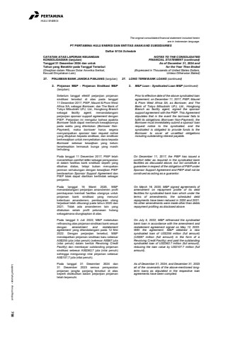 Laporan Tahunan %u2022 Annual Report 798HULU ENERGIThe original consolidated financial statement included hereinare in Indonesian language.PT PERTAMINA HULU ENERGI DAN ENTITAS ANAK/AND SUBSIDIARIESDaftar 5/134 ScheduleCATATAN ATAS LAPORAN KEUANGANKONSOLIDASIAN (lanjutan)Tanggal 31 Desember 2024 dan untukTahun yang Berakhir pada Tanggal Tersebut(Disajikan dalam Ribuan Dolar Amerika Serikat,Kecuali Dinyatakan Lain)NOTES TO THE CONSOLIDATEDFINANCIAL STATEMENT (continued)As of December 31, 2024 andfor the Year Then Ended(Expressed in Thousands of United States Dollars,Unless Otherwise Stated)27. PINJAMAN BANK JANGKA PANJANG (lanjutan) 27. LONG TERM BANK LOANS (continued)2. Pinjaman M&P - Pinjaman Sindikasi M&P(lanjutan)2. M&P Loan - Syndicated Loan M&P (continued)Sebelum tanggal efektif perjanjian pinjamansindikasi tersebut di atas pada tanggal11 Desember 2017, PIEP, Maurel & Prom WestAfrica SA, sebagai Borrower, dan The Bank ofTokyo Mitsubishi UFJ, Ltd., Hongkong Branchsebagai facility agent, menandatanganiperjanjian sponsor support agreement denganPIEP. Perjanjian ini mengatur bahwa apabilaBorrower tidak dapat memenuhi kewajibannyapada waktu yang ditentukan (Borrower NonPayment), maka borrower harus segeramenyampaikan sponsor loan request noticeyang ditujukan kepada sindikasi, dan sindikasiberkewajiban untuk menyediakan dana kepadaBorrower sebesar kewajiban yang belumterselesaikan termasuk bunga yang masihterhutang.Prior to effective date of the above syndicated loanagreement, on December 11, 2017, PIEP, Maurel& Prom West Africa SA, as Borrower, and TheBank of Tokyo Mitsubishi UFJ, Ltd., HongkongBranch as facility agent, signed the sponsorsupport agreement with the PIEP. This Agreementstipulates that in the event the borrower fails tofulfill its obligations (Borrower Non-Payment), theBorrower must immediately submit a sponsor loanrequest notice to the syndicated, and thesyndicated is obligated to provide funds to theBorrower to cover all unsettled obligationsincluding outstanding interest payable.Pada tanggal 11 Desember 2017, PIEP telahmenerbitkan comfort letter sebagai persyaratandi dalam fasilitas bank sindikasi seperti yangdibahas diatas, tetapi bukan merupakanjaminan sehubungan dengan kewajiban PIEPberdasarkan Sponsor Support Agreement danPIEP tidak dapat diartikan bertindak sebagaipenjamin.On December 11, 2017, the PIEP has issued acomfort letter as required in the syndicated bankfacilities as discussed above, but not constitute aguarantee in respect of the obligation of PIEP underSponsor Support Agreement and PIEP shall not beconstrued as acting as a guarantor.Pada tanggal 16 Maret 2020, M&Pmenandatangani perjanjian amandemen profilpembayaran kembali fasilitas utangnya untukpinjaman bank sindikasi yang menurutketentuan amandemen, pembayaran utangterjadwal telah dikurangi pada tahun 2020 dan2021. Tidak ada amandemen lain yangdilakukan selain profil pelunasan hutangsebagaimana diungkapkan di atas.On March 16, 2020, M&P signed agreements ofamendment on repayment profile of its debtfacilities for syndicated bank loan which under theterms of amendments, the scheduled debtrepayments have been reduced in 2020 and 2021.No other amendments were made other than debtsrepayment profiling as disclosed above.Pada tanggal 5 Juli 2022, M&P melakukanrefinancing atas pinjaman sindikasi bank sesuaidengan amendment and restatementagreement yang ditandatangani pada 12 Mei2022. Dengan perjanjian tersebut, M&Pmendapatkan pinjaman sindikasi baru sebesarAS$255 juta (nilai penuh) (sebesar AS$67 juta(nilai penuh) dalam bentuk Revolving CreditFacility) dan membayar outstanding pinjamansindikasi sebesar AS$362,7 juta (nilai penuh)sehingga mengurangi nilai pinjaman sebesarAS$107,7 juta (nilai penuh).On July 5, 2022, M&P refinanced the syndicatedbank loan in accordance with the amendment andrestatement agreement signed on May 12, 2022.With the agreement, M&P obtained a newsyndicated loan of US$255 million (full amount)(US$67 million (full amount) in the form of aRevolving Credit Facility) and paid the outstandingsyndicated loan of US$362.7 million (full amount),reducing the loan value by US$107.7 million (fullamount).Pada tanggal 31 Desember 2024 dan31 Desember 2023 semua persyaratanpinjaman jangka panjang tersebut di atasseperti disebutkan dalam perjanjian pinjamantelah terpenuhi.As of December 31, 2024, and December 31, 2023all of the covenants of the above-mentioned longterm loans as stipulated in the respective loanagreements have been complied.